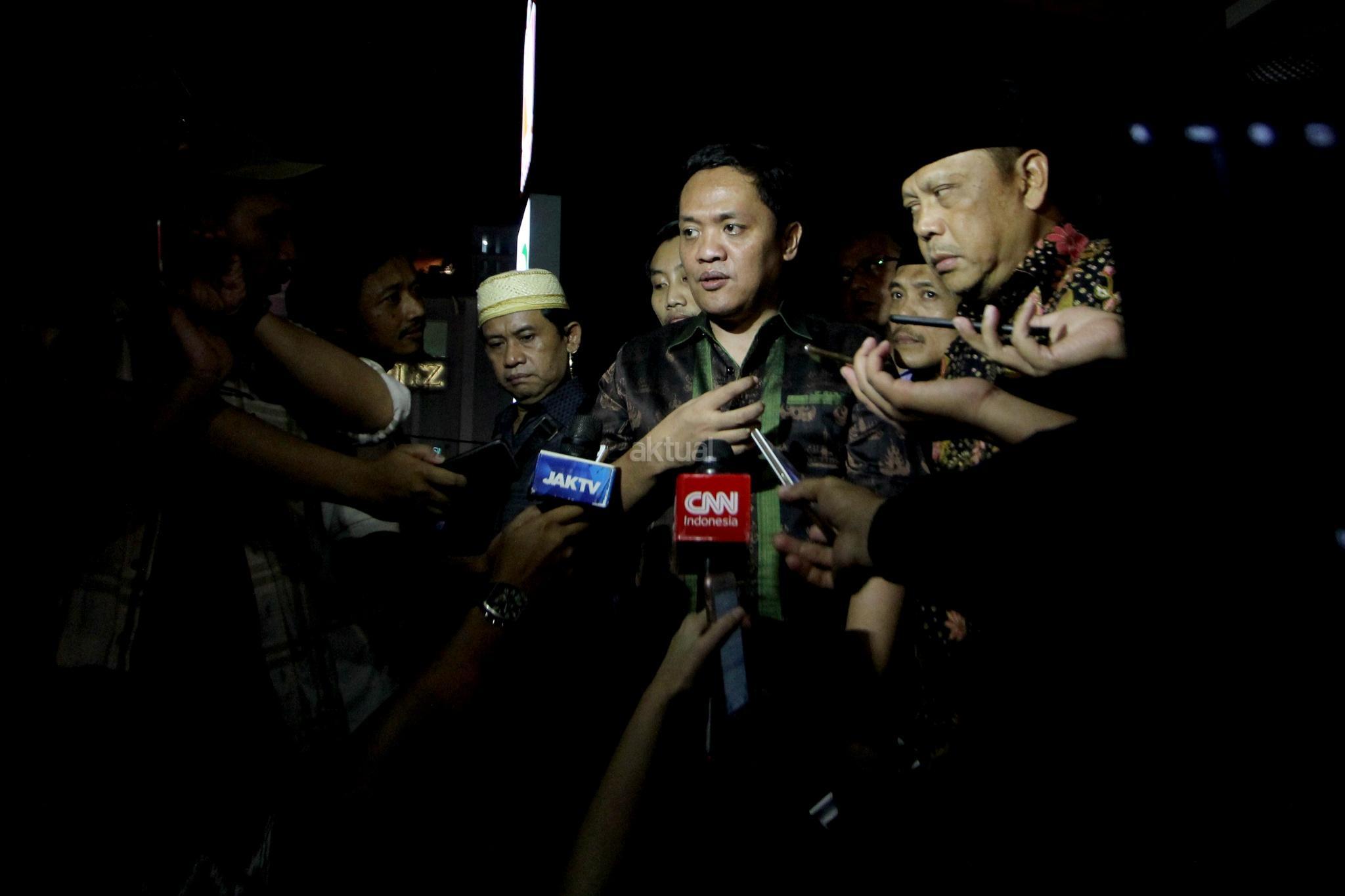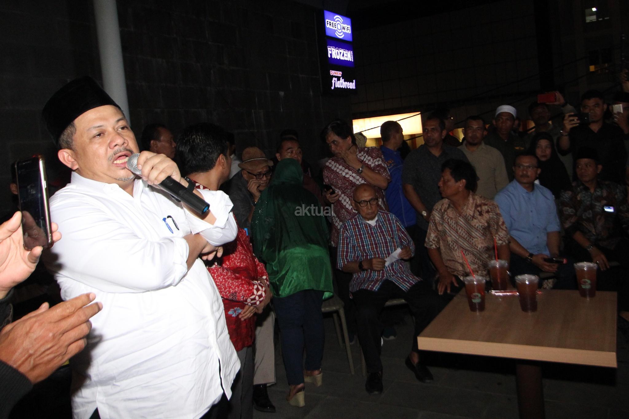 Wakil Ketua DPR RI Fahri Hamzah, membacakan pernyataan sikap saat acara aksi solidaritas untuk Ratna Sarumpaet di Jakarta, Selasa (2/10). Hadir juga Pengacara Eggi Sudjana, Aktivis Hariman Siregar dan Politisi Demokrat Ferdinand Hutahaean bersama sejumlah aktivis untuk memberi dukungan kepada Ratna Sarumpaet dan meminta kepada pemerintah untuk segera menyelesaikan kasus tersebut. AKTUAL/Tino Oktaviano