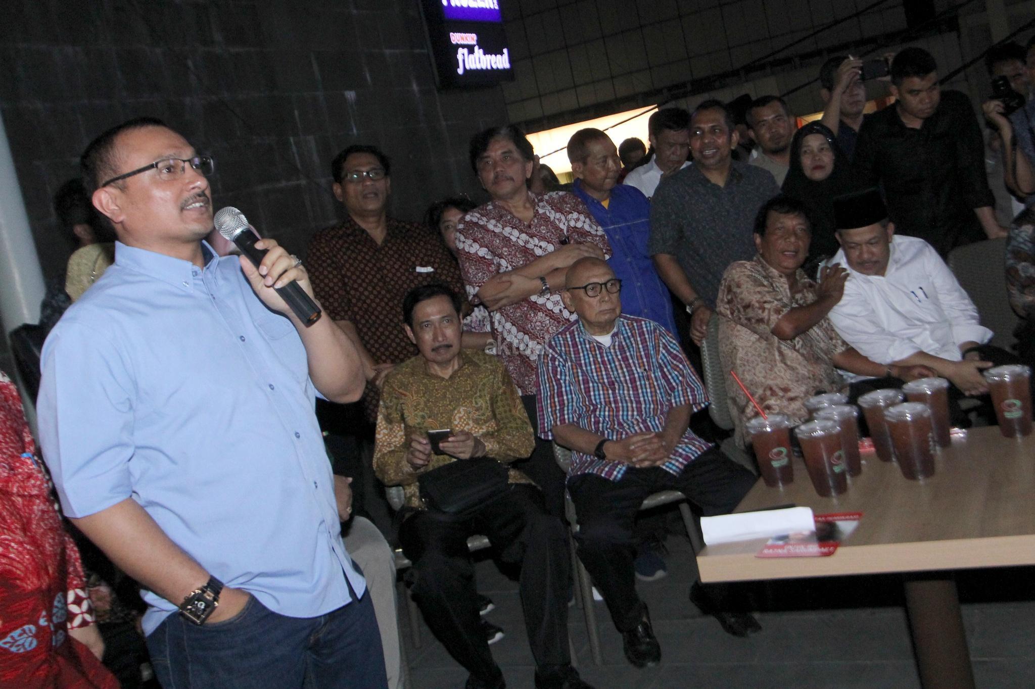 Politisi Demokrat Ferdinand Hutahaean membacakan pernyataan sikap saat acara aksi solidaritas untuk Ratna Sarumpaet di Jakarta, Selasa (2/10). Hadir juga Pengacara Eggi Sudjana, Aktivis Hariman Siregar dan Wakil Ketua DPR RI Fahri Hamzah bersama sejumlah aktivis untuk memberi dukungan kepada Ratna Sarumpaet dan meminta kepada pemerintah untuk segera menyelesaikan kasus tersebut. AKTUAL/Tino Oktaviano