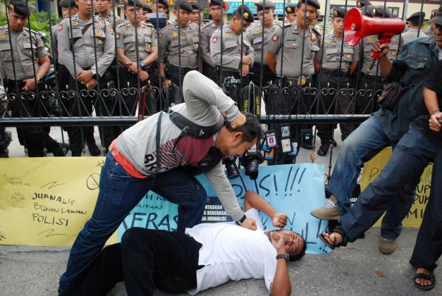 Puluhan wartawan media cetak dan elektronik melakukan aksi teatrikal ketika menggelar aksi solidaritas di depan Mapolda Riau di Pekanbaru, Riau, Senin (7/12). Dalam orasinya wartawan mengecam keras segala tindakan kekerasan terhadap jurnalis, dan meminta kepada Kapolda Riau Brigjen Pol Dolly Bambang Hermawan untuk menindak tegas anggotanya yang melakukan pengeroyokan terhadap seorang jurnalis yang tengah meliput kerusuhan Kongres HMI XXIX di Pekanbaru pada Sabtu (5/12) kemarin. ANTARA FOTO/Rony Muharrman/pd/15