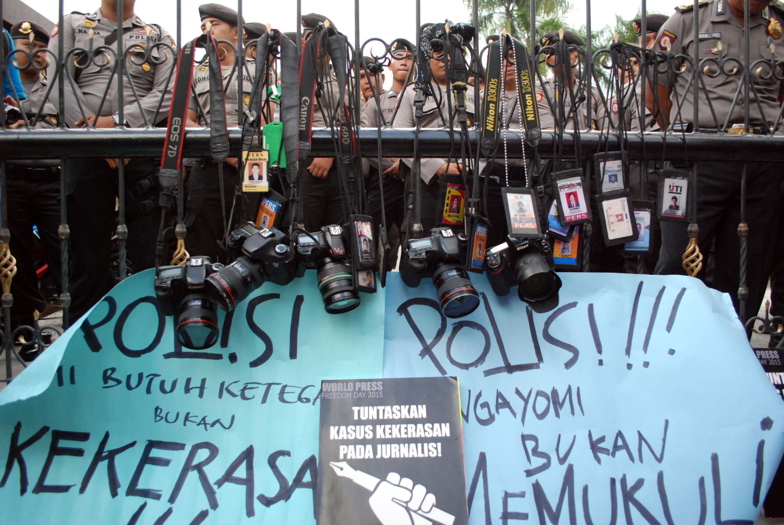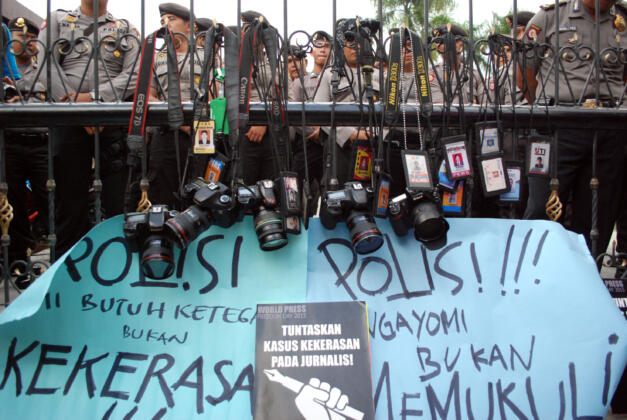 Puluhan wartawan media cetak dan elektronik menggantungkan alat dan atribut peliputan ketika menggelar aksi solidaritas di depan Mapolda Riau di Pekanbaru, Riau, Senin (7/12). Dalam orasinya wartawan mengecam keras segala tindakan kekerasan terhadap jurnalis, dan meminta kepada Kapolda Riau Brigjen Pol Dolly Bambang Hermawan untuk menindak tegas anggotanya yang melakukan pengeroyokan terhadap seorang jurnalis yang tengah meliput kerusuhan Kongres HMI XXIX di Pekanbaru pada Sabtu (5/12) kemarin. ANTARA FOTO/Rony Muharrman/pd/15