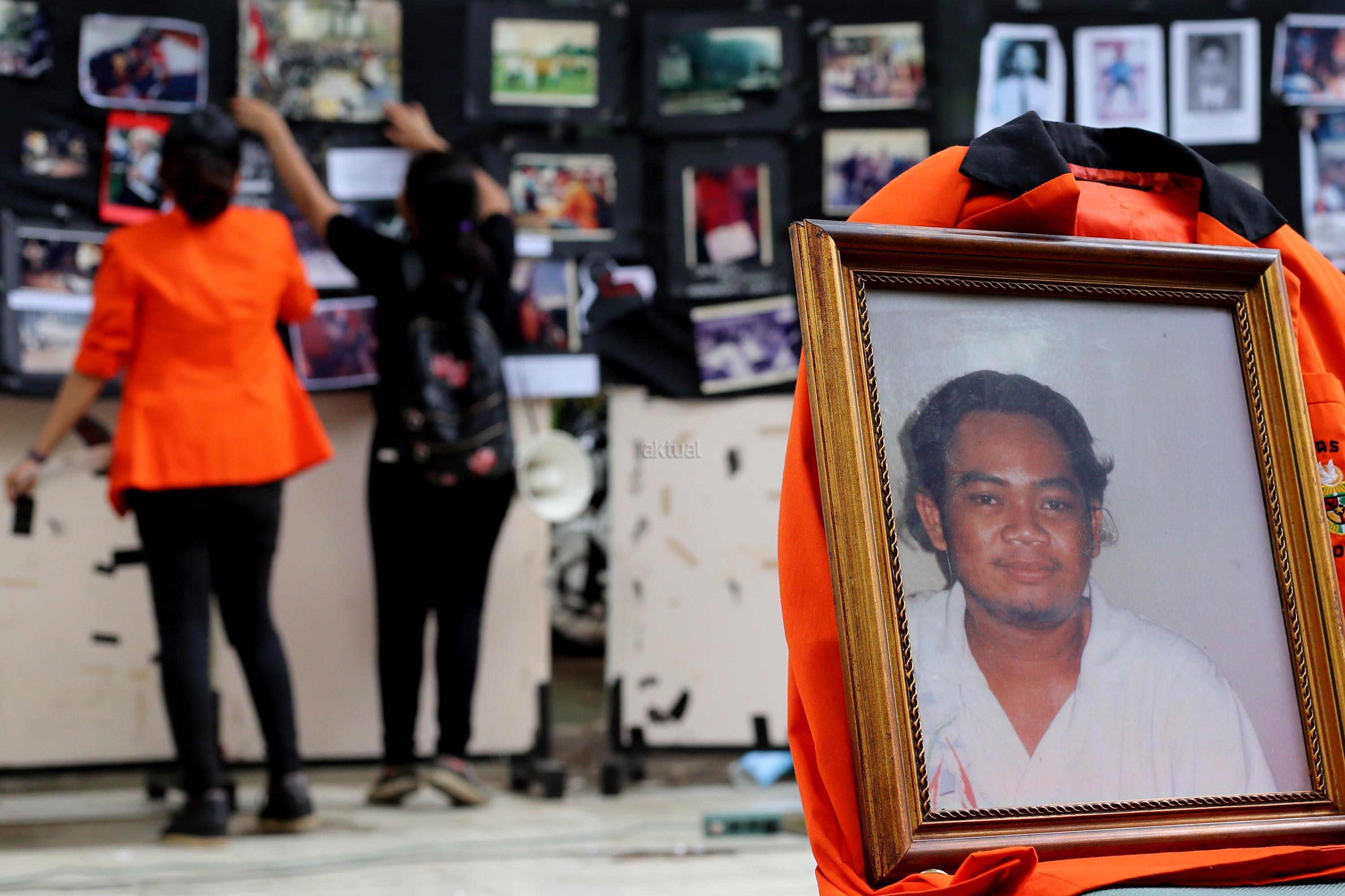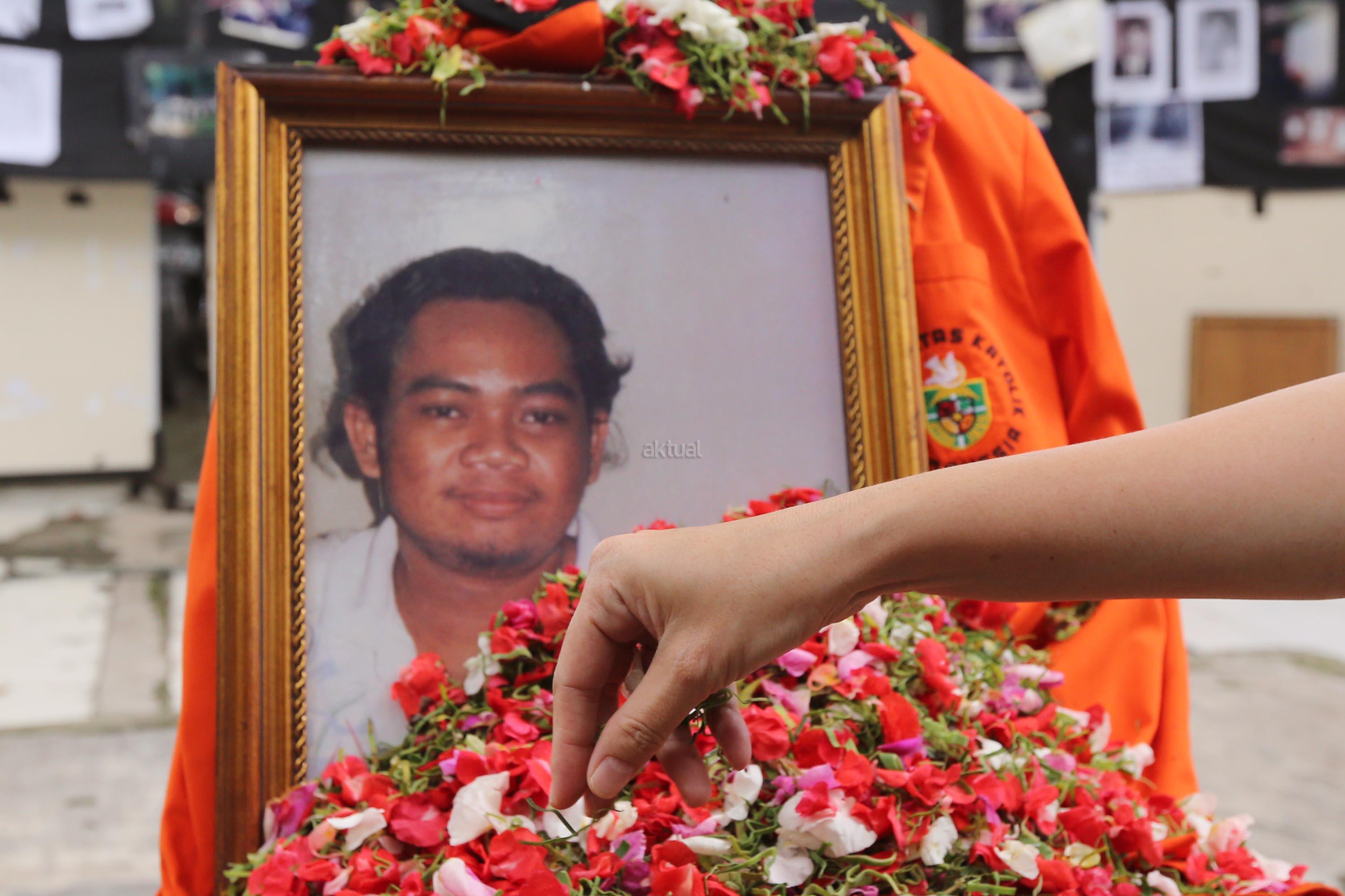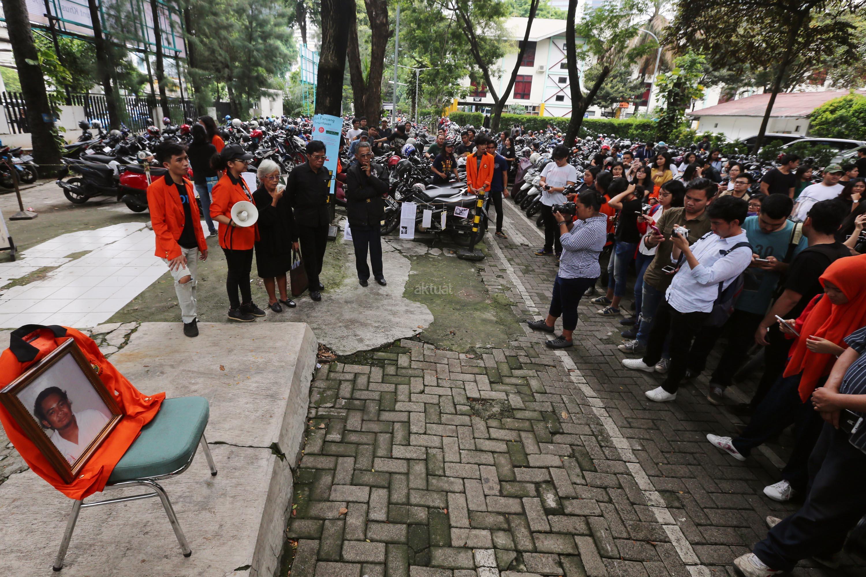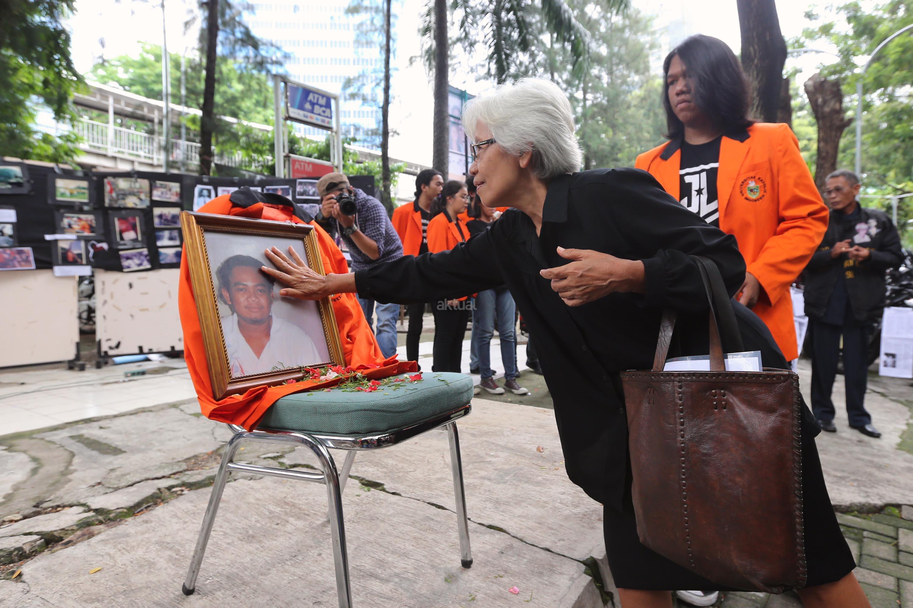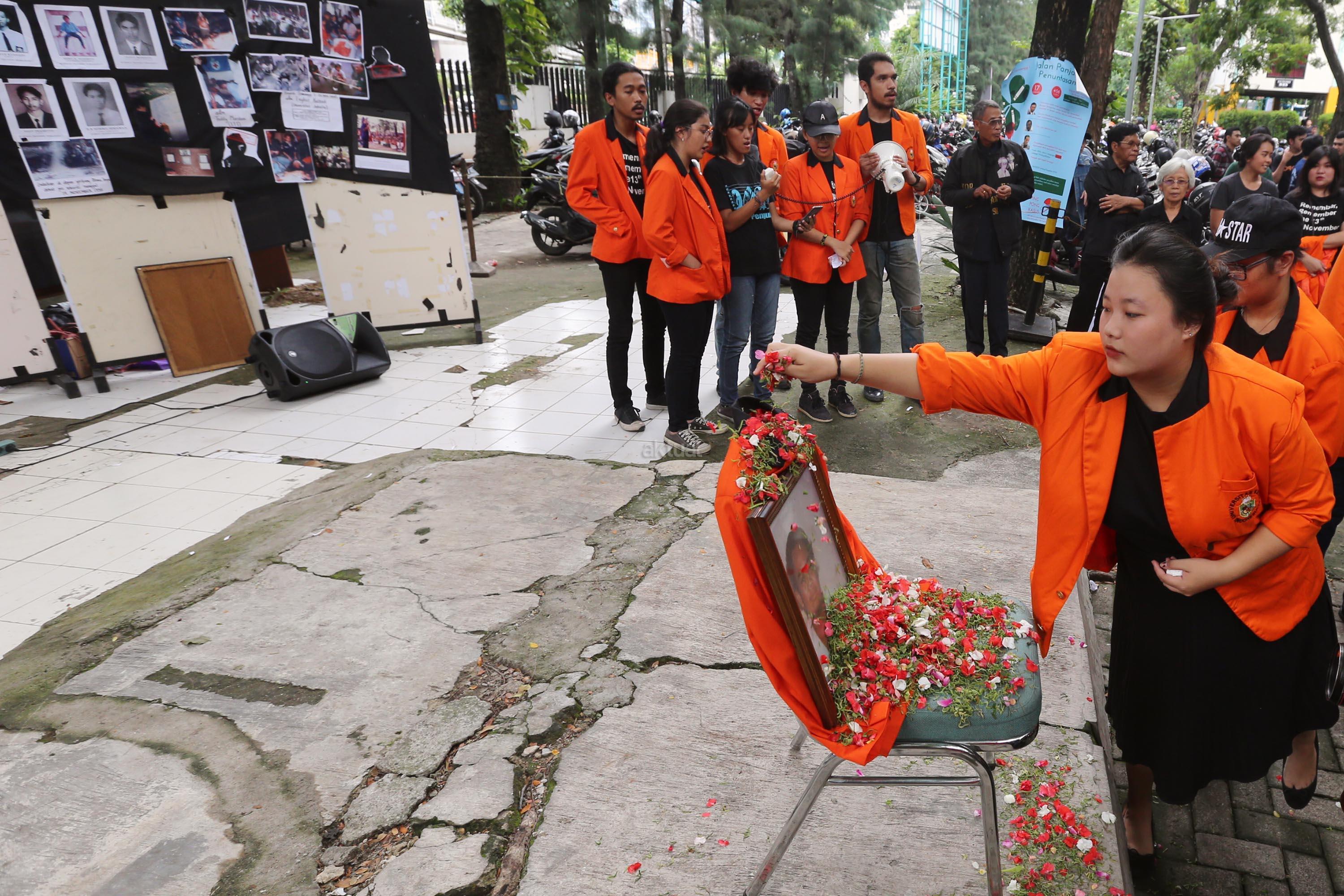Mahasiswa dan keluarga korban menaburkan bunga ke foto korban tragedi Semanggi saat aksi memperingati tragedi Semanggi di depan kampus Universitas Atmajaya, Jakarta, Senin (13/11/2017). Dalam aksi yang digelar untuk mengenang tragedi Semanggi pada masa reformasi ini, mahasiswa dan keluarga korban meminta pihak berwenang tetap mengusut tuntas tragedi tersebut. AKTUAL/Munzir