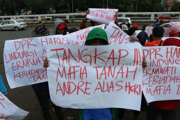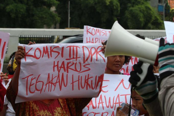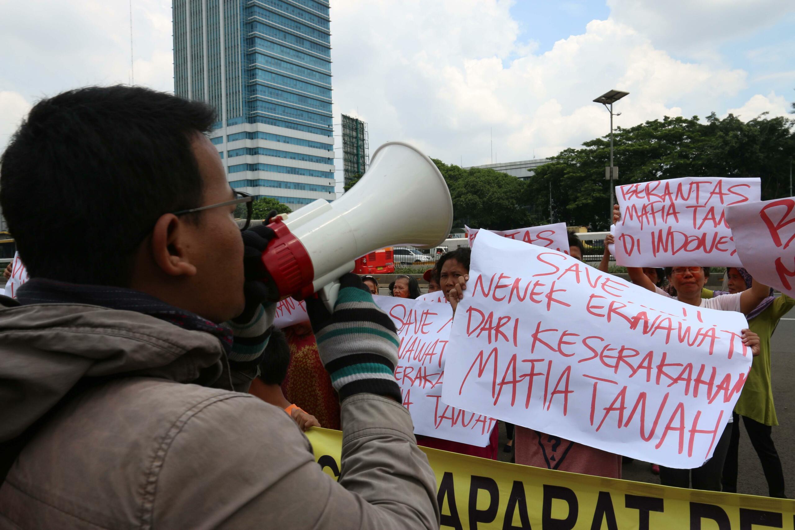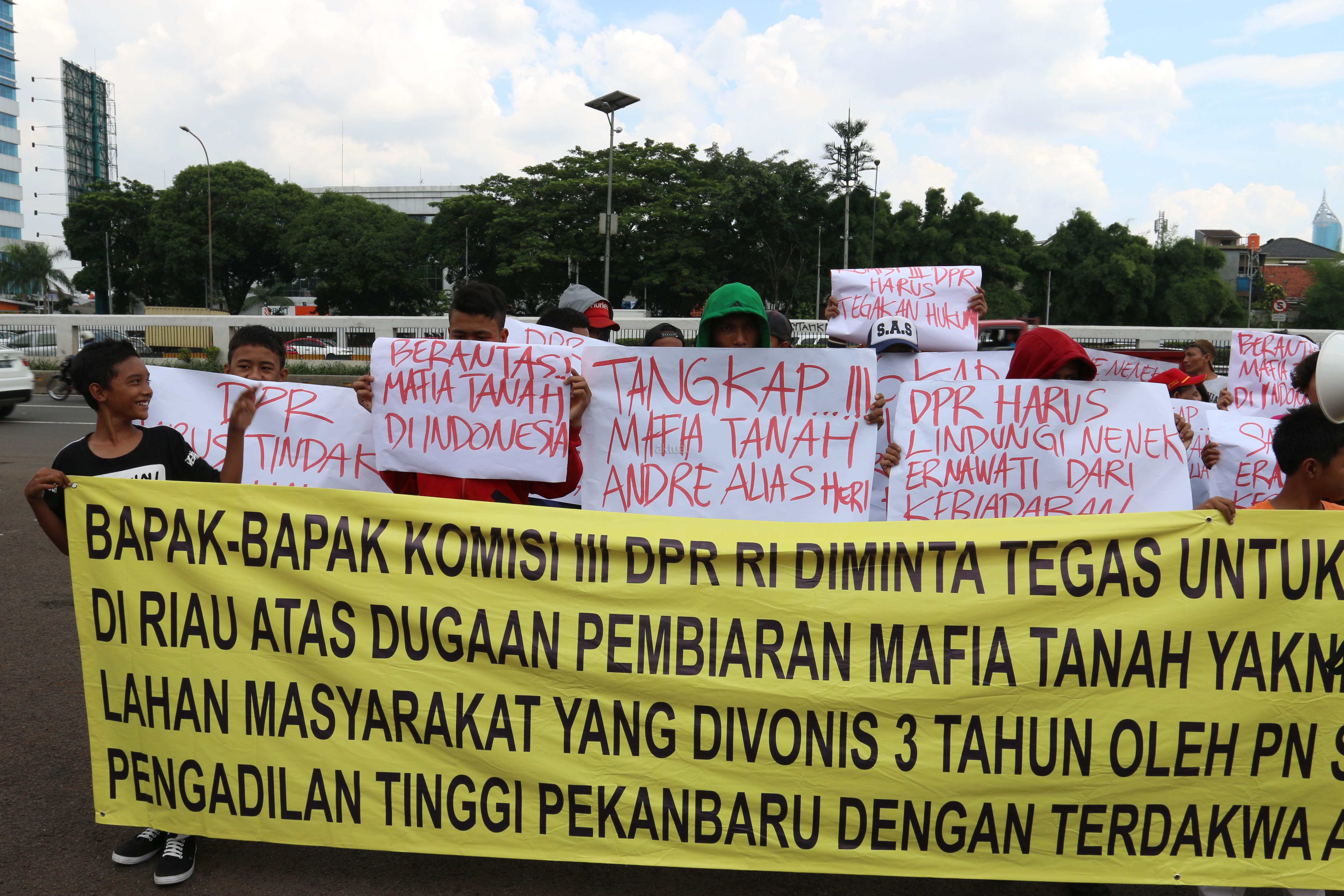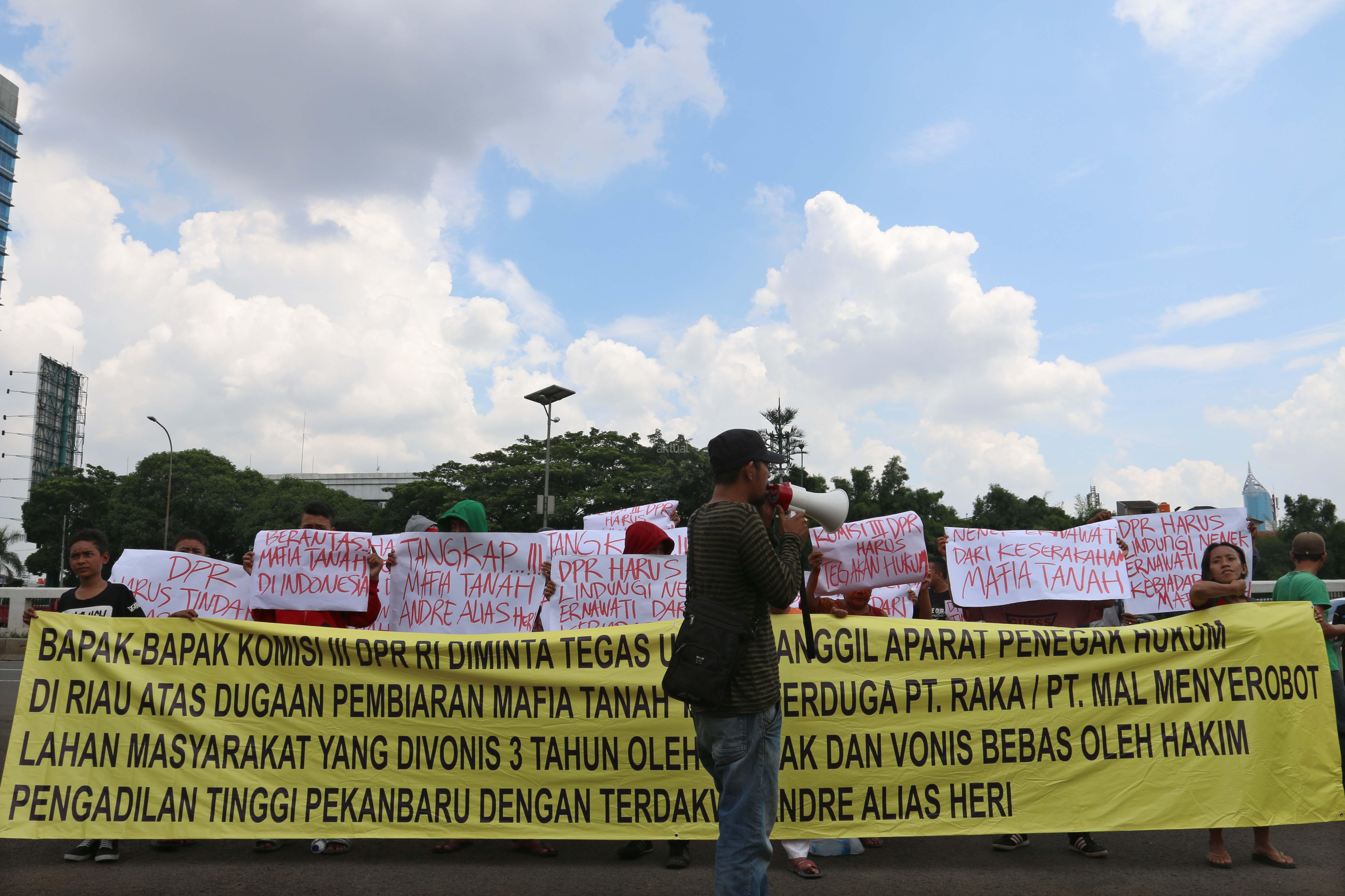 Massa aksi dari Aliansi Peduli Penegakan Hukum (AMPUH) melakukan aksi unjuk rasa dengan membawa spanduk bertuliskan "Save Nenek Ernawati" di Komplek Parlemen Senayan, Jakarta, Kamis (14/1/2016). Massa menuntut proses hukum penyelesaian kasus mafia tanah di Pekanbaru kepada Komisi III DPR atas kasus Nenek Ernawati.