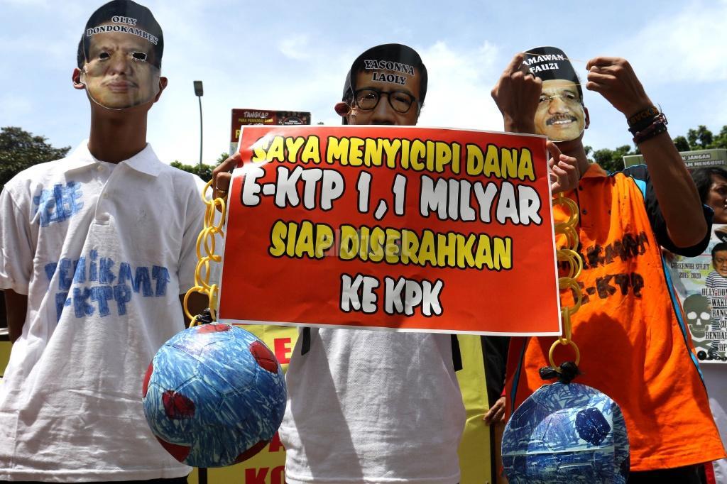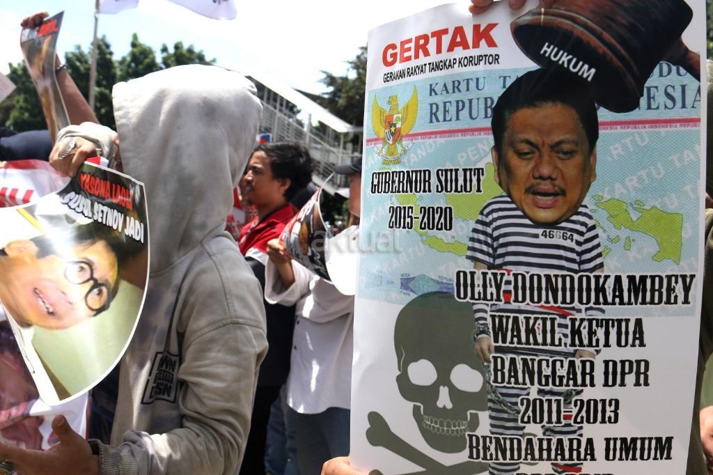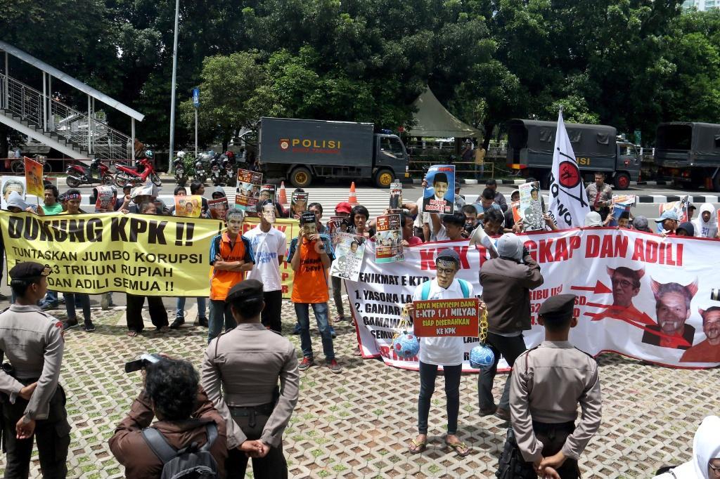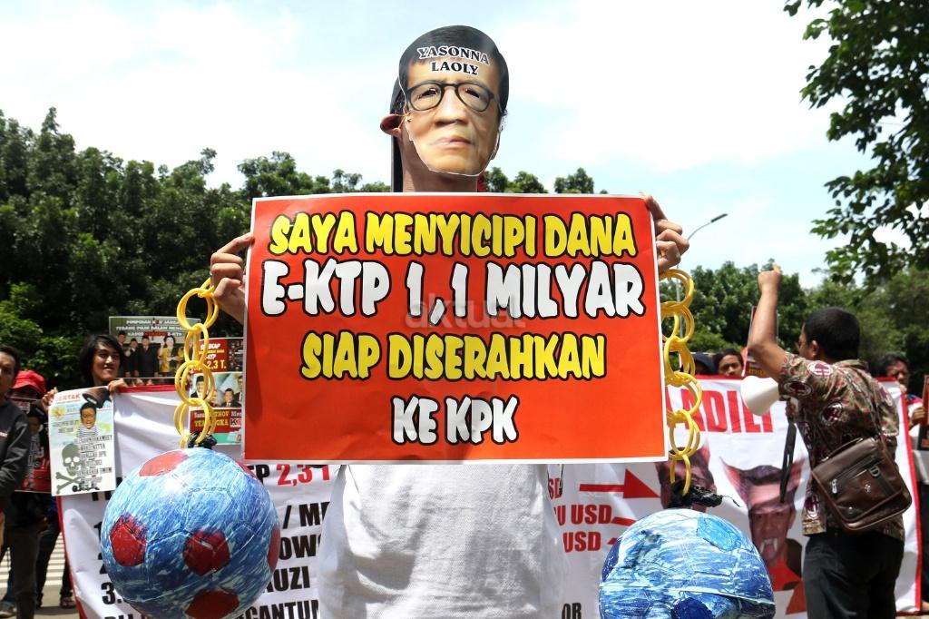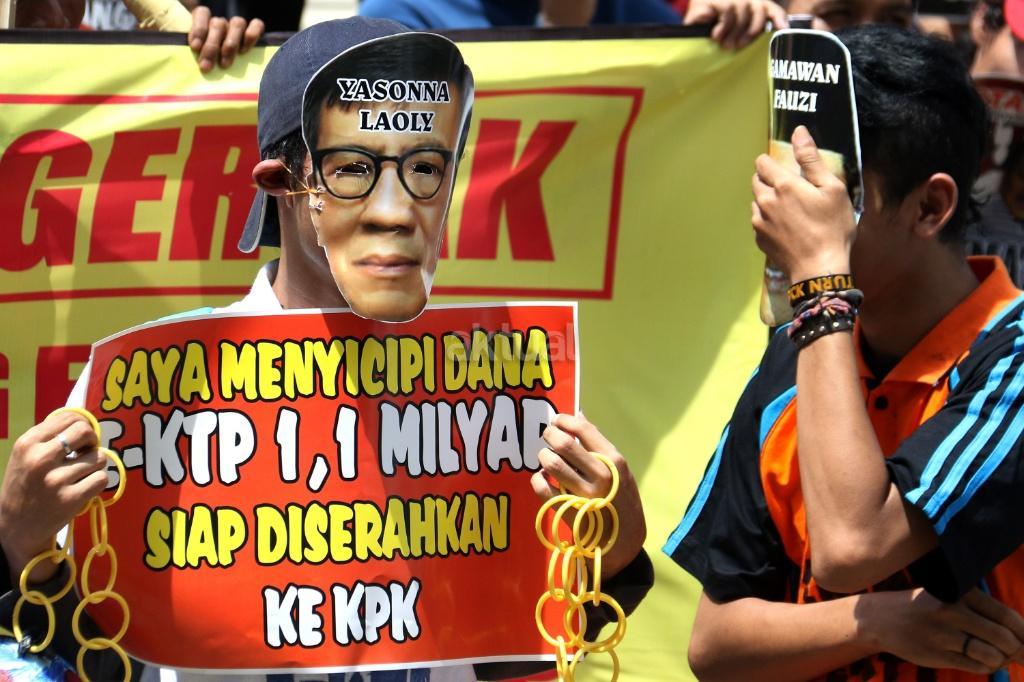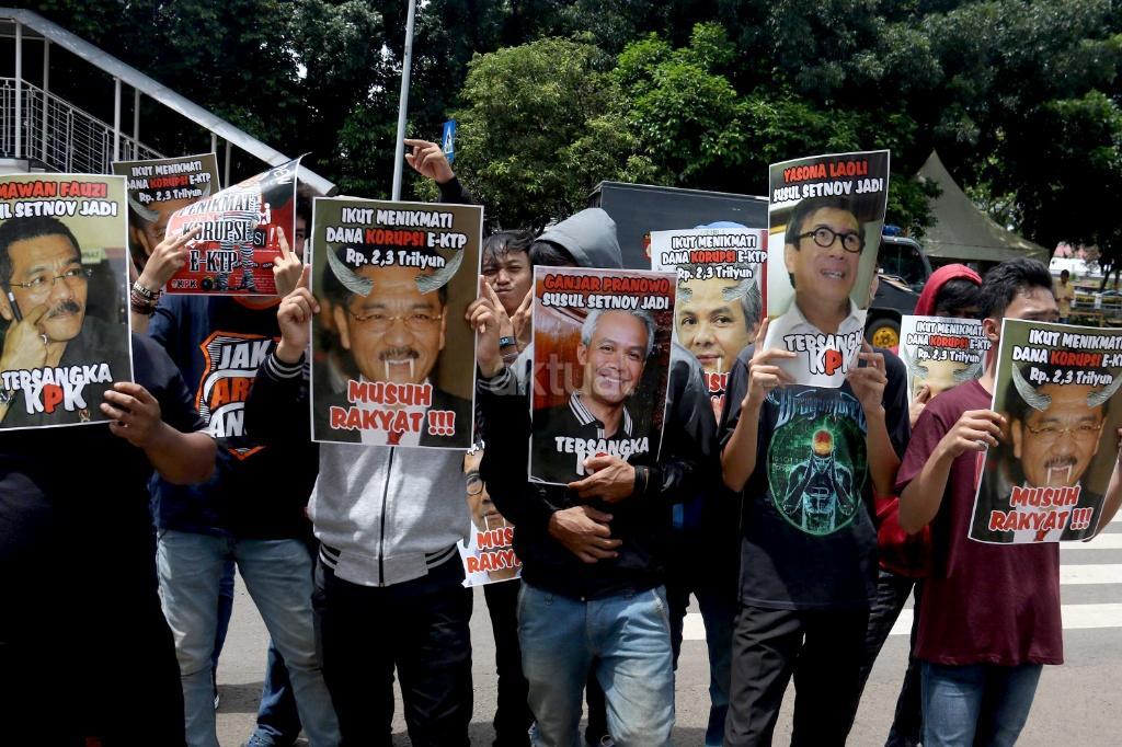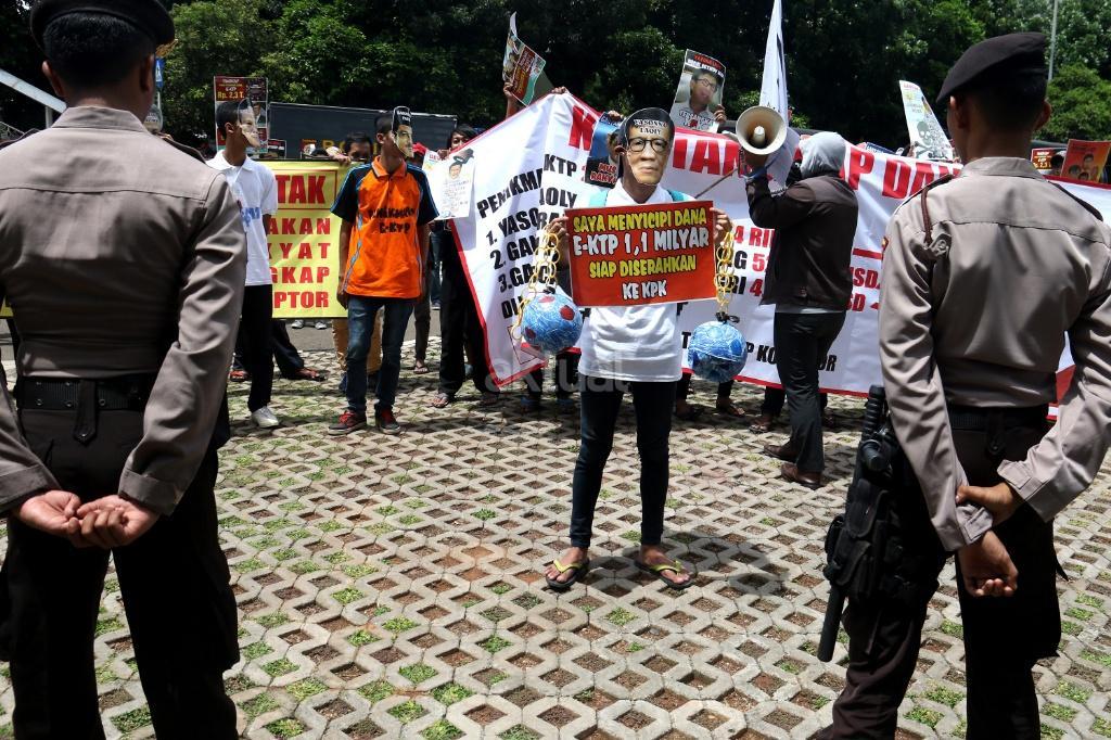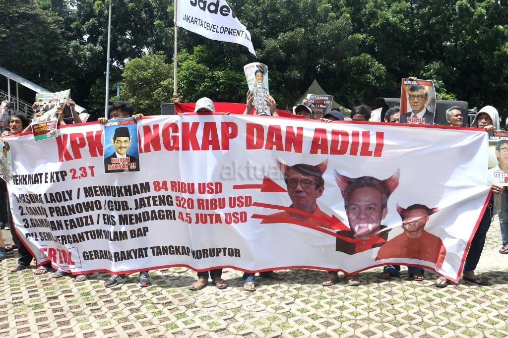 Ratusan massa dari Gerakan Rakyat Tangkap Koruptor (GERTAK) melakukan aksi didepan gedung KPK, Jakarta, Jumat (24/11/2017). Dalam aksinya Gerakan Rakyat Tangkap Koruptor (GERTAK) mendesak KPK untuk menangkap Menkumham Yasona Laoly, dan segera menuntuskan Gamawan Fauzi, Ganjar Pranowo, Melchias Markus Mekeng, Bendung PDIP Olly Dondokambey karena diduga menerima dana korupsi E- KTP. AKTUAL/Munzir