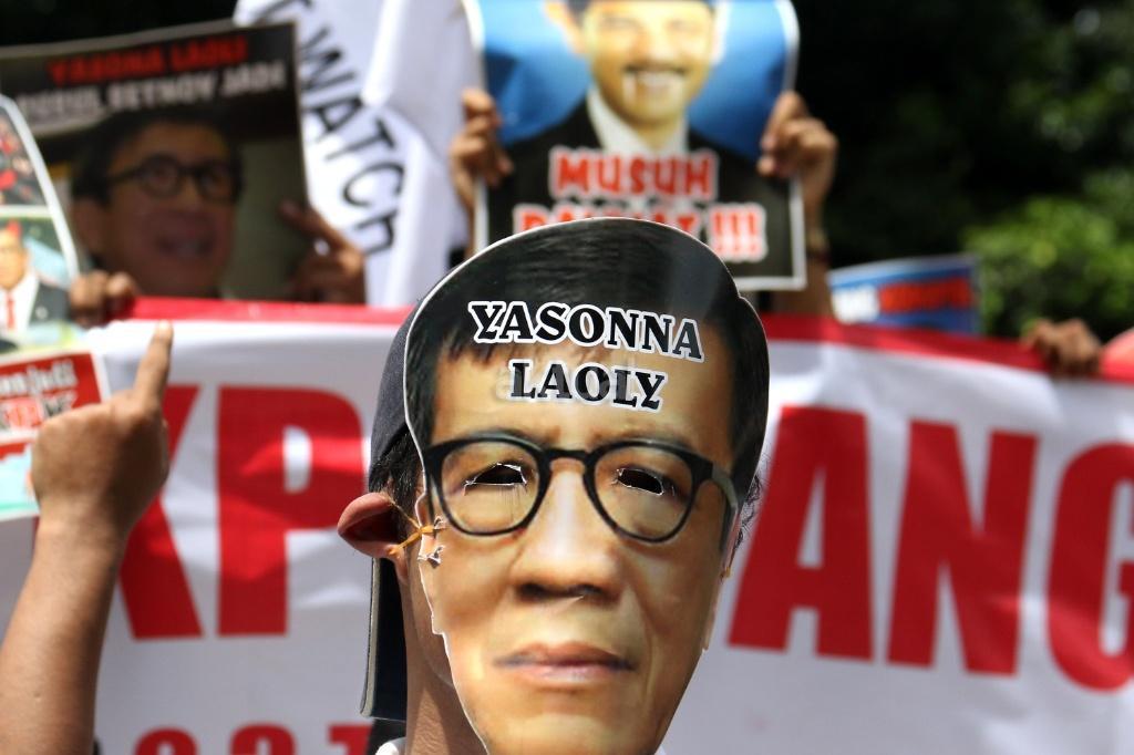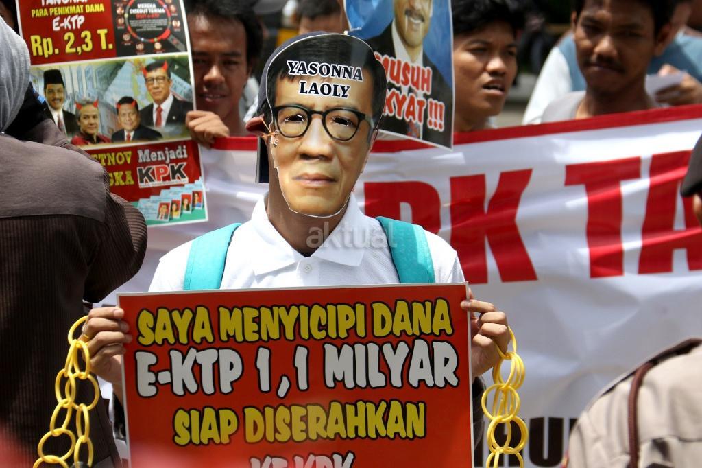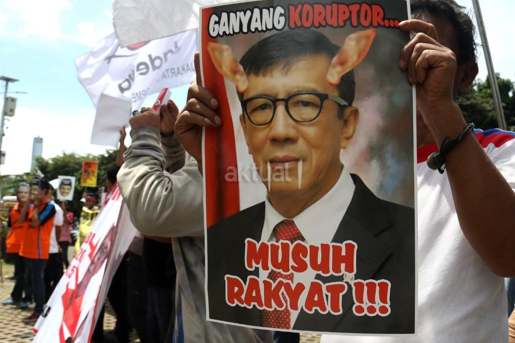 Ratusan massa dari Gerakan Rakyat Tangkap Koruptor (GERTAK) melakukan aksi didepan gedung KPK, Jakarta, Jumat (24/11/2017). Dalam aksinya Gerakan Rakyat Tangkap Koruptor (GERTAK) mendesak KPK untuk menangkap Menkumham Yasona Laoly, karena dalam sidang tuntutan terhadap terdakwa Irman dan Sugiharto (22/6/2017) menyebut Yasona Laoly sebagai anggota DPR FDIP menerima 84 ribu USD Rp.1.1 Miliar. AKTUAL/Munzir