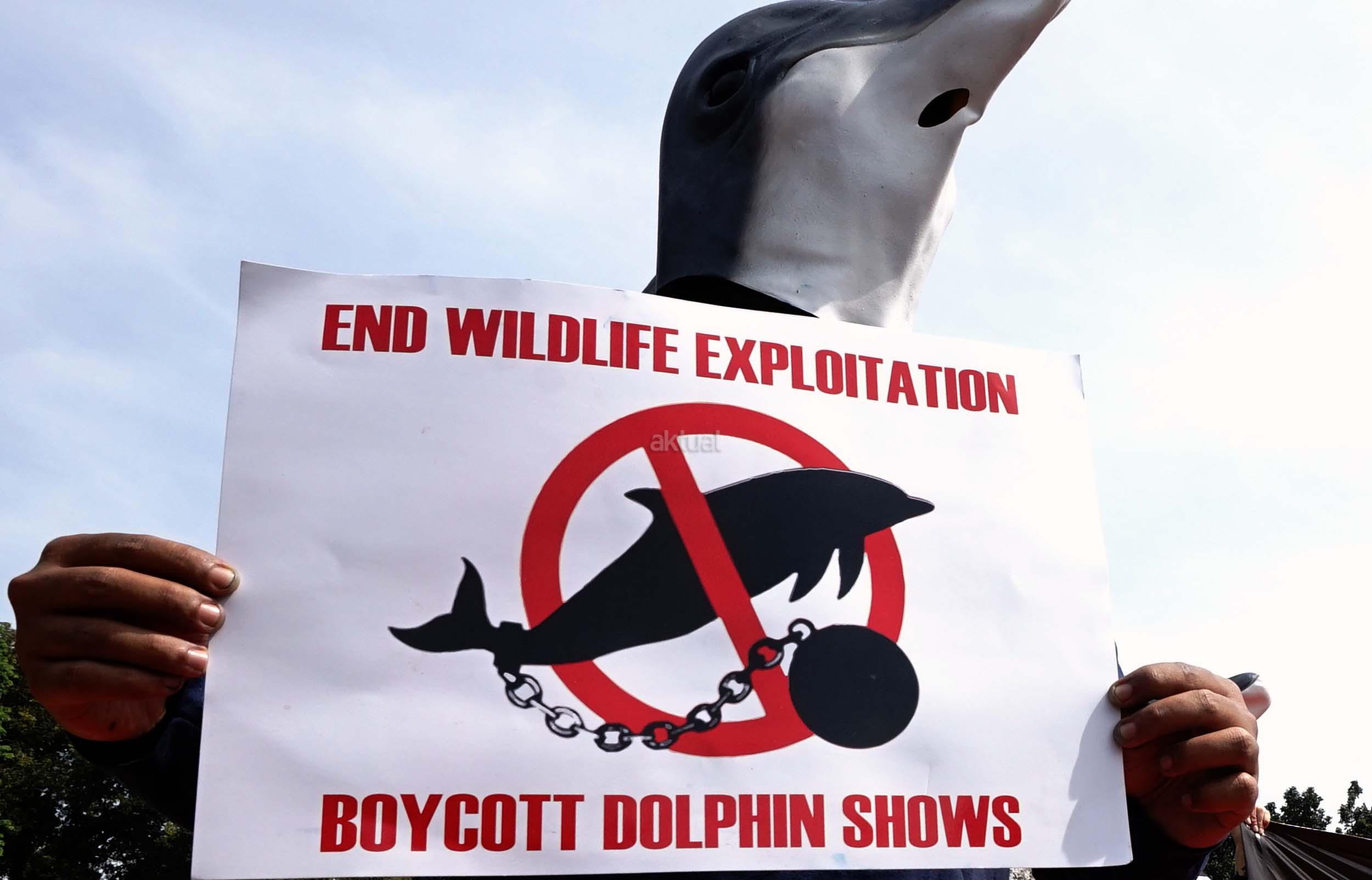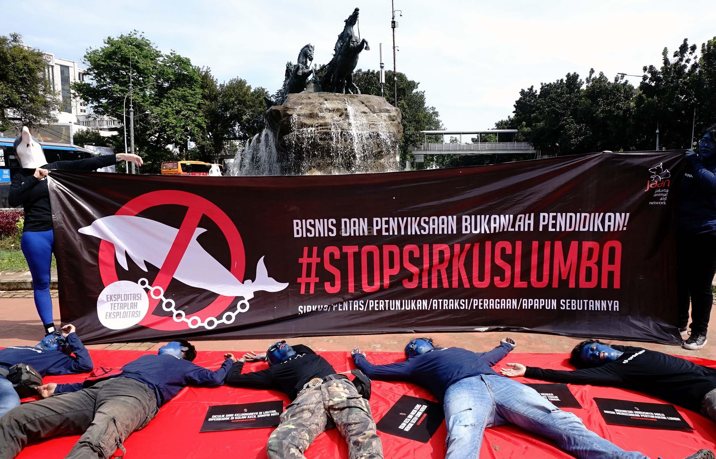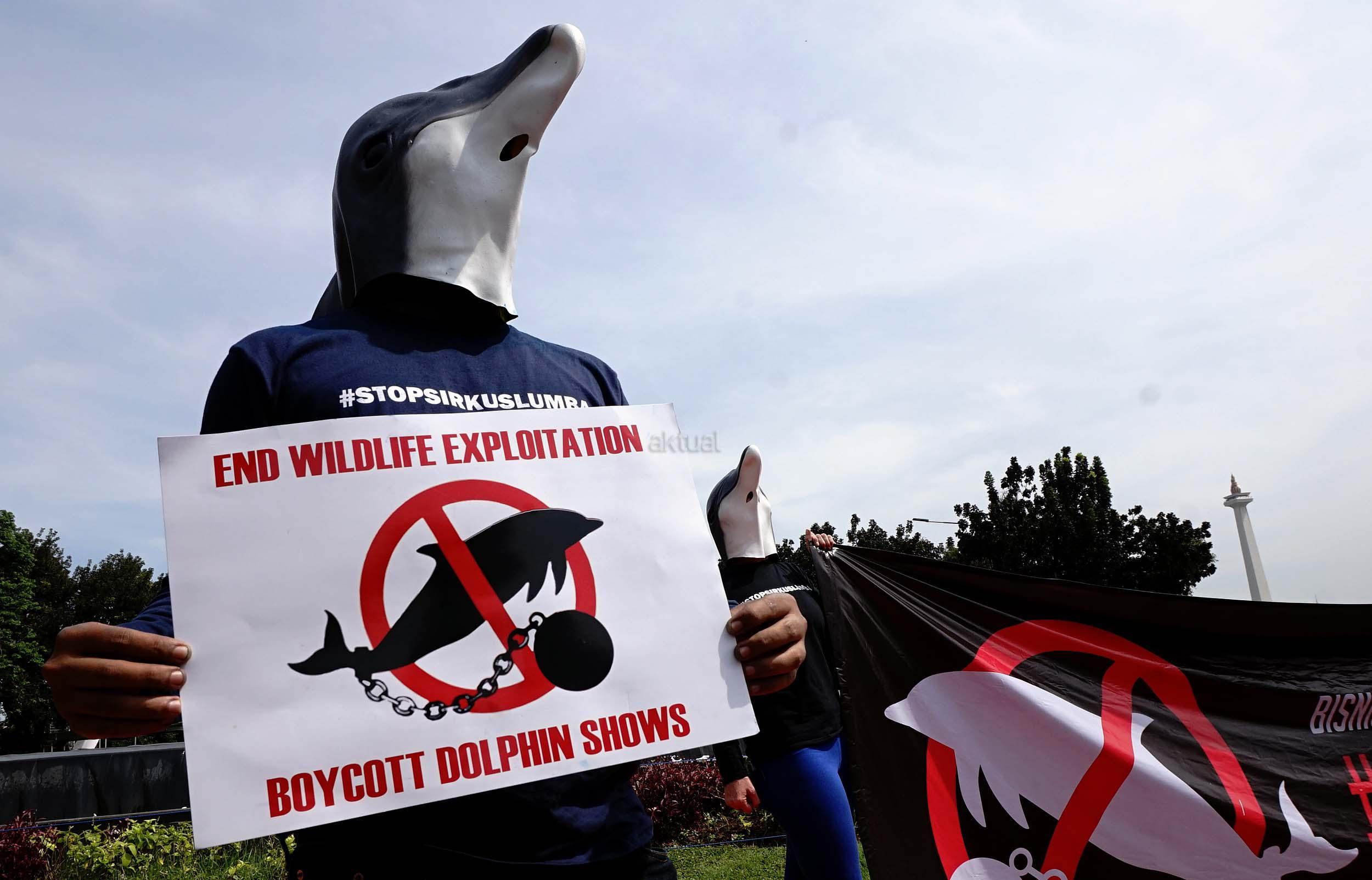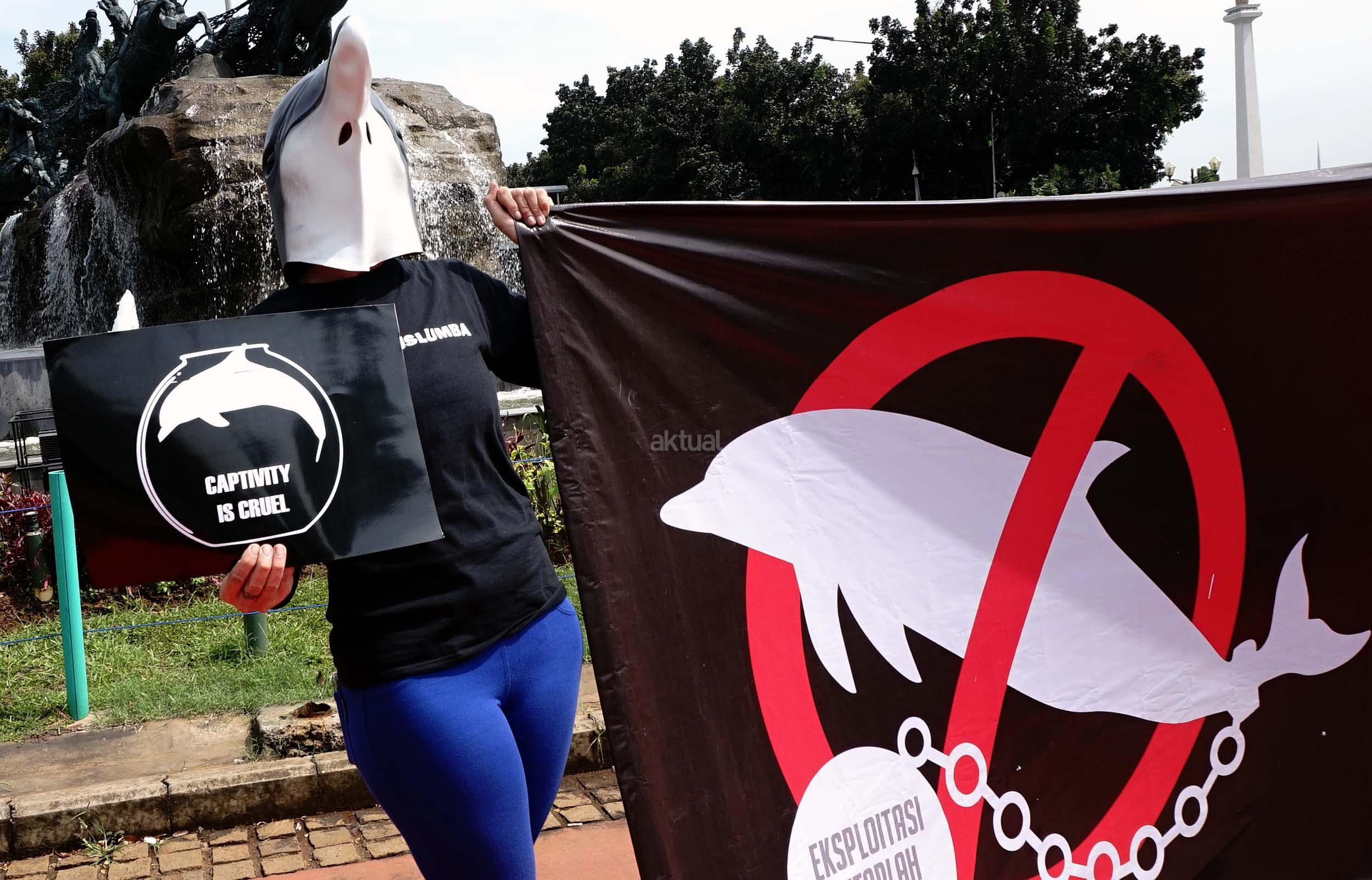 Sejumlah aktivis Jakarta Animal Aid Network (JAAN) melakukan aksi unjuk rasa menolak eksploitasi hewan lumba-lumba di Jakarta, Senin (31/10/2016). Dalam aksinya aktivis JAAN menilai pentas satwa lumba-lumba tidak menyampaikan pesan edukasi dan tidak menghargai .