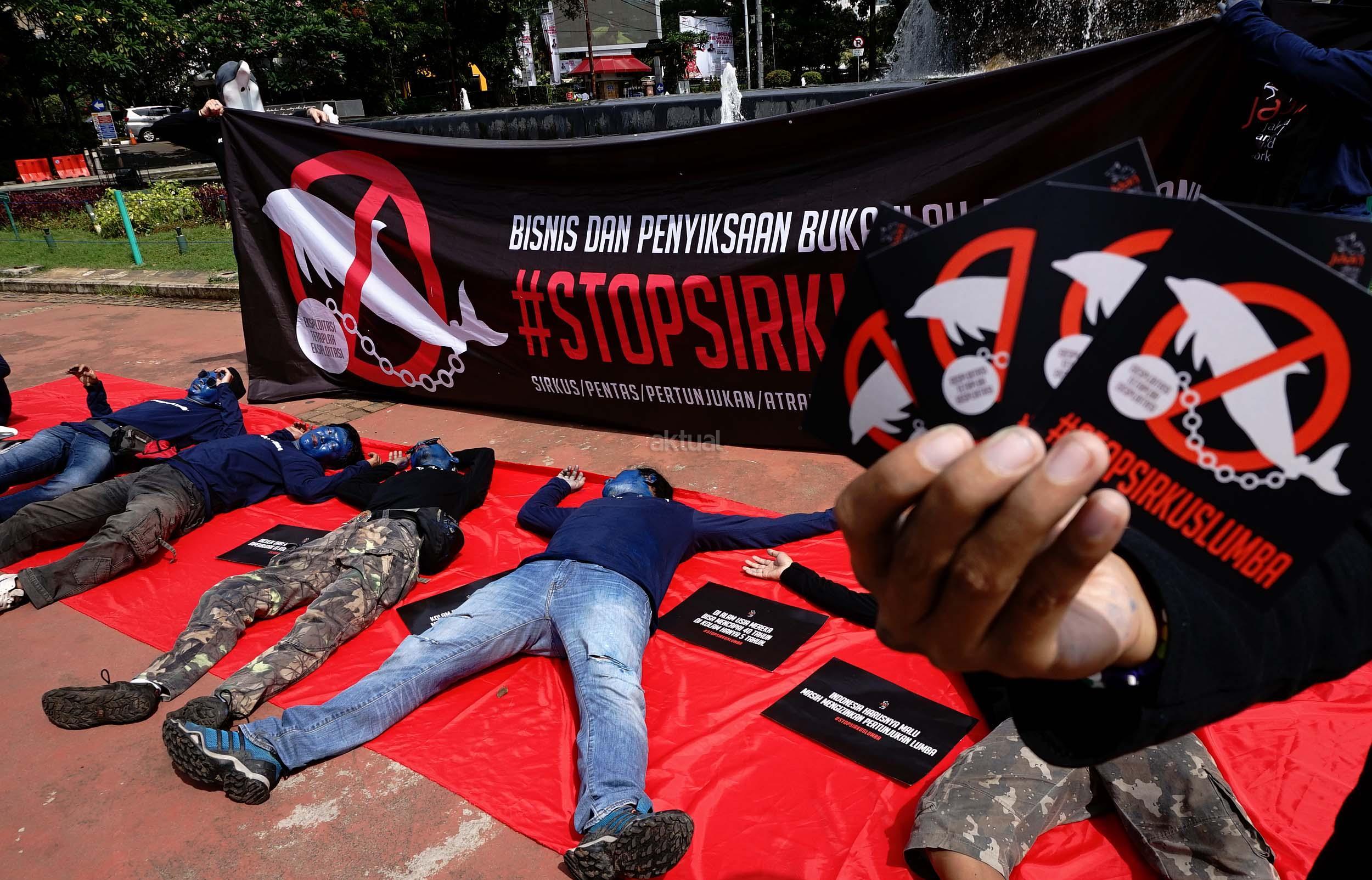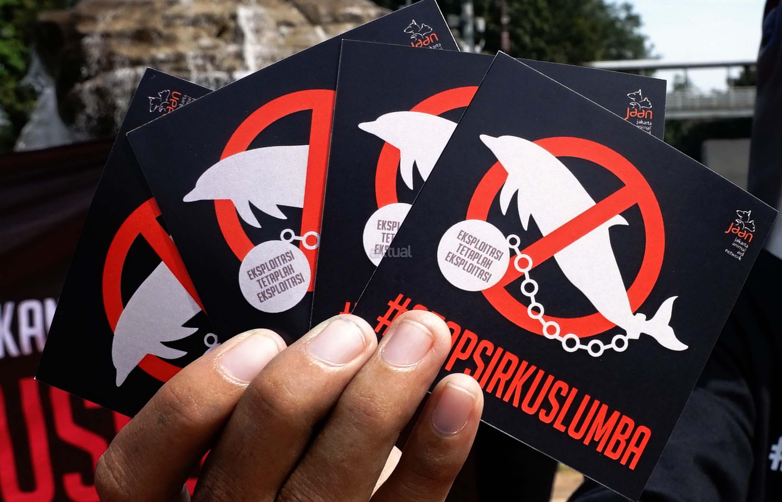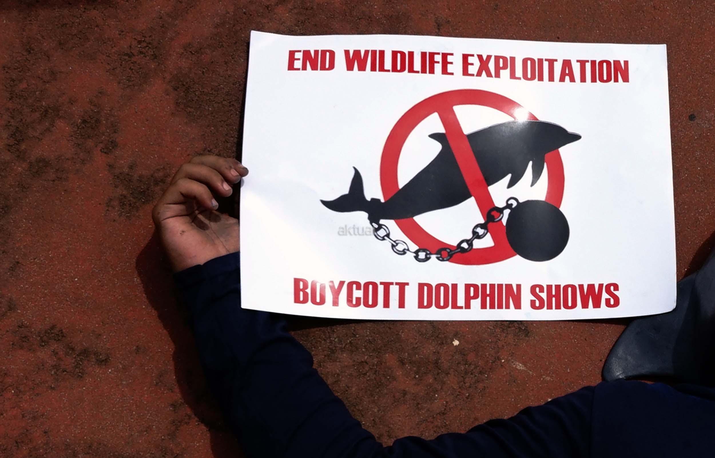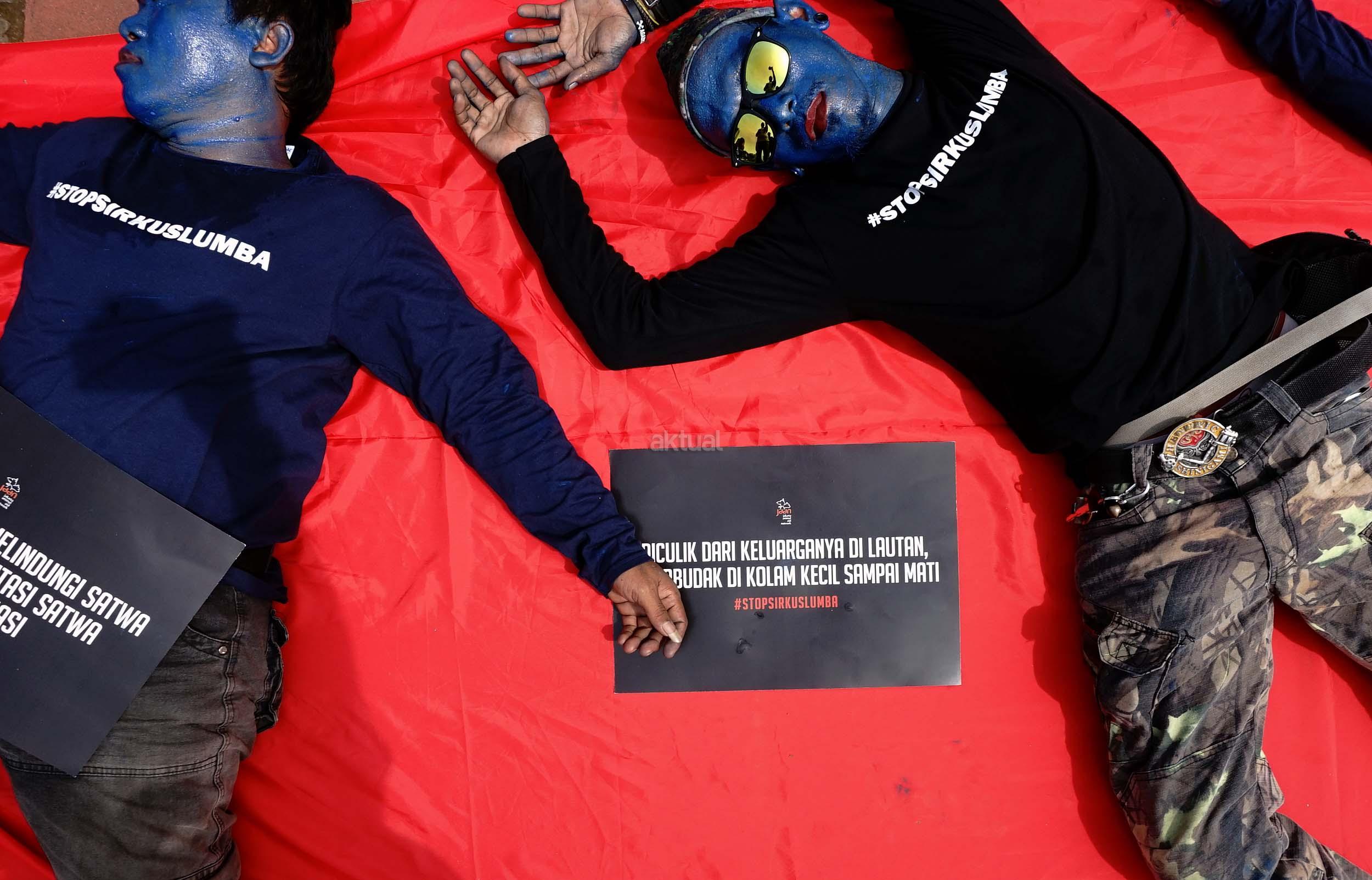 Sejumlah aktivis Jakarta Animal Aid Network (JAAN) melakukan aksi unjuk rasa menolak eksploitasi hewan lumba-lumba di Jakarta, Senin (31/10/2016). Dalam aksinya aktivis JAAN menilai pentas satwa lumba-lumba tidak menyampaikan pesan edukasi dan tidak menghargai .
