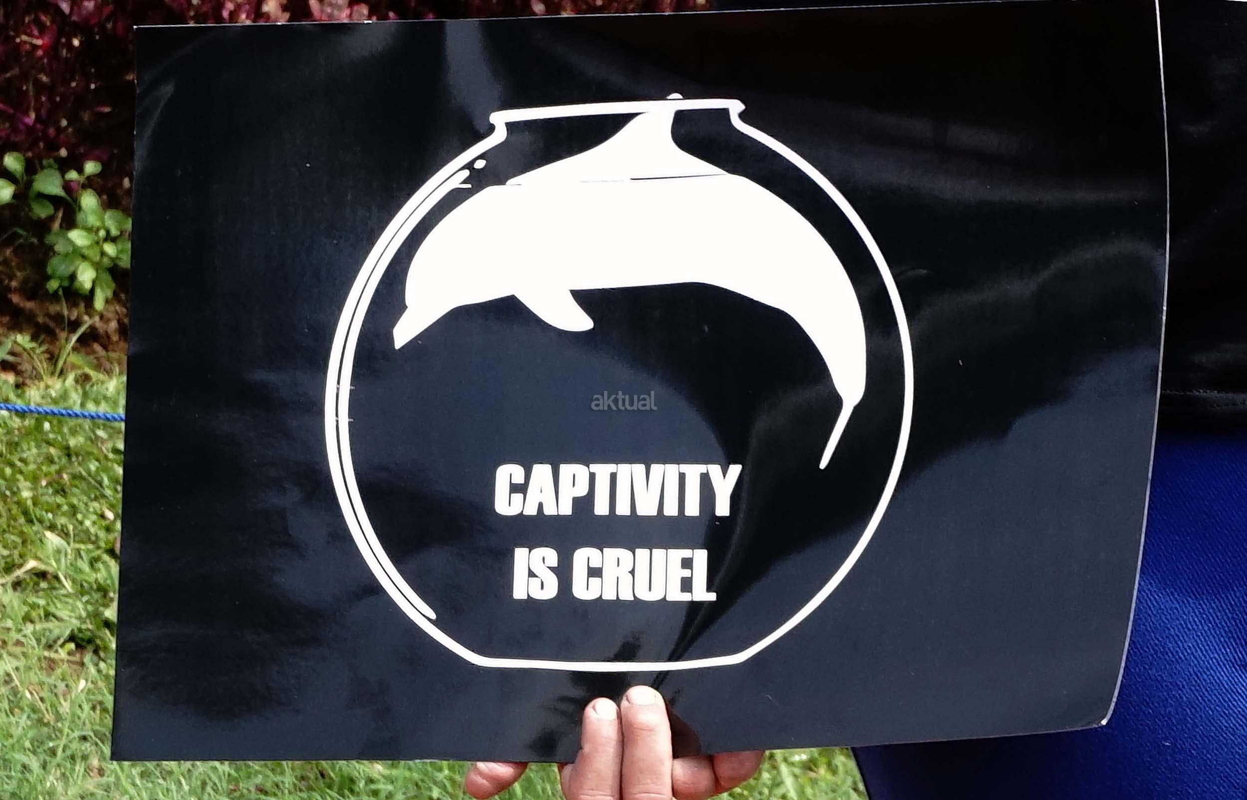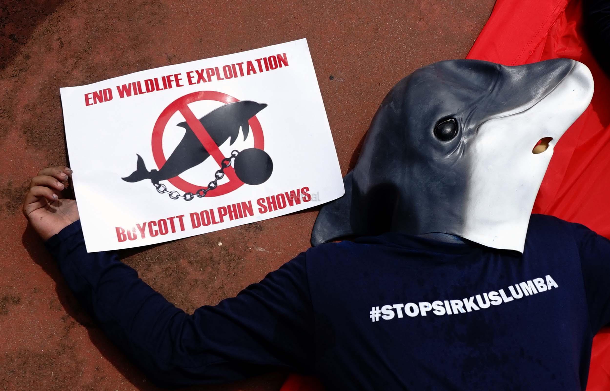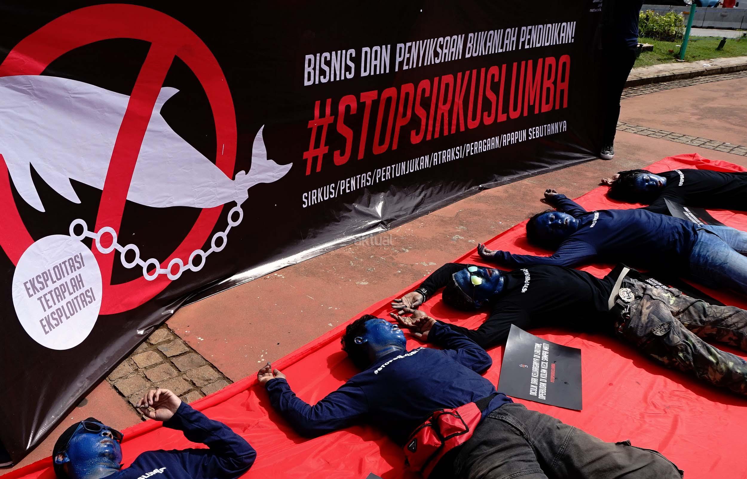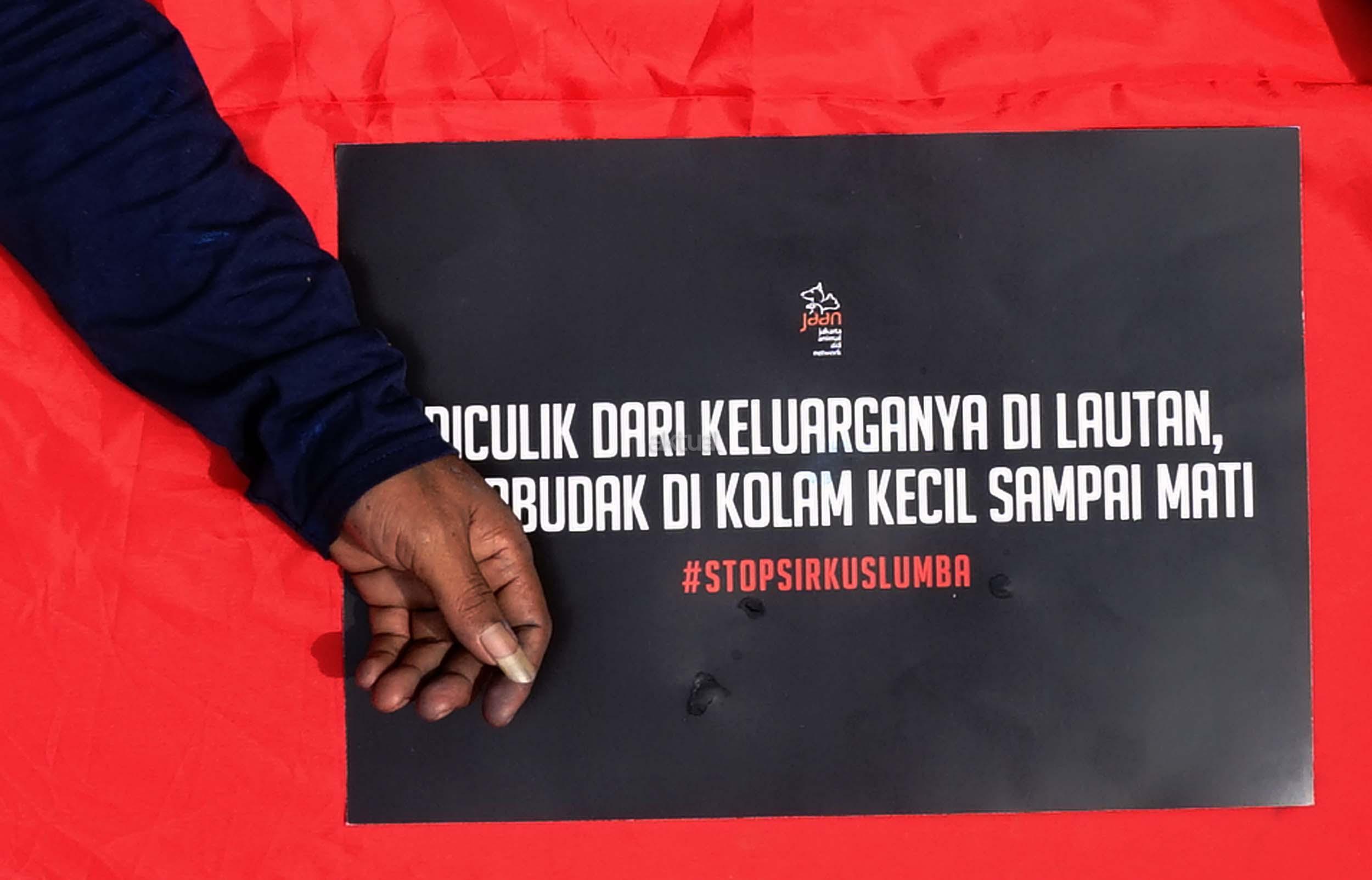 Sejumlah aktivis Jakarta Animal Aid Network (JAAN) melakukan aksi unjuk rasa menolak eksploitasi hewan lumba-lumba di Jakarta, Senin (31/10/2016). Dalam aksinya aktivis JAAN menilai pentas satwa lumba-lumba tidak menyampaikan pesan edukasi dan tidak menghargai .