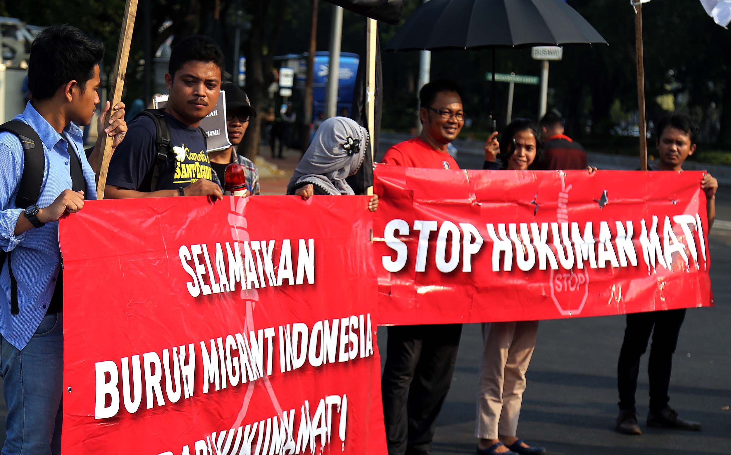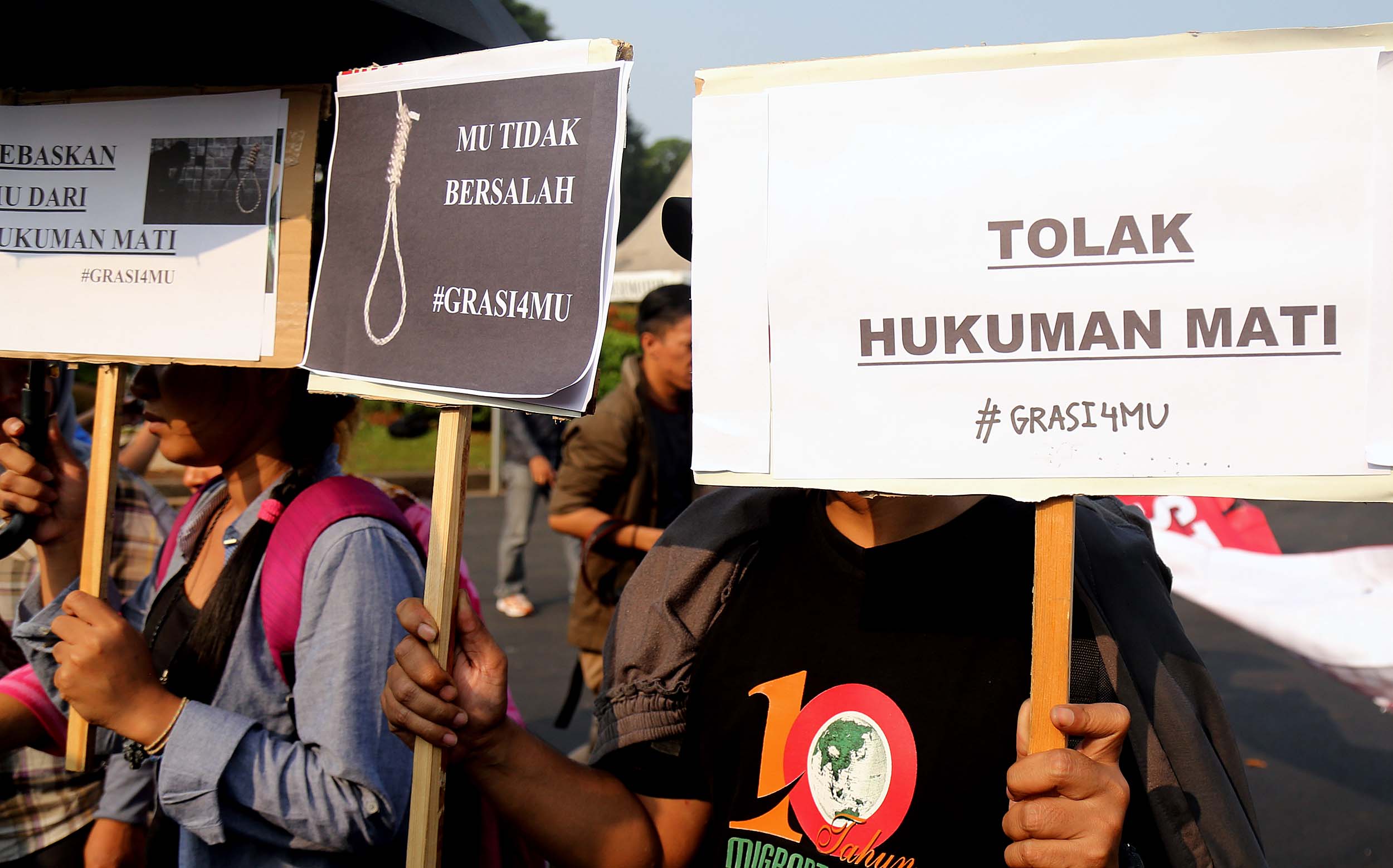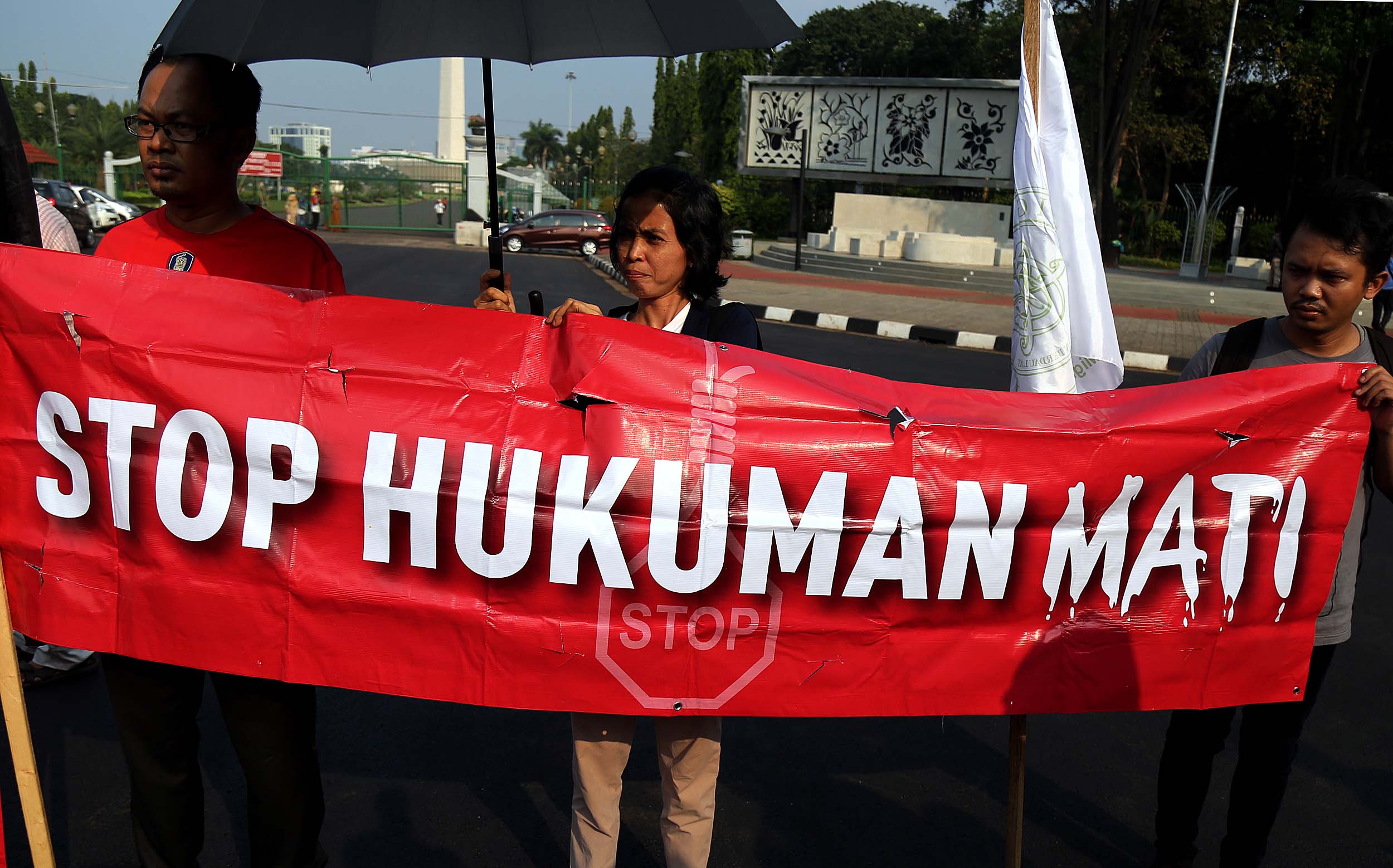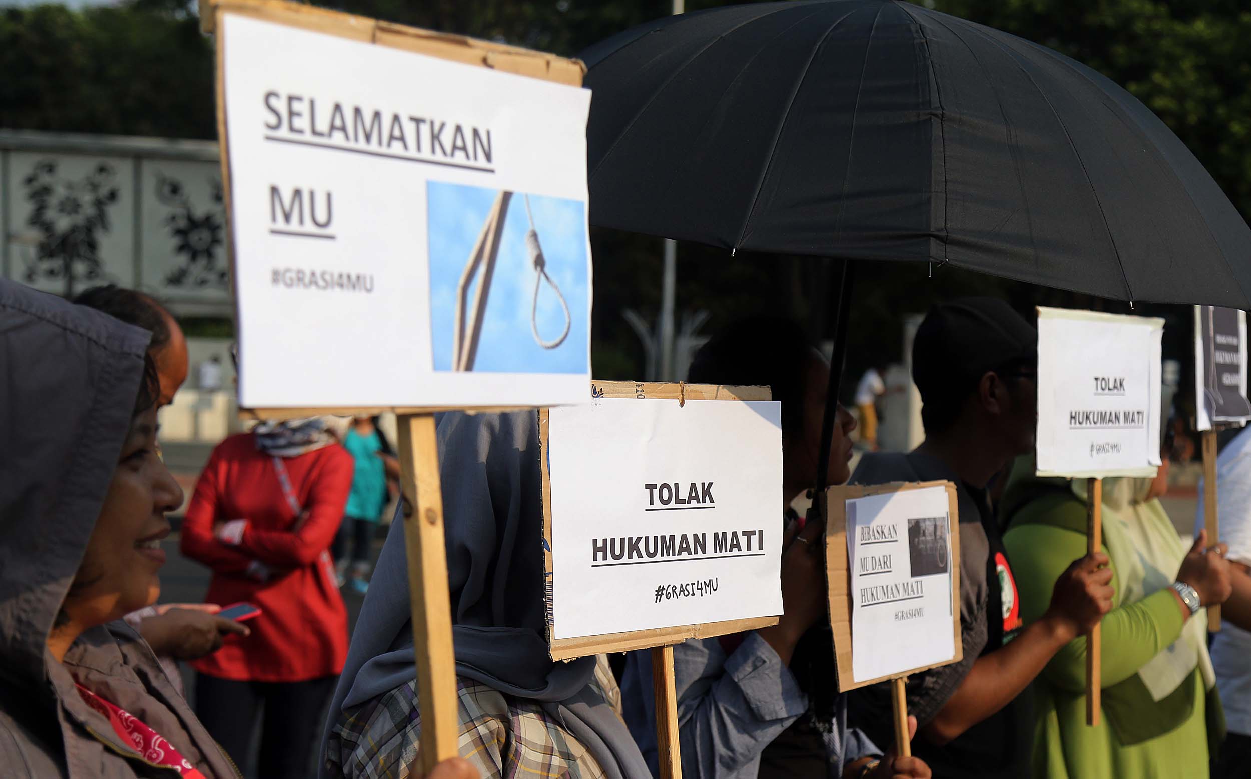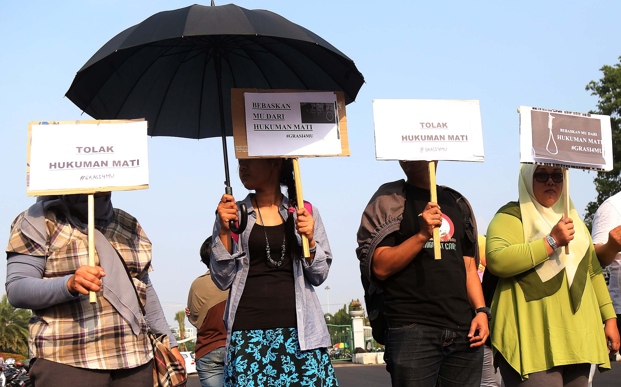 Puluhan aktivis yang tergabung dalam Aliansi Tolak Hukuman Mati melakukan aksi di depan Istana, di Jakata, Selasa (26/7/2016). Mereka meminta pemerintah untuk memberikan grasi dan membatalkan eksekusi mati bagi terpidana Merry Utami (MU) yang rencananya akan dilaksanakan pada akhir Bulan Juli 2016.
