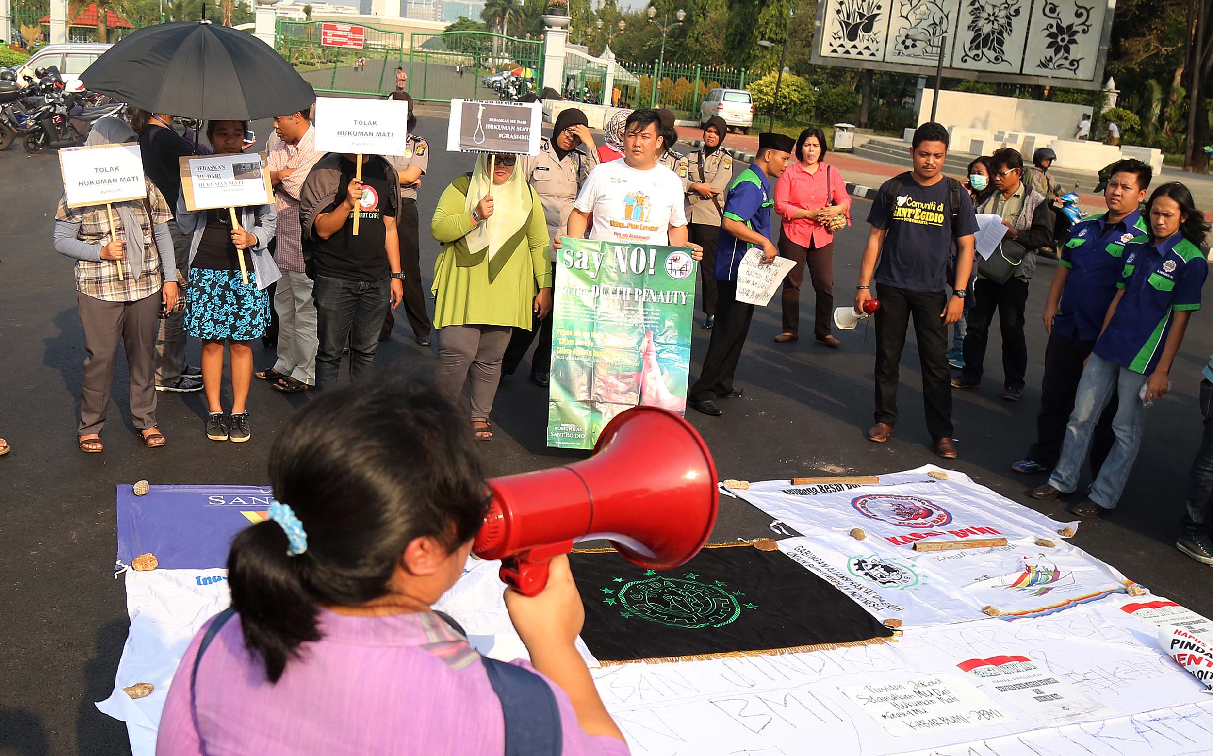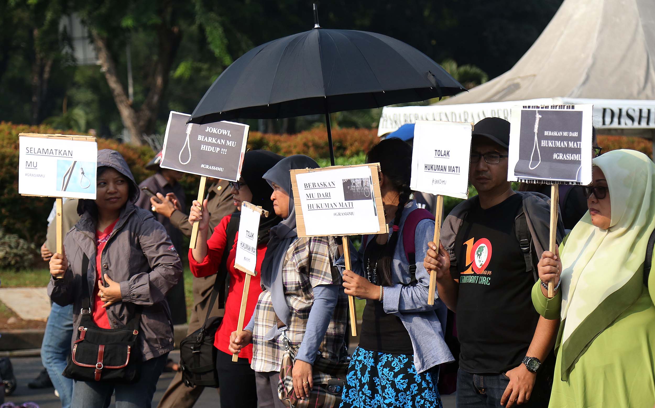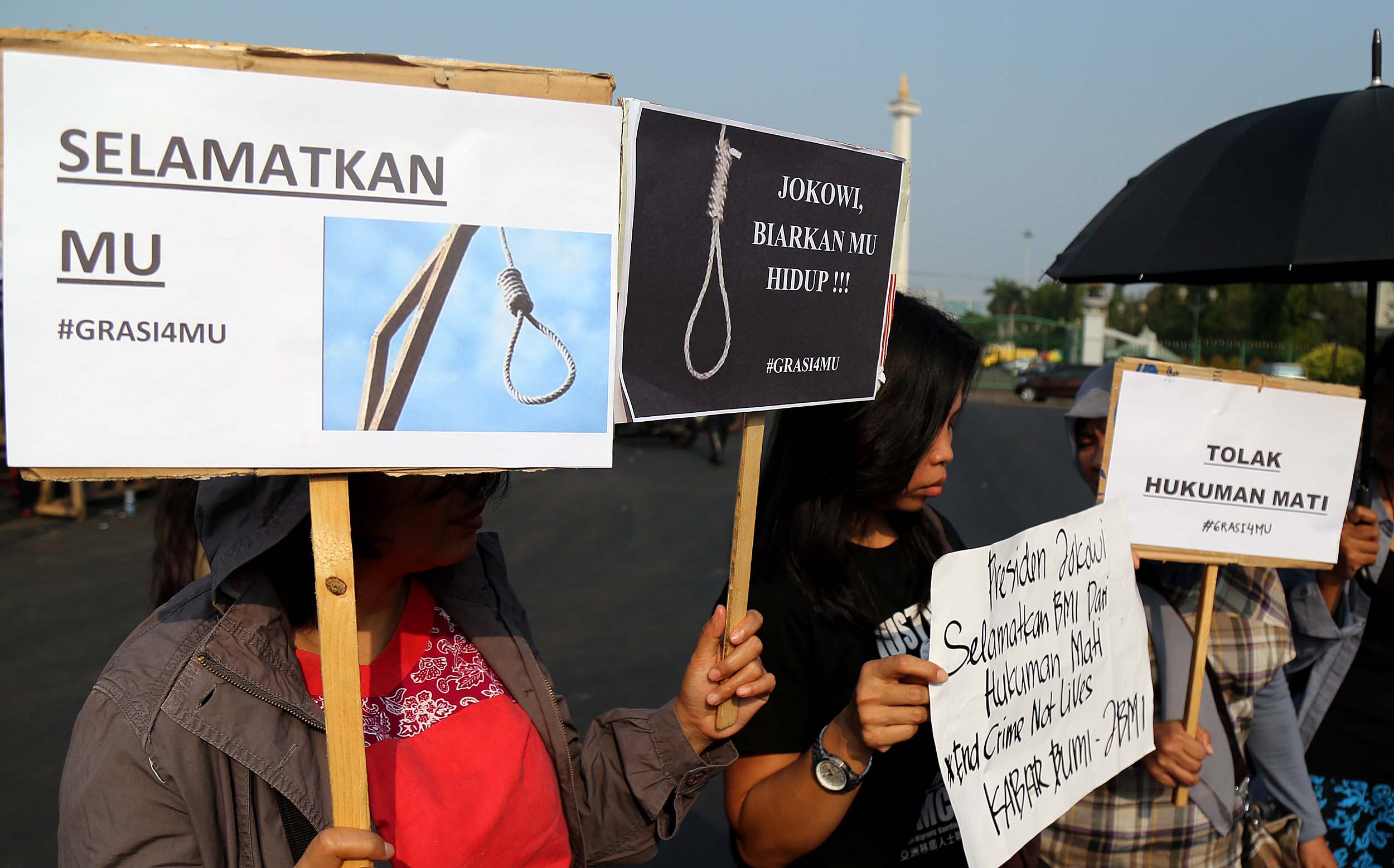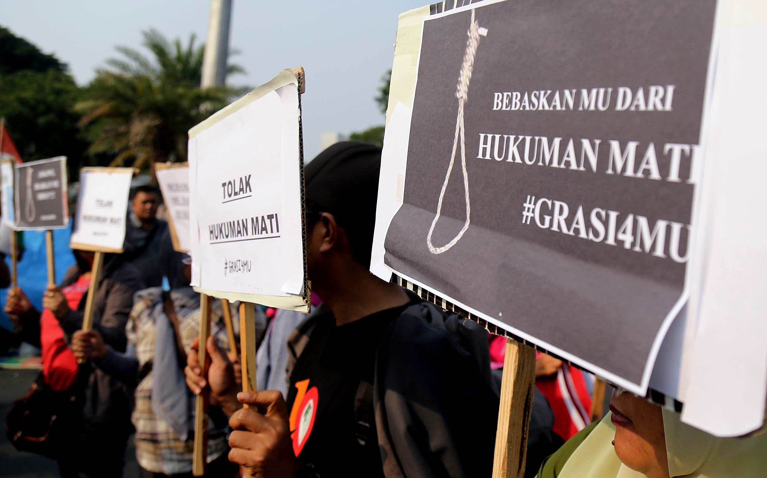 Puluhan aktivis yang tergabung dalam Aliansi Tolak Hukuman Mati melakukan aksi di depan Istana, di Jakata, Selasa (26/7/2016). Mereka meminta pemerintah untuk memberikan grasi dan membatalkan eksekusi mati bagi terpidana Merry Utami (MU) yang rencananya akan dilaksanakan pada akhir Bulan Juli 2016.