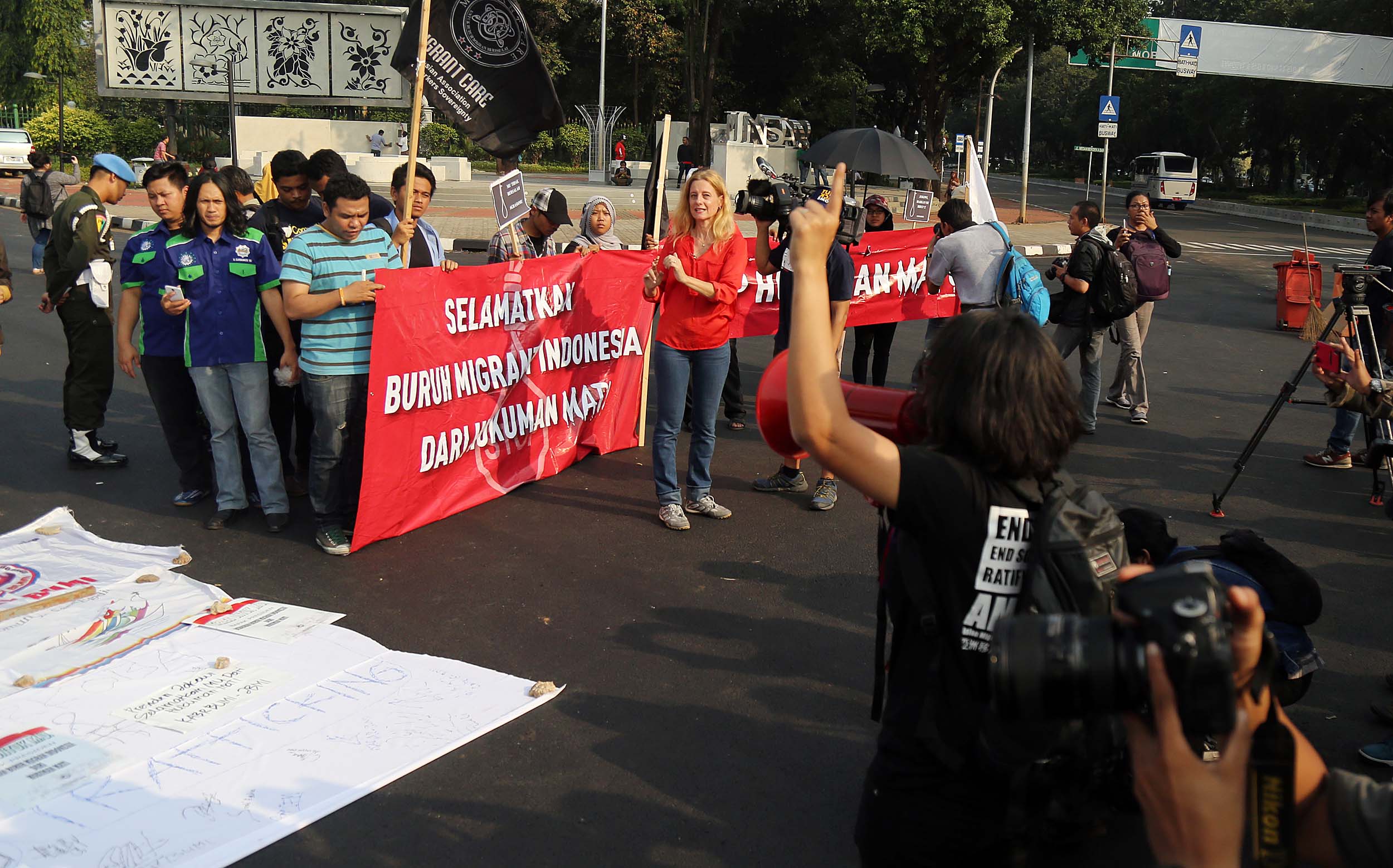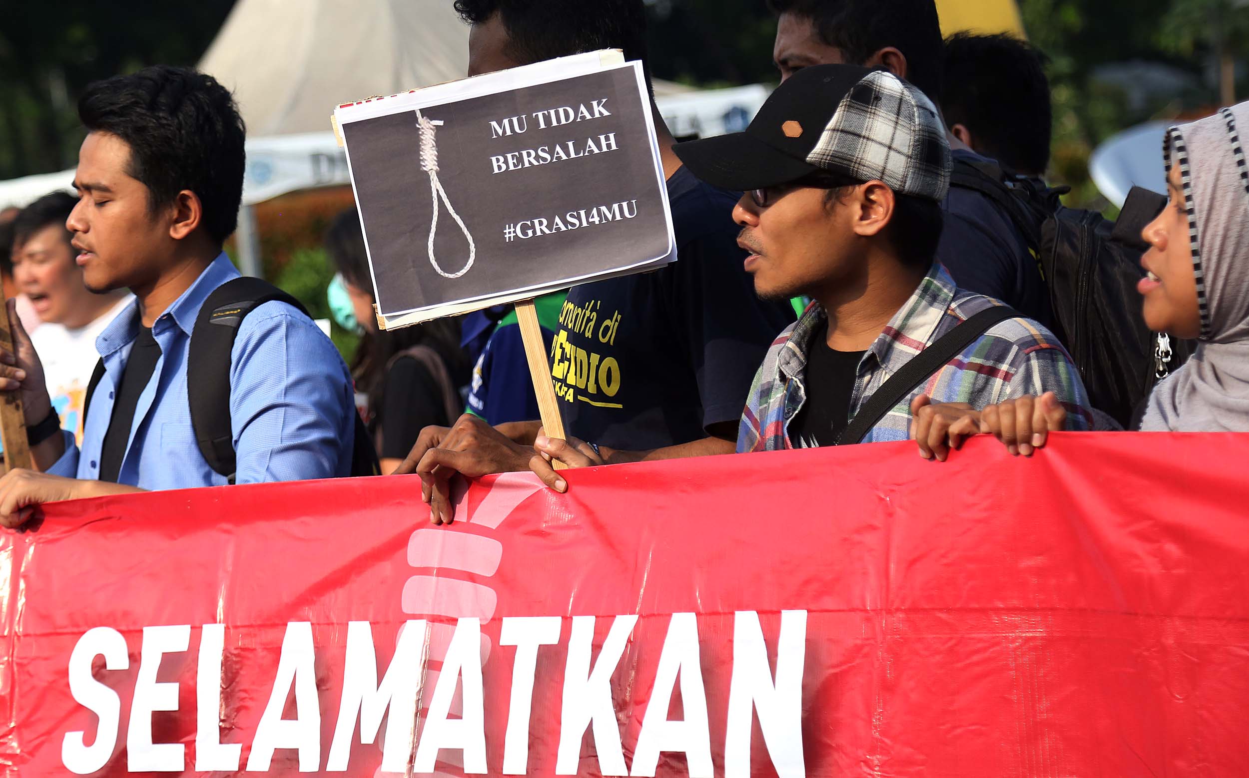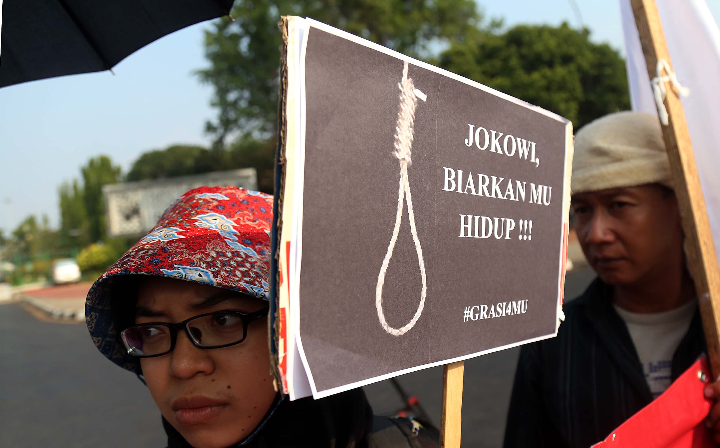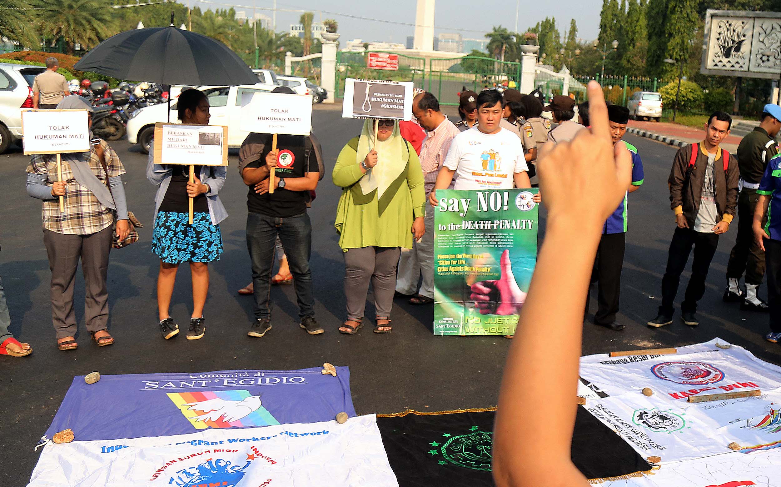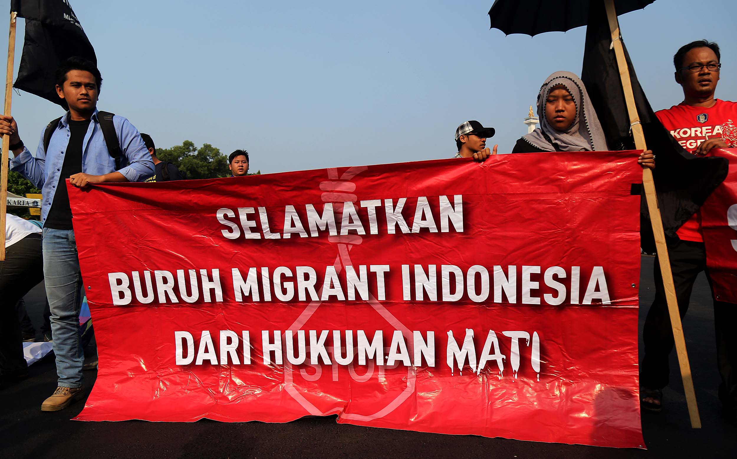 Puluhan aktivis yang tergabung dalam Aliansi Tolak Hukuman Mati melakukan aksi di depan Istana, di Jakata, Selasa (26/7/2016). Mereka meminta pemerintah untuk memberikan grasi dan membatalkan eksekusi mati bagi terpidana Merry Utami (MU) yang rencananya akan dilaksanakan pada akhir Bulan Juli 2016.