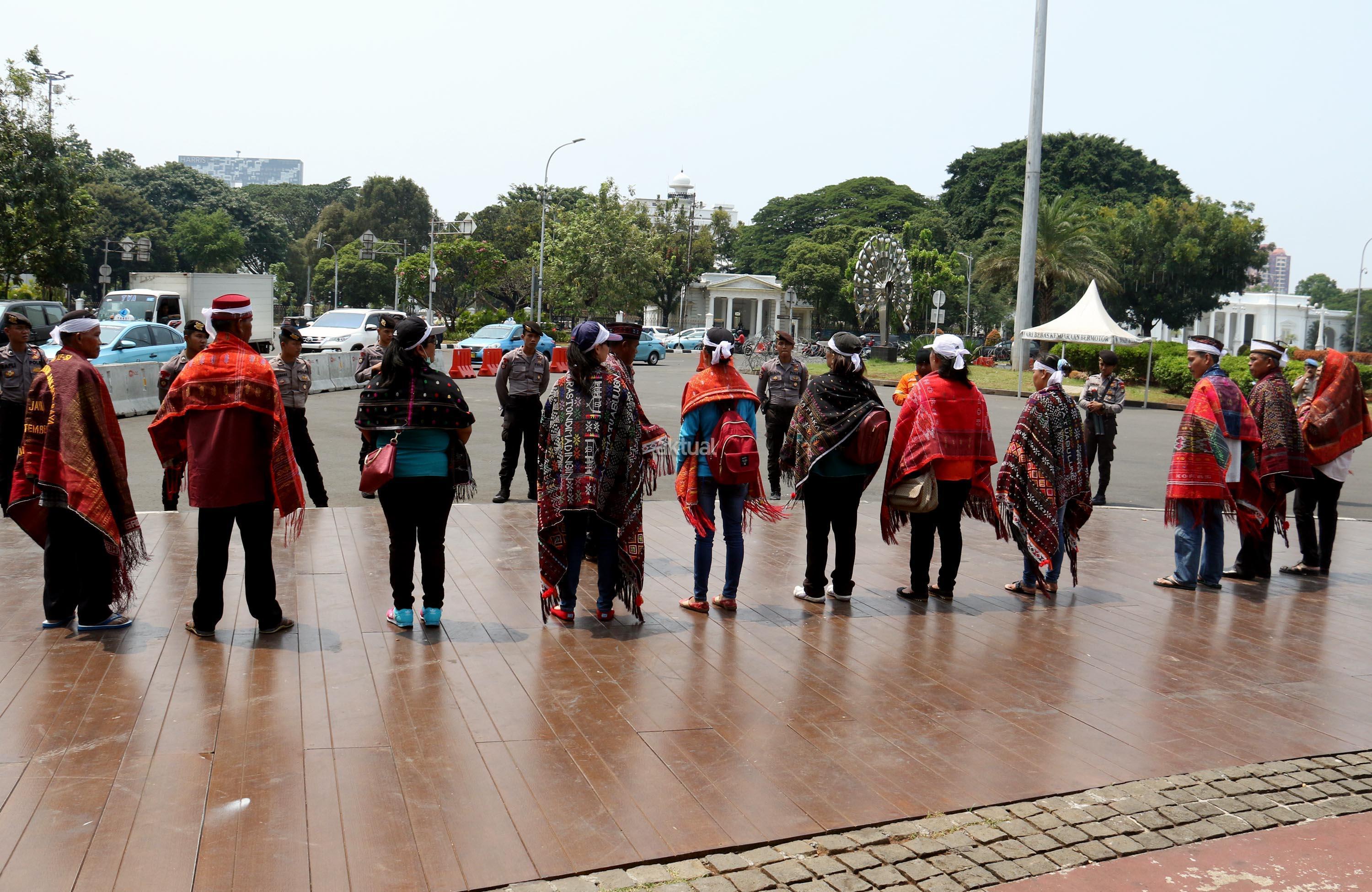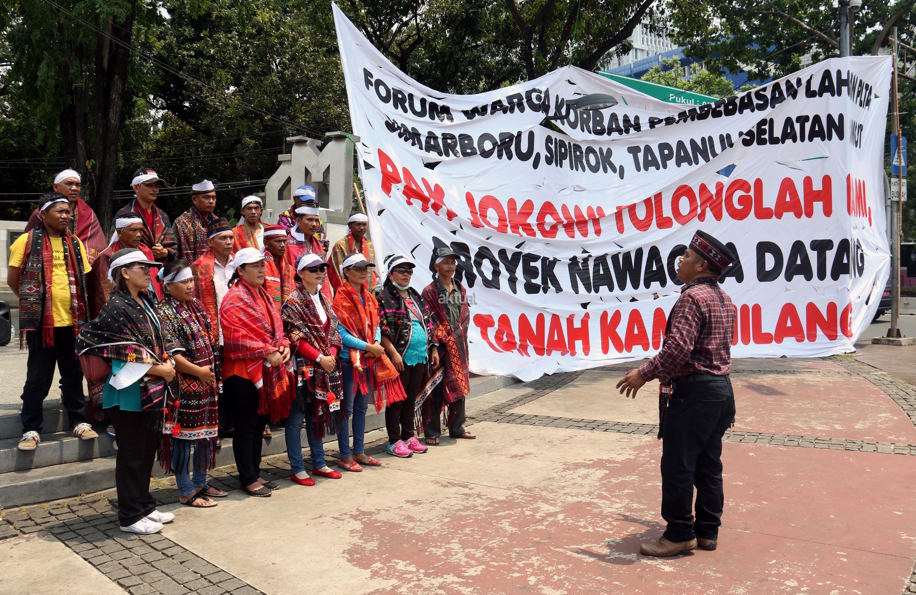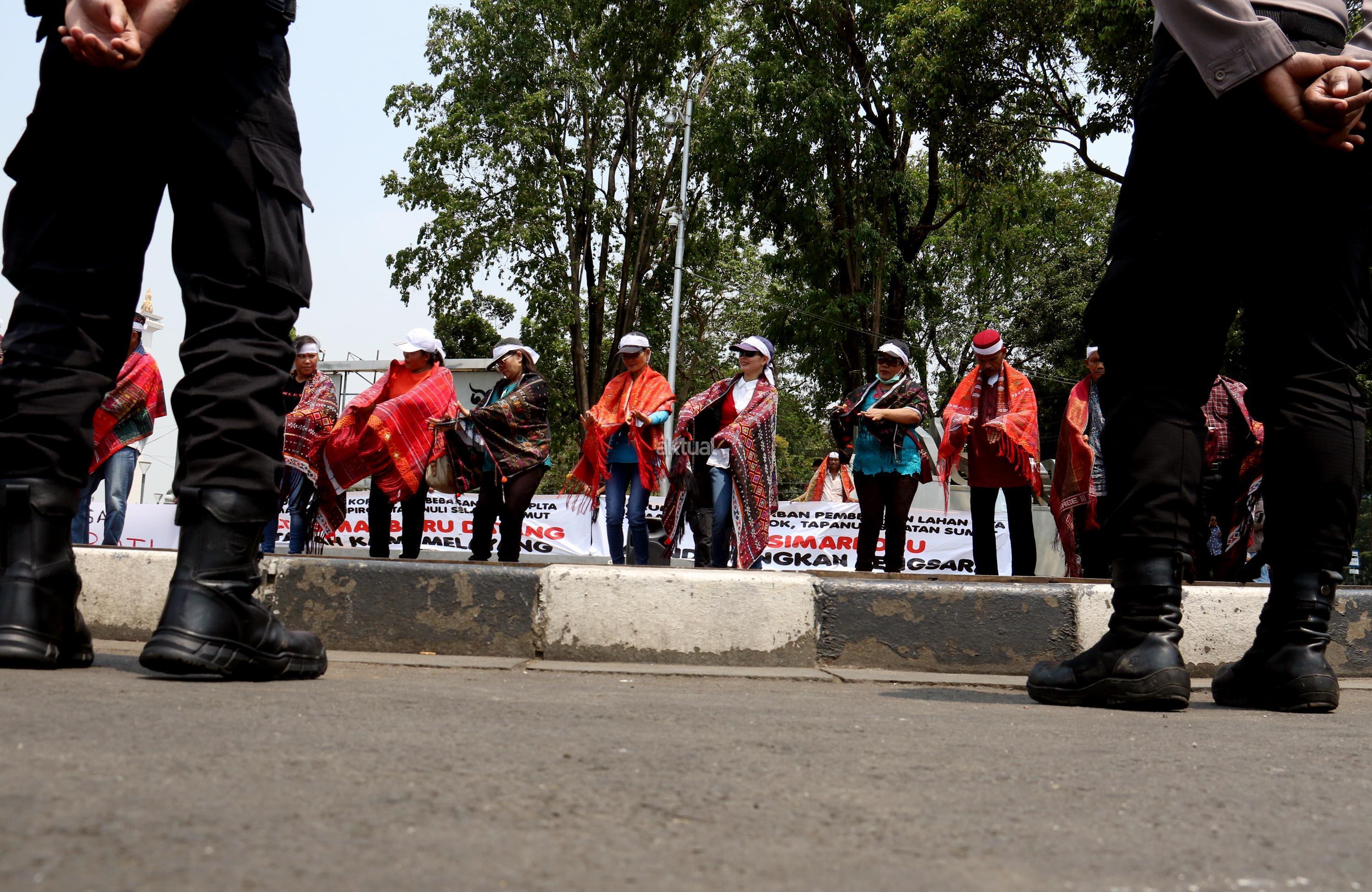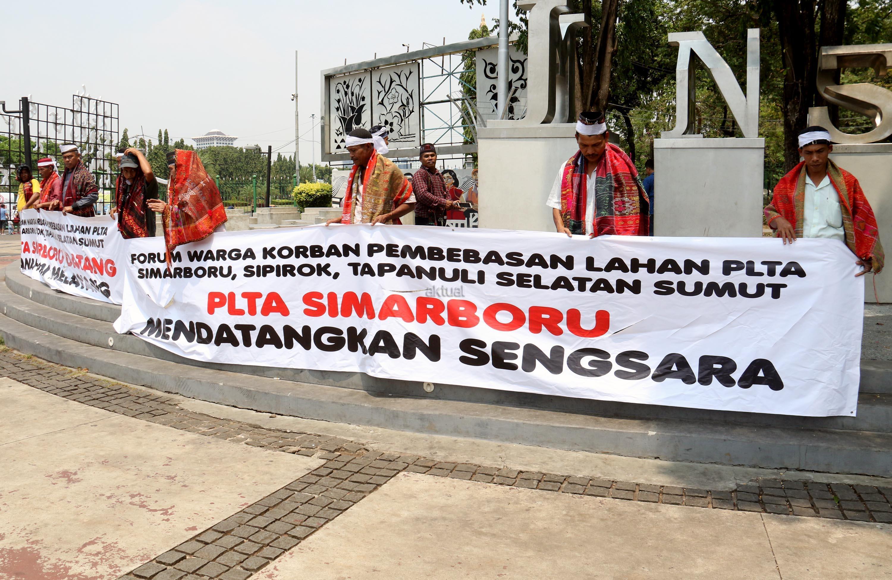 Sejumlah massa yang tergabung dalam Forum Warga Korban Pembebasan Lahan PLTA Simarboru melakukan aksi tari tor-tor sebagai bentuk penolakan intimidasi dan menakuti-nakuti warga terkait pembebesan tanah yang dilakukan oleh oknum perusahaan PT NHSE, di depan Istana Merdeka, Jakarta, Rabu (20/9/2017). Dalam aksinya orum Warga Korban Pembebasan Lahan PLTA Simarboru mendesak Presiden Jokowi untuk menyelesaikan konflik lahan serta memberikan perlindungan hukum bagi warga pemilik lahan dan segera hentikan intidimidasi masyarakat. AKTUAL/Munzir
