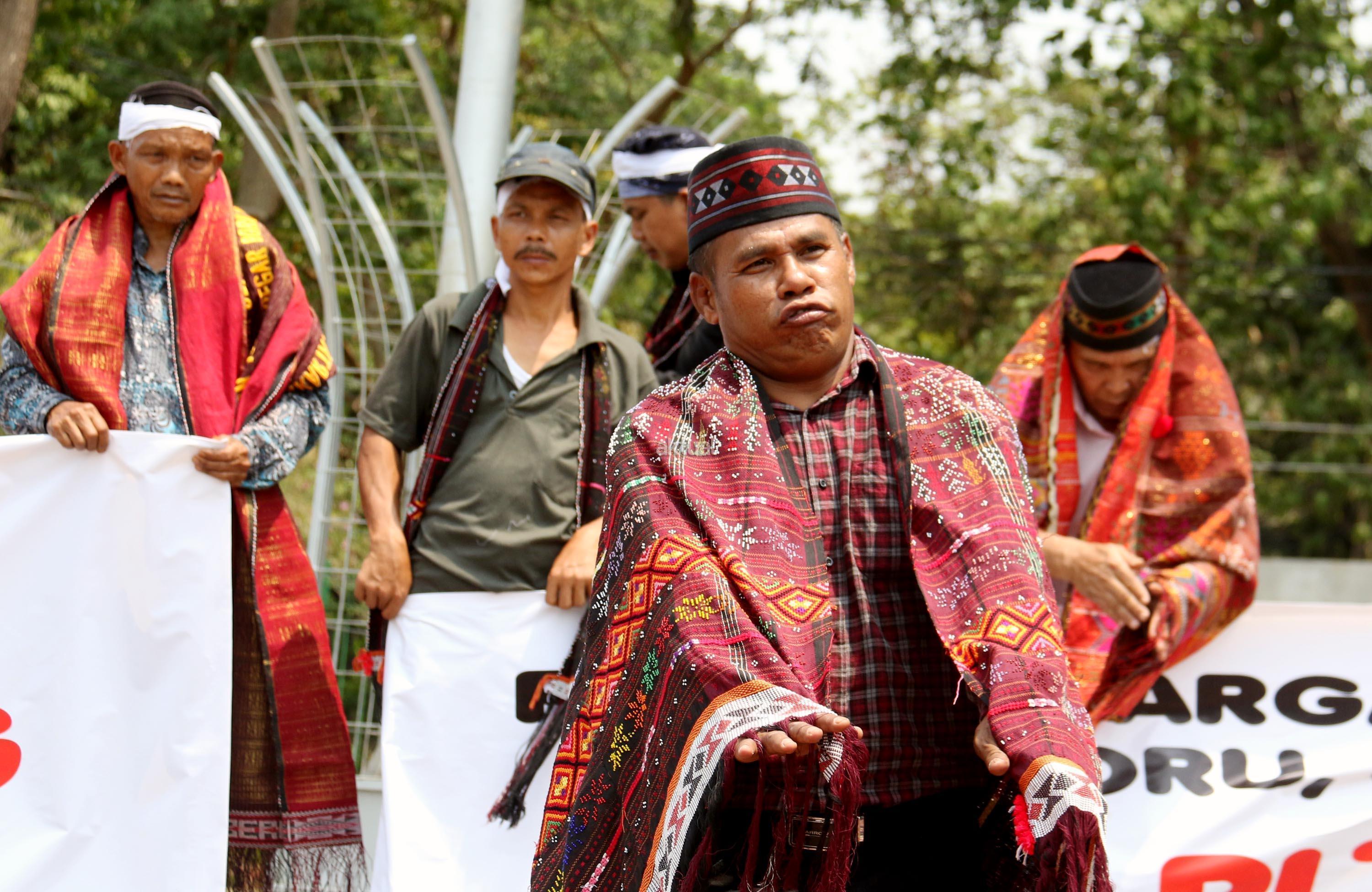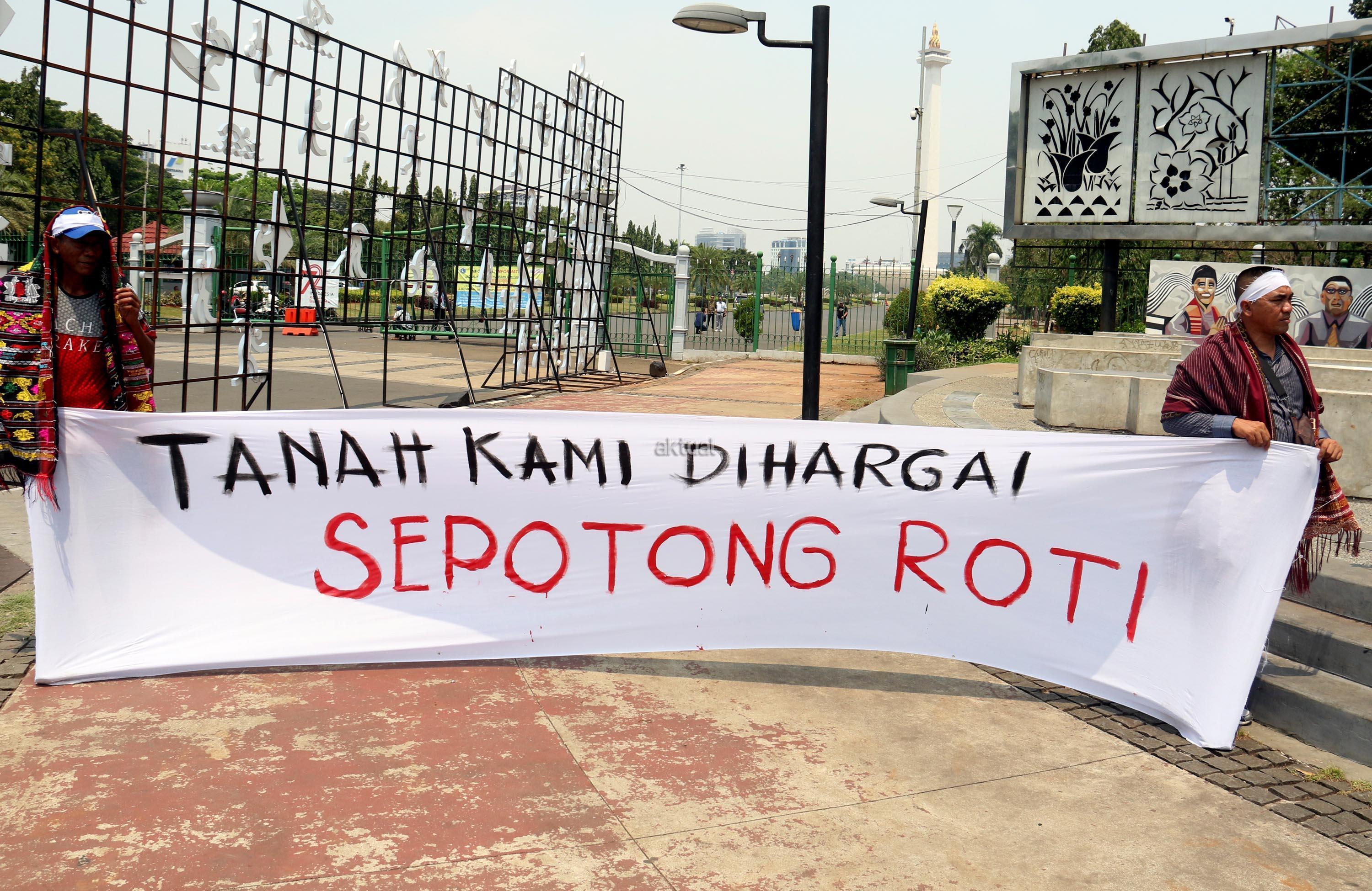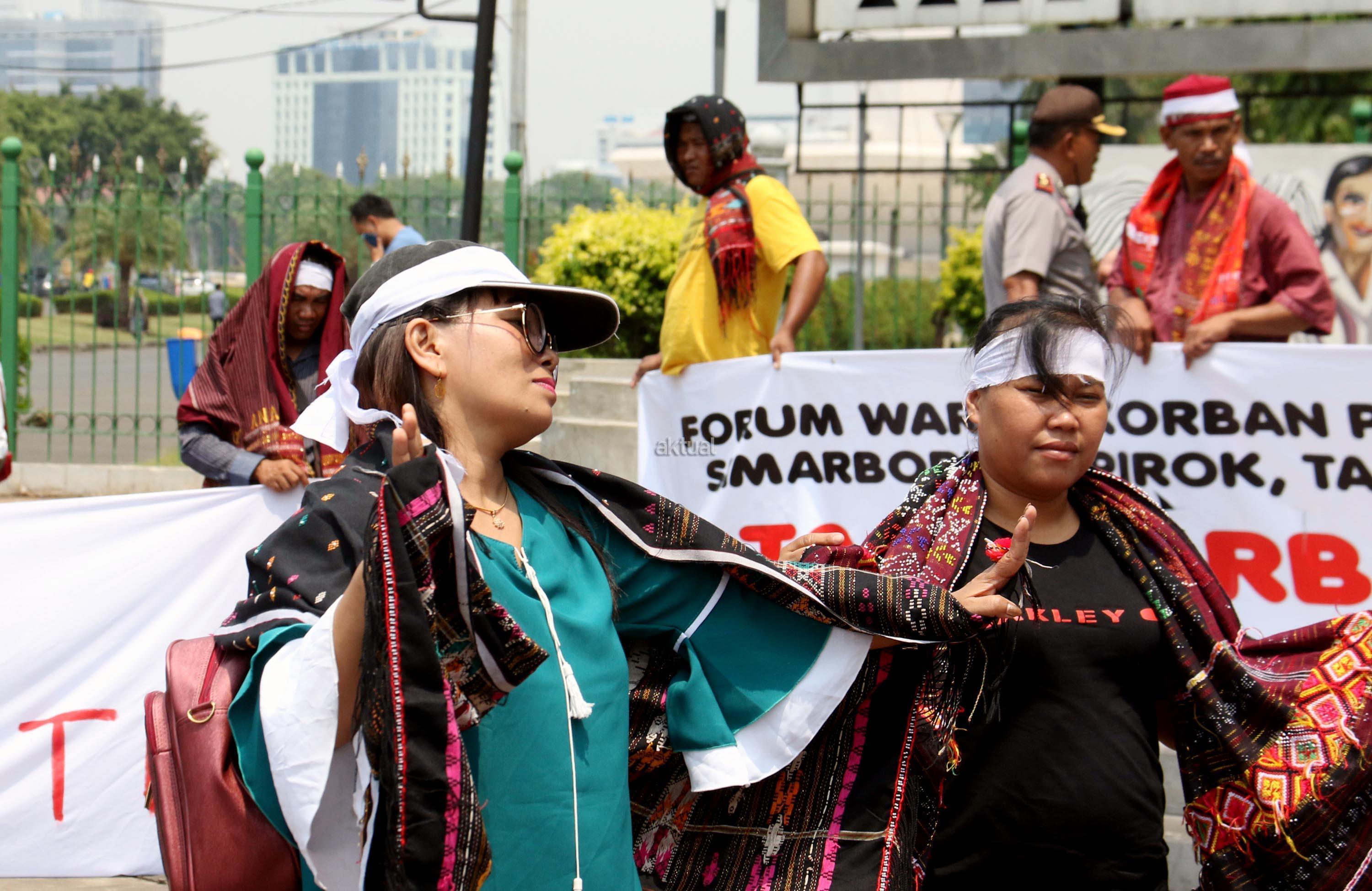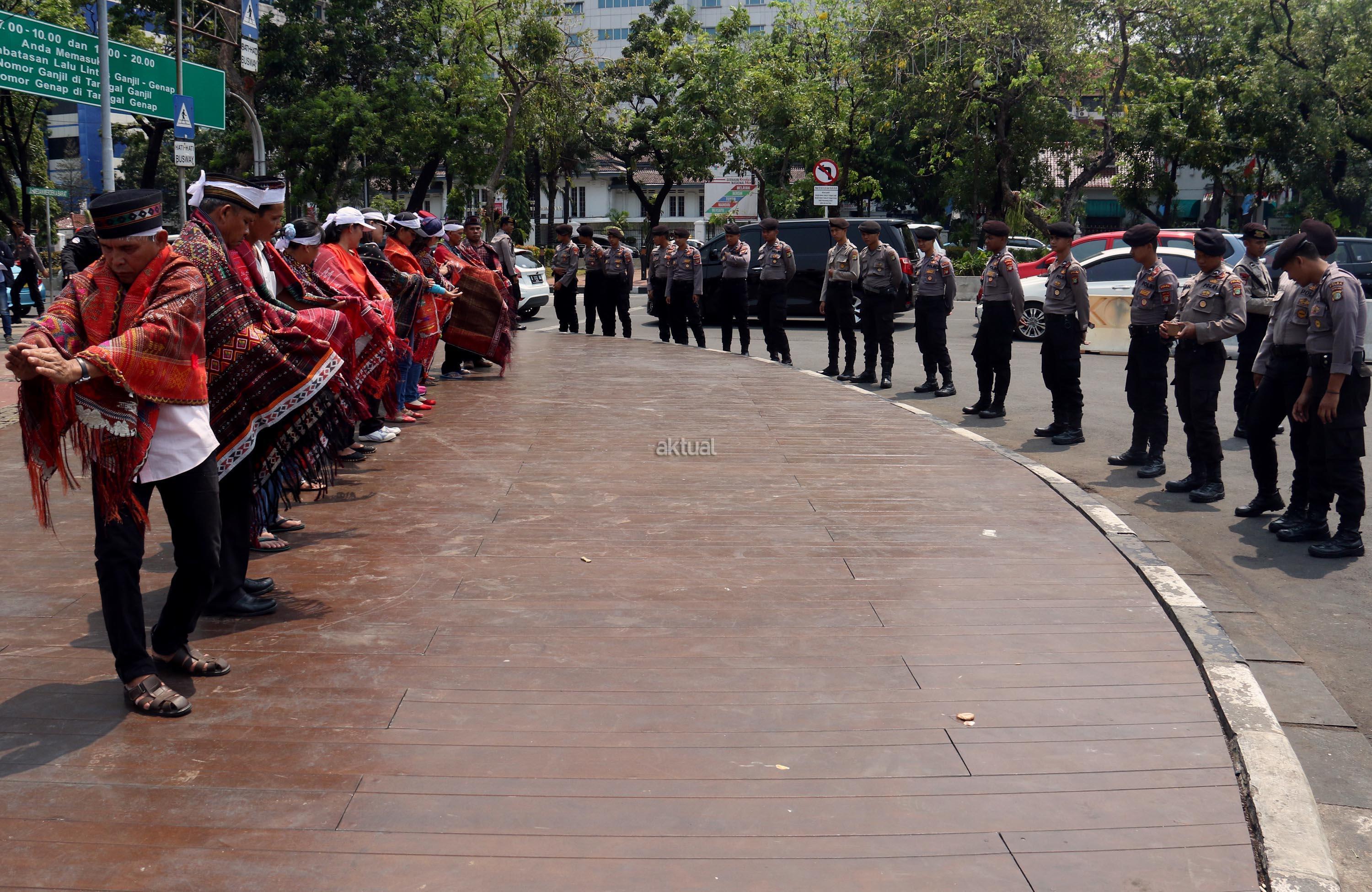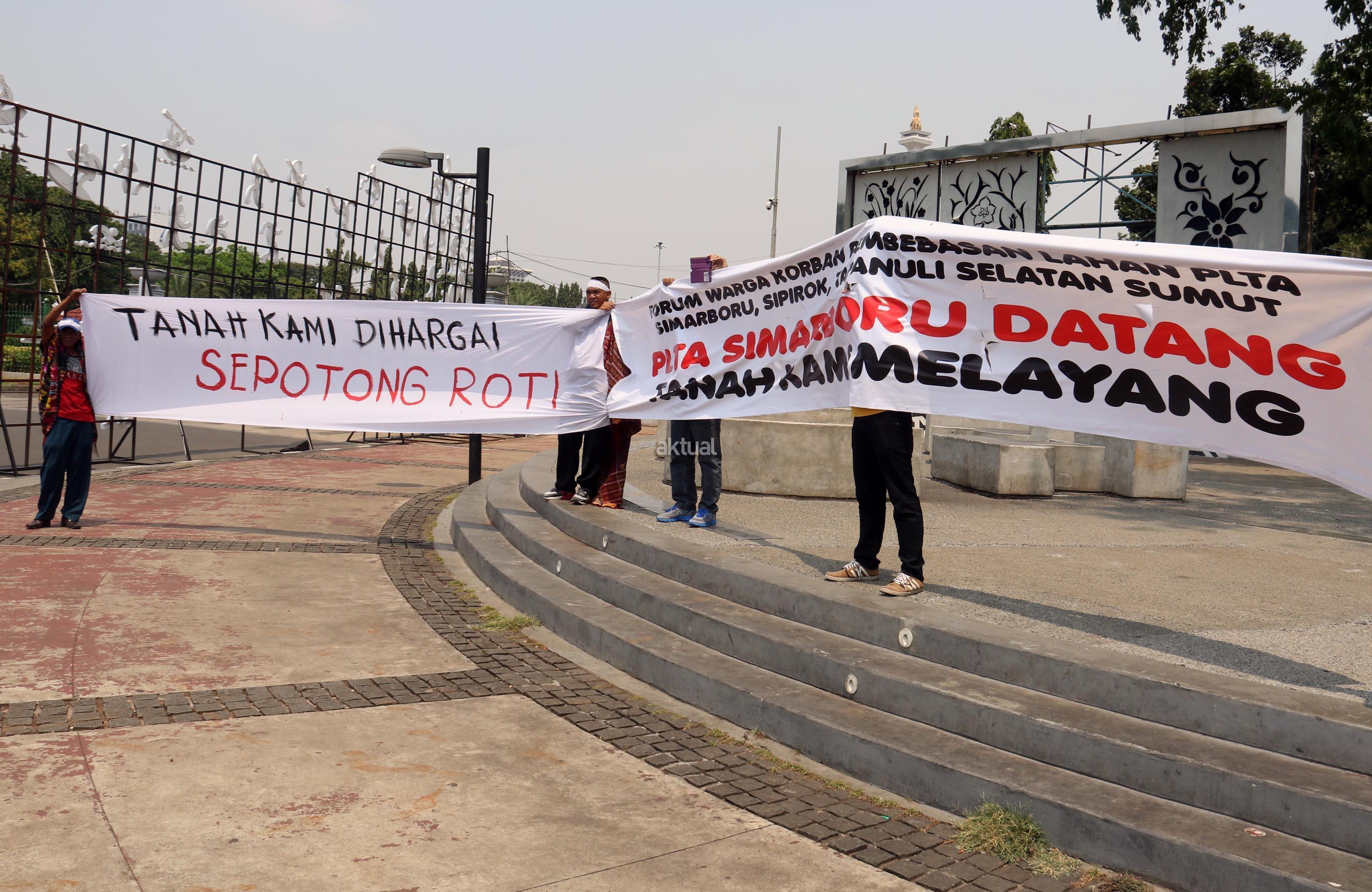 Sejumlah massa yang tergabung dalam Forum Warga Korban Pembebasan Lahan PLTA Simarboru melakukan aksi tari tor-tor sebagai bentuk penolakan intimidasi dan menakuti-nakuti warga terkait pembebesan tanah yang dilakukan oleh oknum perusahaan PT NHSE, di depan Istana Merdeka, Jakarta, Rabu (20/9/2017). Dalam aksinya orum Warga Korban Pembebasan Lahan PLTA Simarboru mendesak Presiden Jokowi untuk menyelesaikan konflik lahan serta memberikan perlindungan hukum bagi warga pemilik lahan dan segera hentikan intidimidasi masyarakat. AKTUAL/Munzir