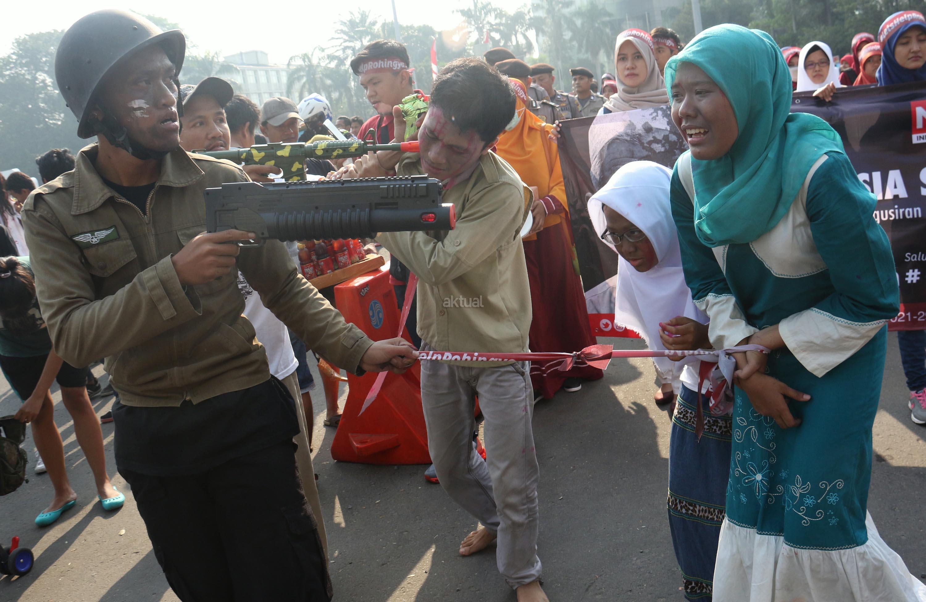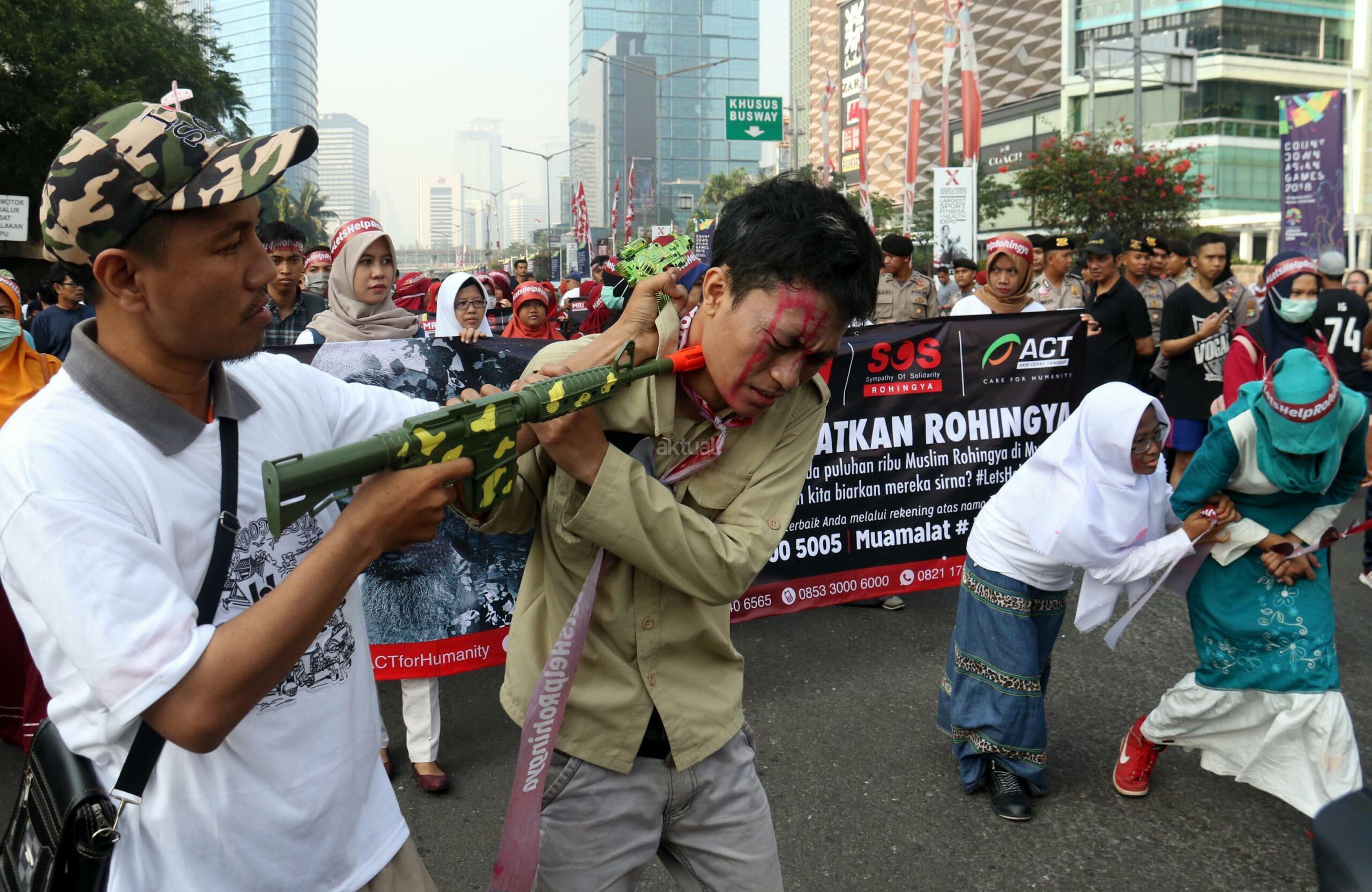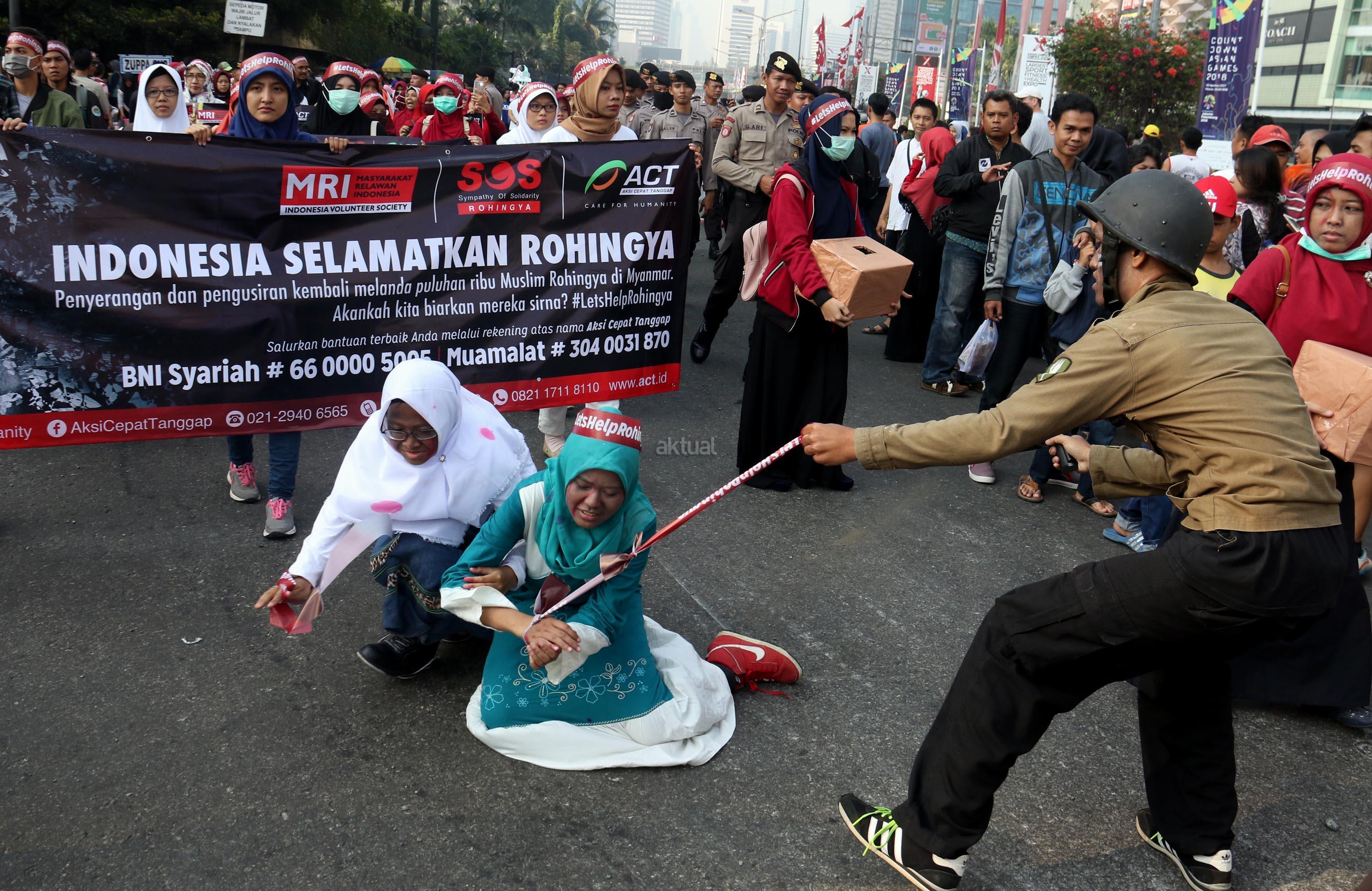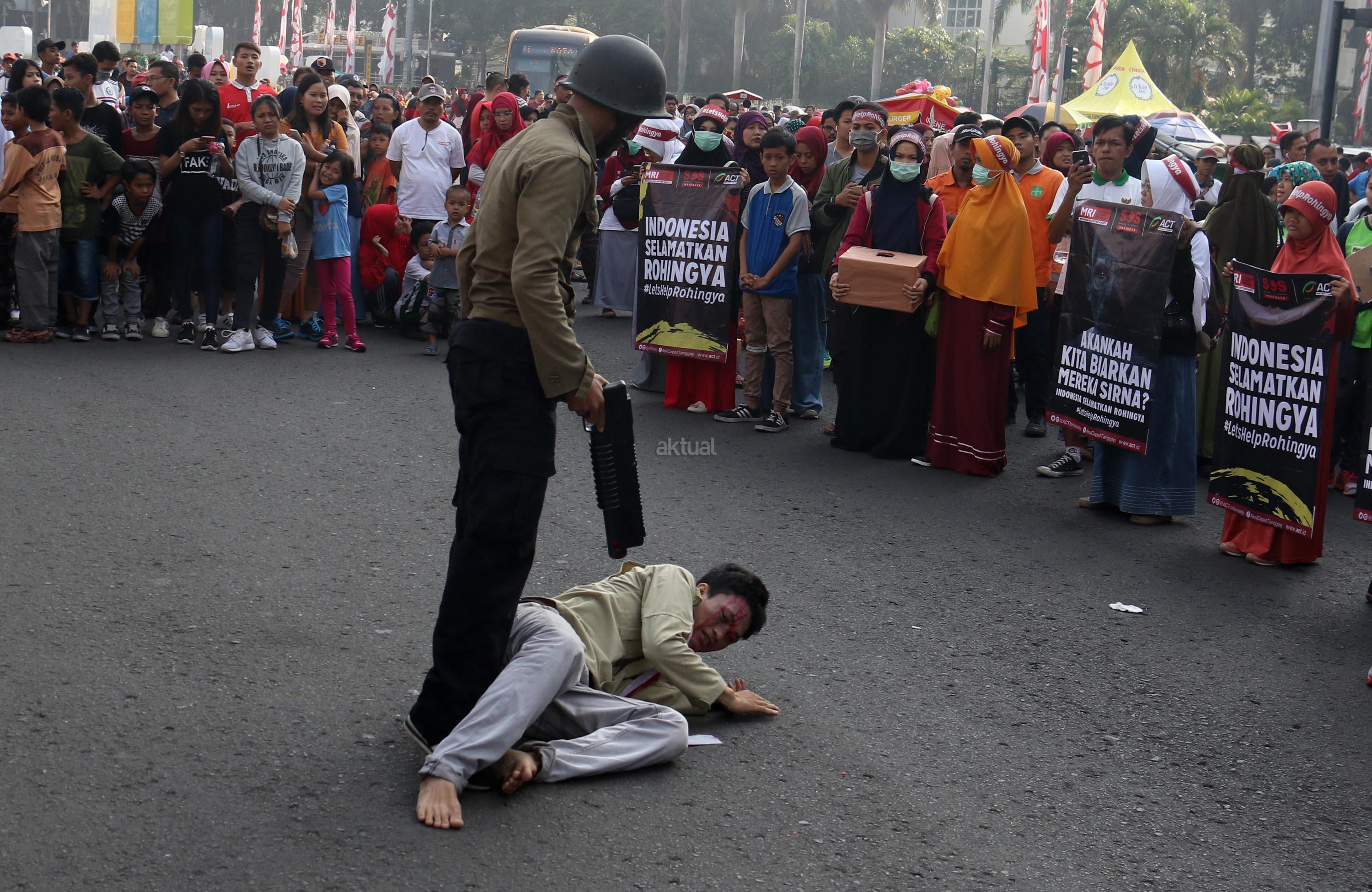 Sejumlah massa dari berbagai elemen organisasi melakukan aksi theaterikal #saverohingya di kawasan CFD, Bunderan HI, Jakarta, Minggu (3/9/2017). Dalam aksi theaterikal sebagai bentuk solidaritas warga Indonesia atas tragedi kemanusiaan muslim Rohingya dan mengutuk kekerasan, pembunuhan terhadap etnis muslim Rohingya yang dilakukan oleh Militer Myanmar. AKTUAL/Munzir