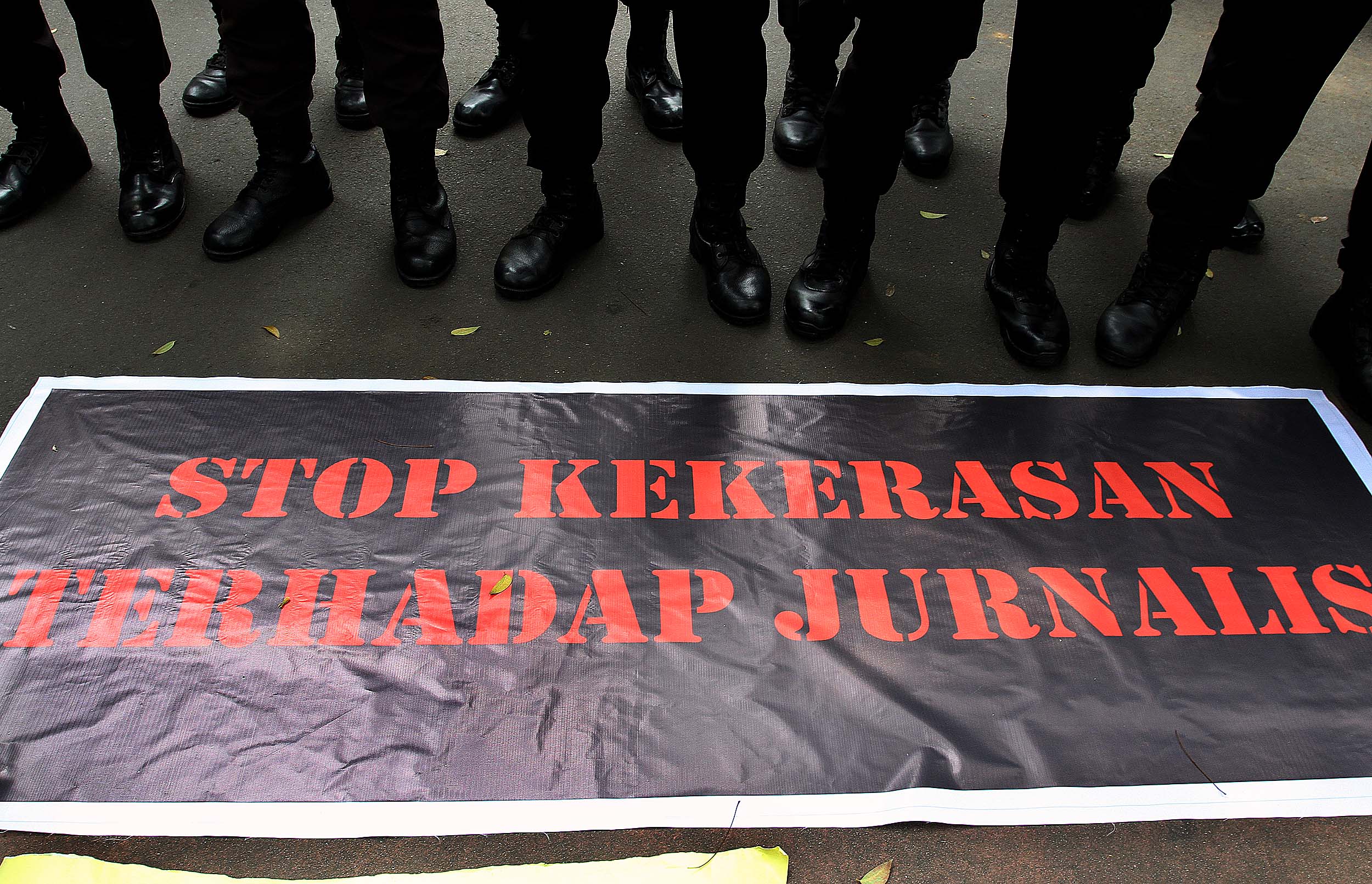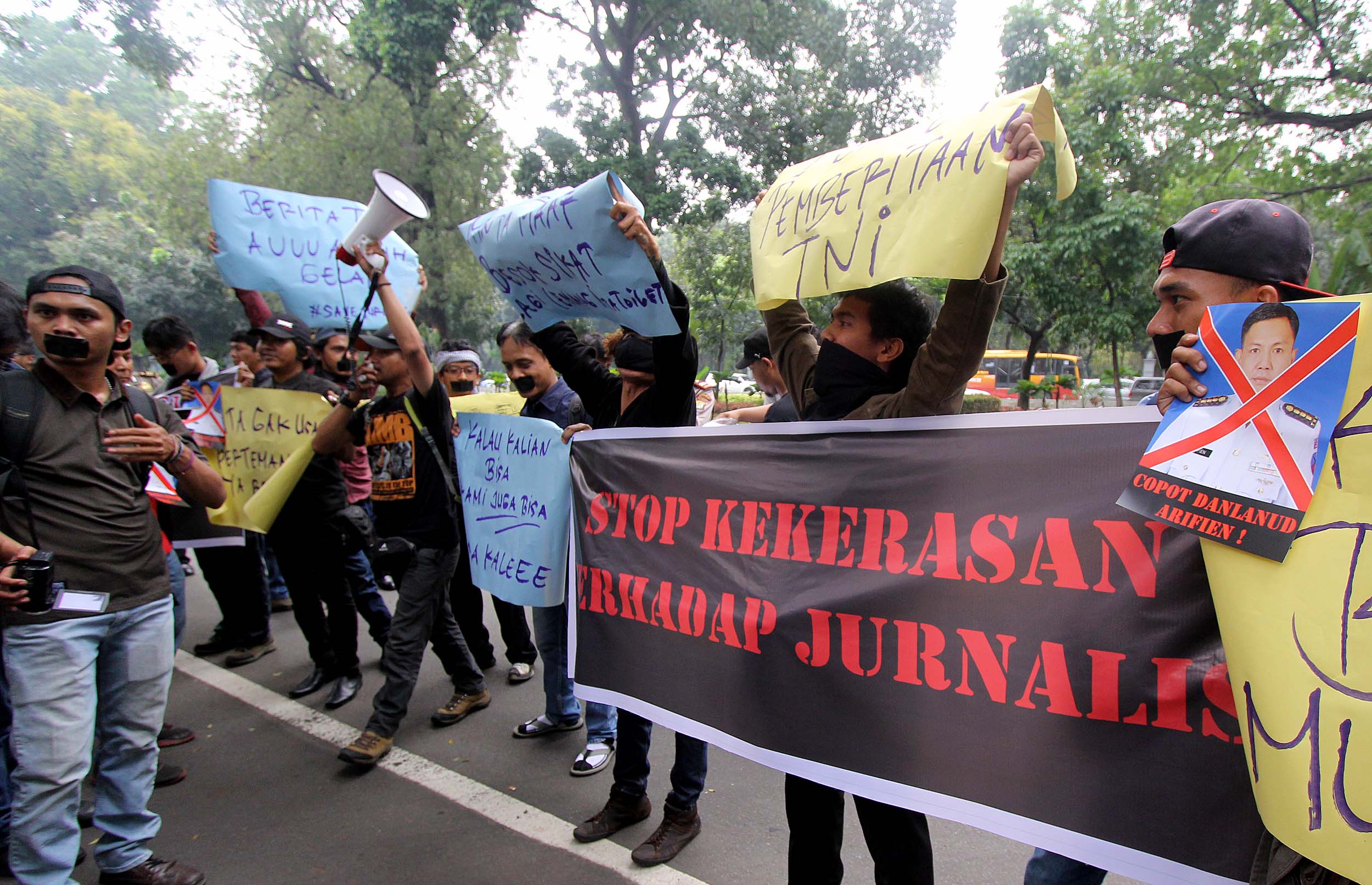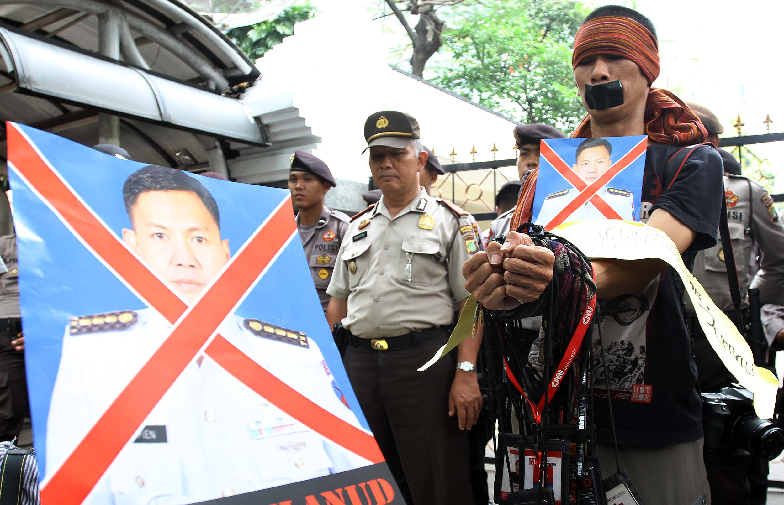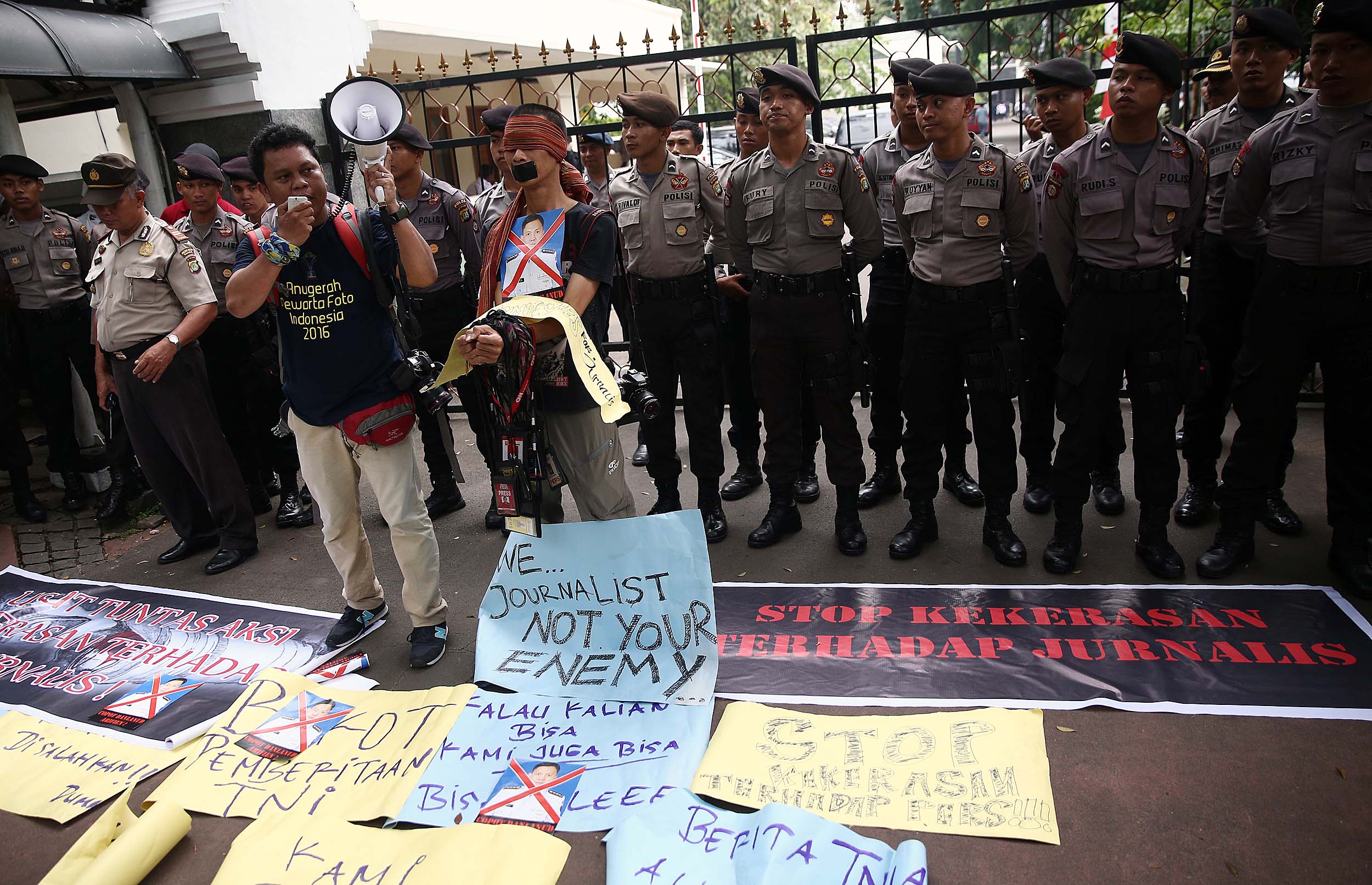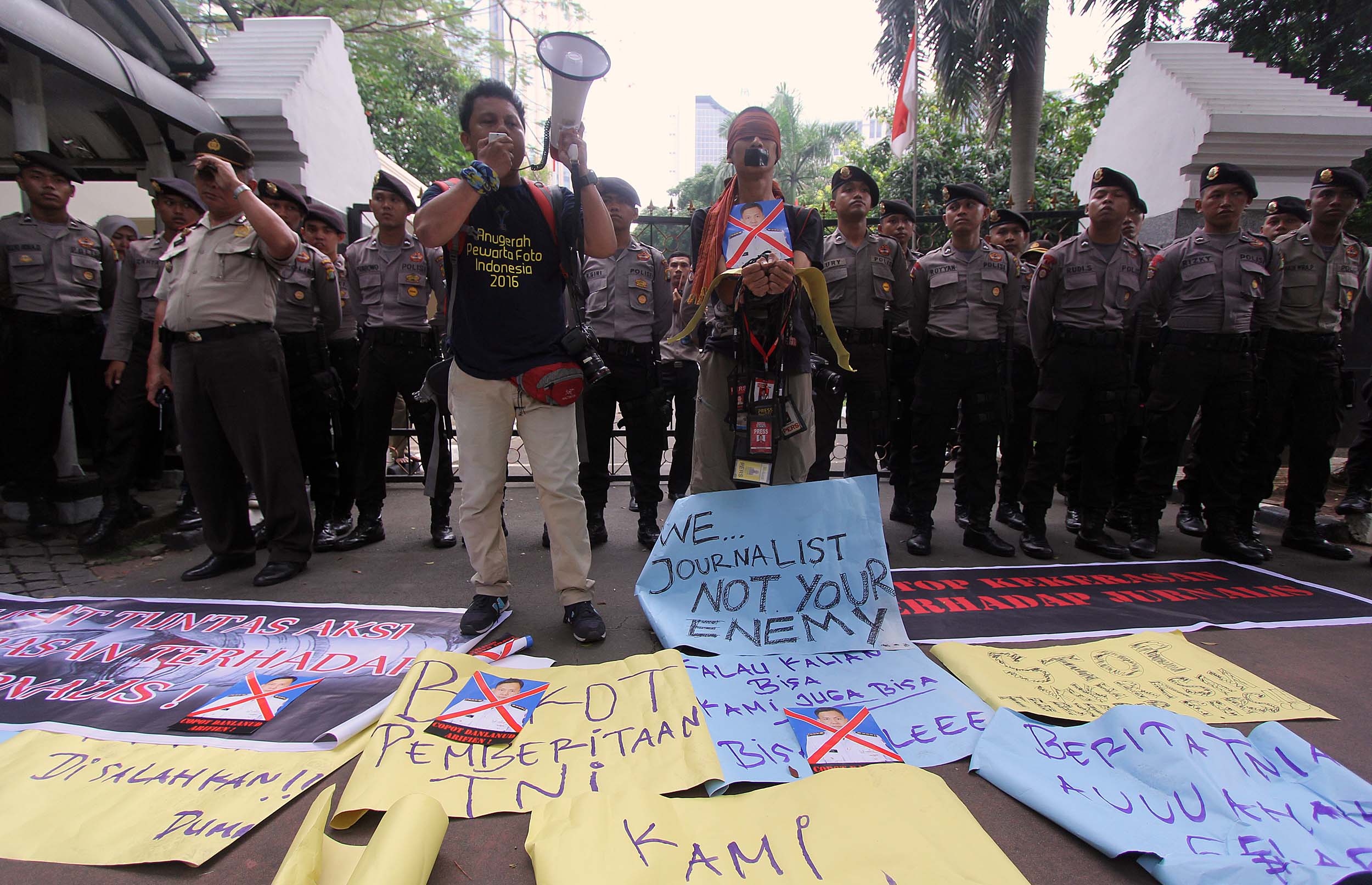 Puluhan Jurnalis yang tergabung dalam berbagai kelompok melakukan aksi demonstrasi di depan Kantor Kementerian Politik, Hukum dan Keamanan (Kemenkopolhukam) di Jakarta, Kamis (25/8/2016). Dalam aksinya mendesak pemerintah menindak tegas para oknum TNI yang mengintimidasi dan represif terhadap kerja-kerja jurnalis. AKTUAL/MUNZIR