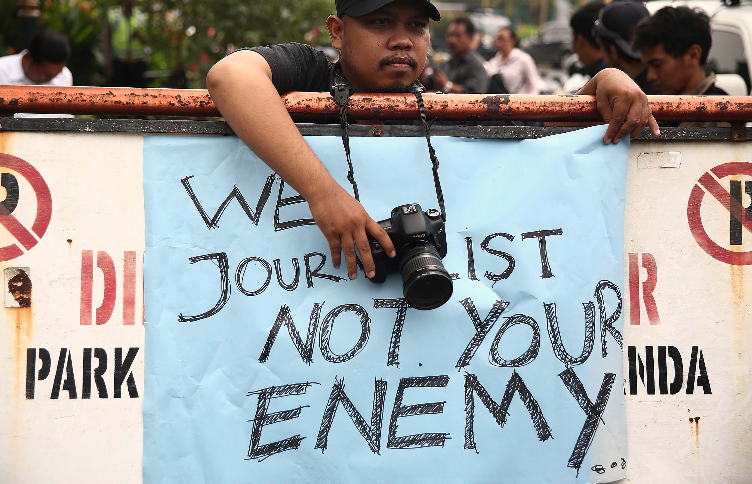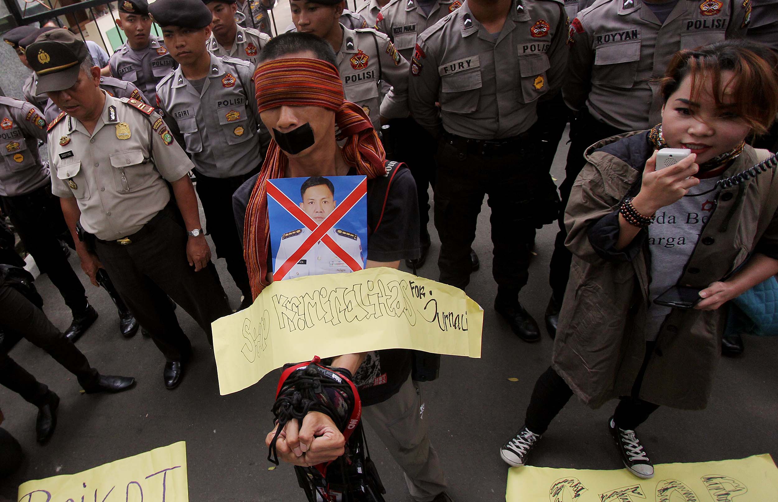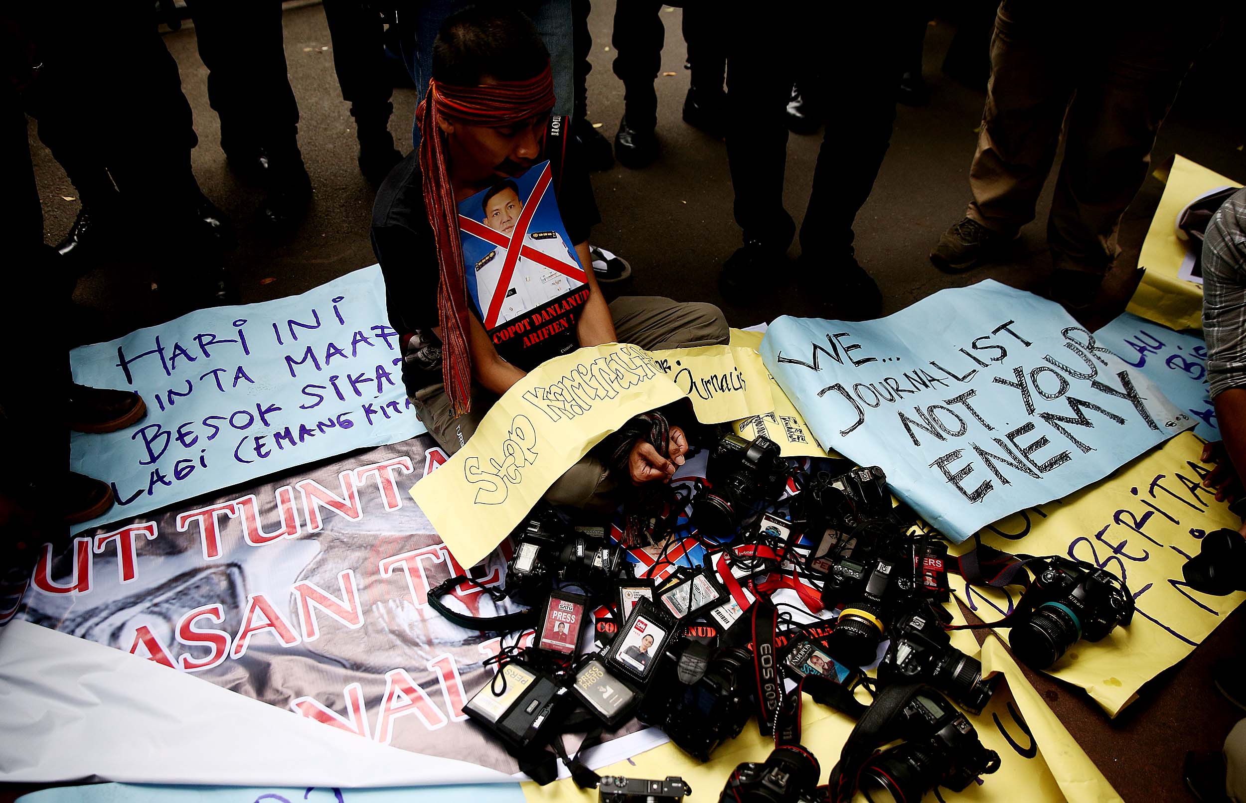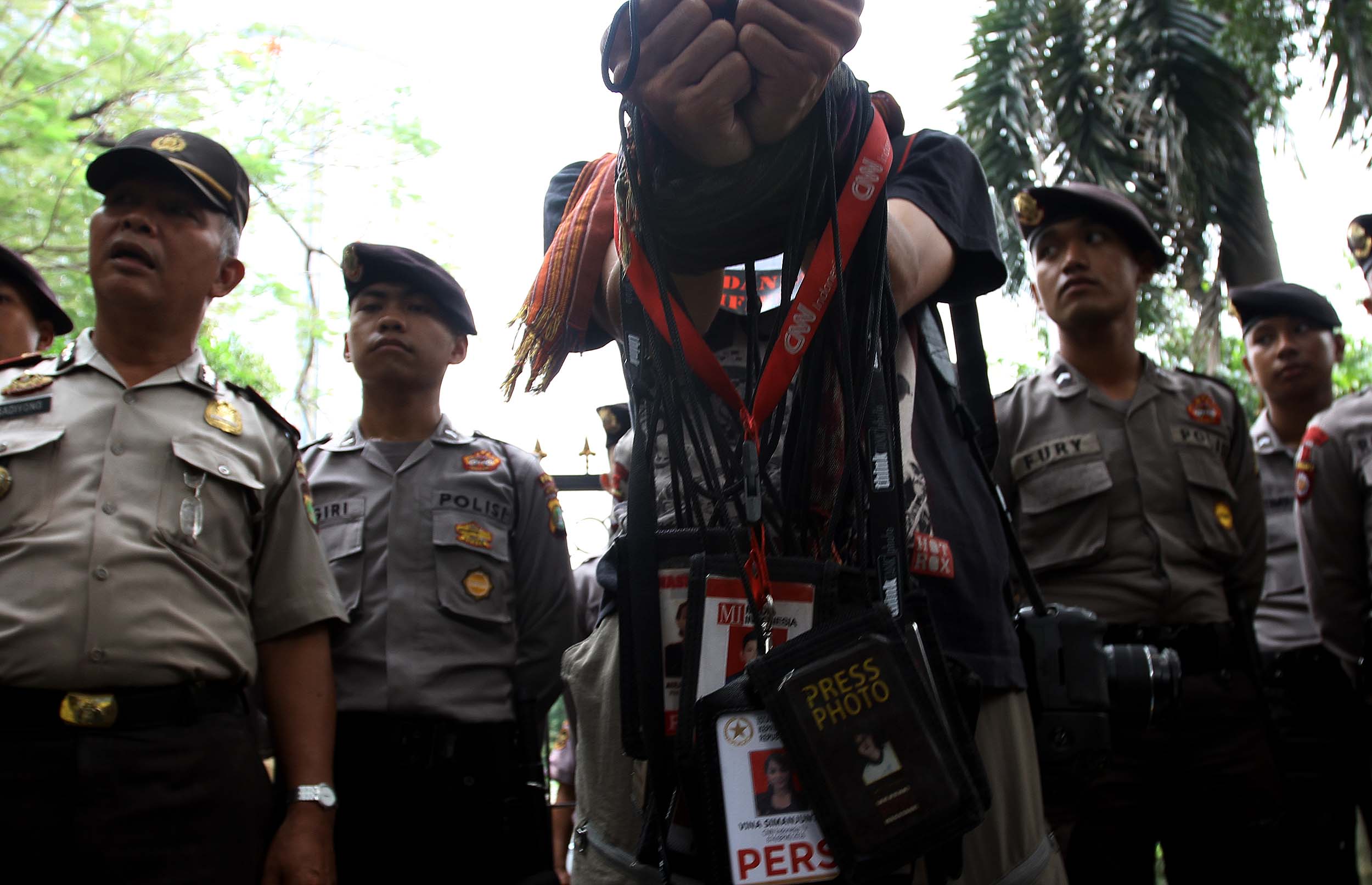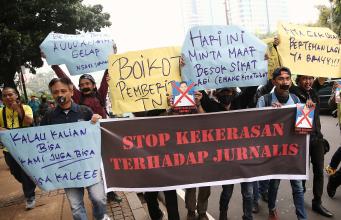 Puluhan Jurnalis yang tergabung dalam berbagai kelompok melakukan aksi demonstrasi di depan Kantor Kementerian Politik, Hukum dan Keamanan (Kemenkopolhukam) di Jakarta, Kamis (25/8/2016). Dalam aksinya mendesak pemerintah menindak tegas para oknum TNI yang mengintimidasi dan represif terhadap kerja-kerja jurnalis. AKTUAL/MUNZIR