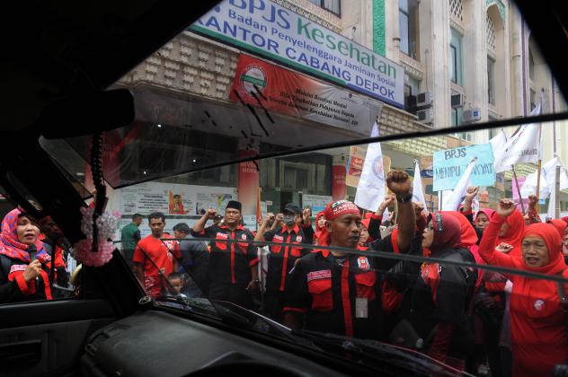 Puluhan orang yang tergabung dalam Dewan Kesehatan Rakyat (DKR) Kota Depok berunjuk rasa menolak rencana kenaikan iuran BPJS Kesehatan di depan kantor BPJS Kesehatan Cabang Depok, Jawa Barat, Senin (21/3). Mereka menuntut pemerintah membatalkan Perpres 19/2016 tentang kenaikan iuran BPJS Kesehatan karena dinilai memberatkan rakyat miskin serta BPJS Kesehatan dianggap belum mampu memberikan pelayanan maksimal kepada pasien peserta BPJS. ANTARA FOTO/Indrianto Eko Suwarso/aww/16.