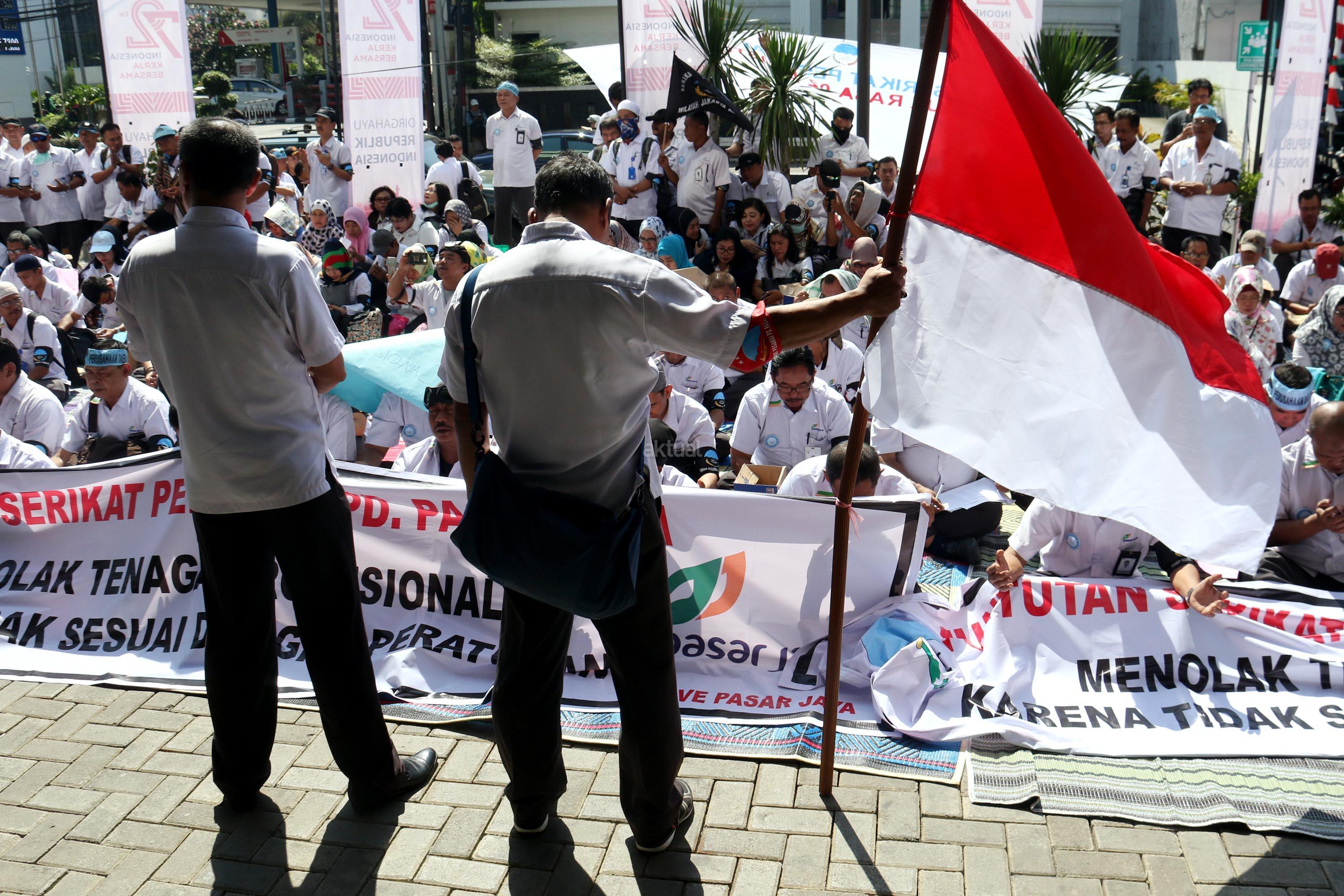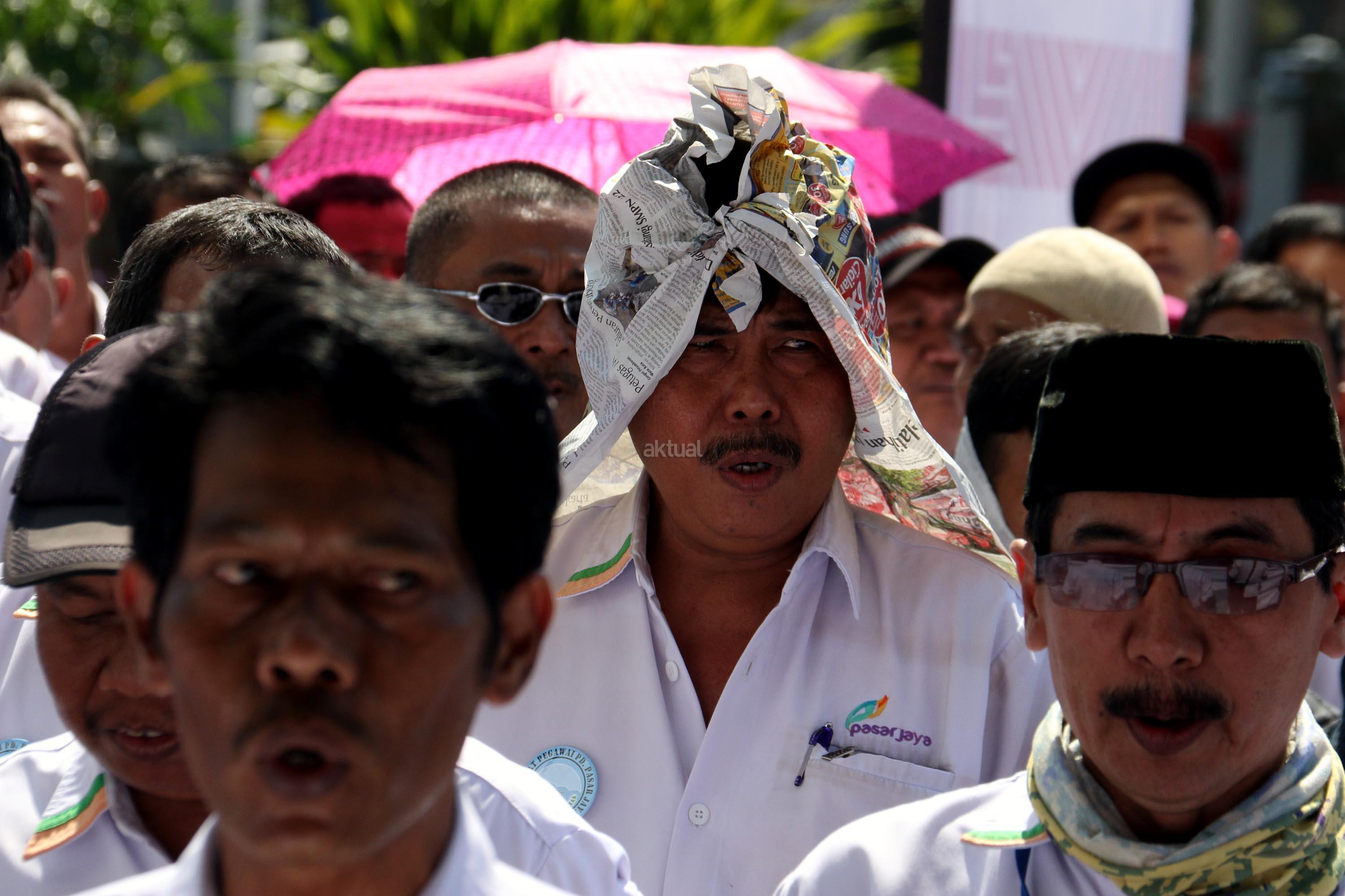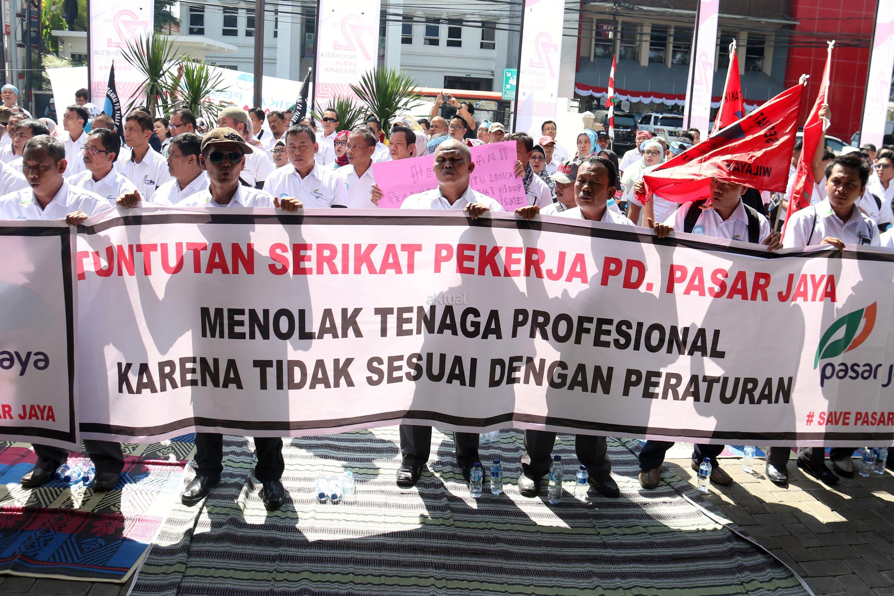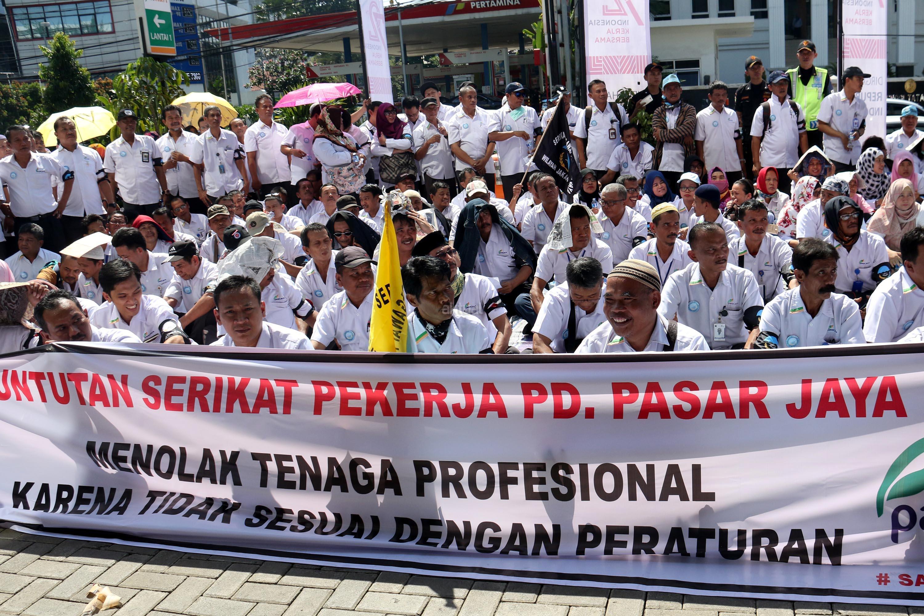 Ratusan karyawan PD Pasar Jaya yang tergabung dalam Serikat Pekerja (SP) Pasar Jaya melakukan aksi unjuk rasa di depan kantor PD Pasar Jaya, Jakarta,. Selasa (2/8/2017). Dalam aksinya para karyawan PD Pasar Jaya menolak tenaga profesional karena tidak sesuai dengan peraturan dan mendesak kepada Dirut PD Pasar Jaya agar mencabut dan batalkan SK Dirut atas pengakatan tenaga profesional menjadi pegawai tetap dan berhentikan 15 orang tenaga profesional yang sudah di angkat menjadi pegawai tetap karena melanggar aturan. AKTUAL/Munzir