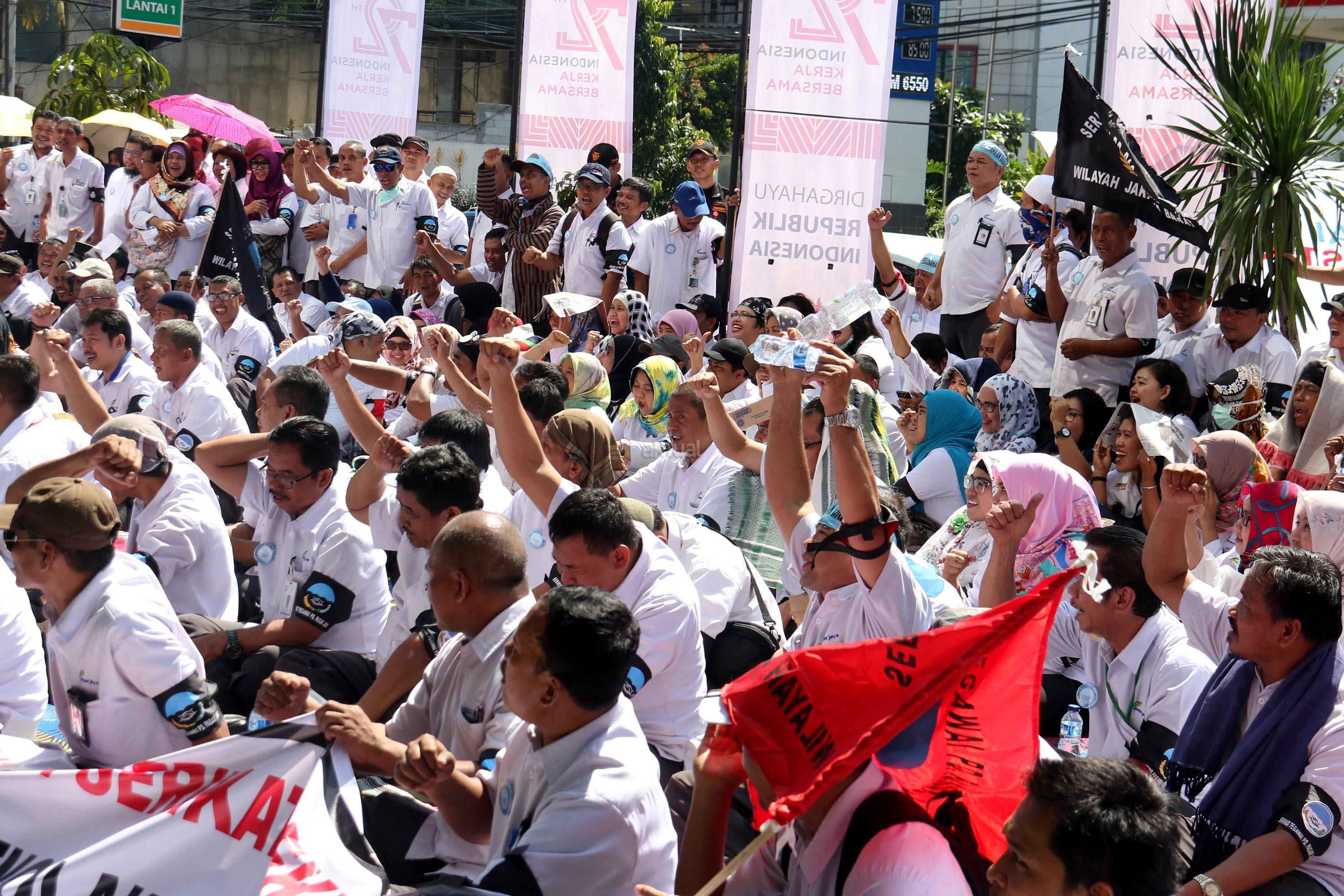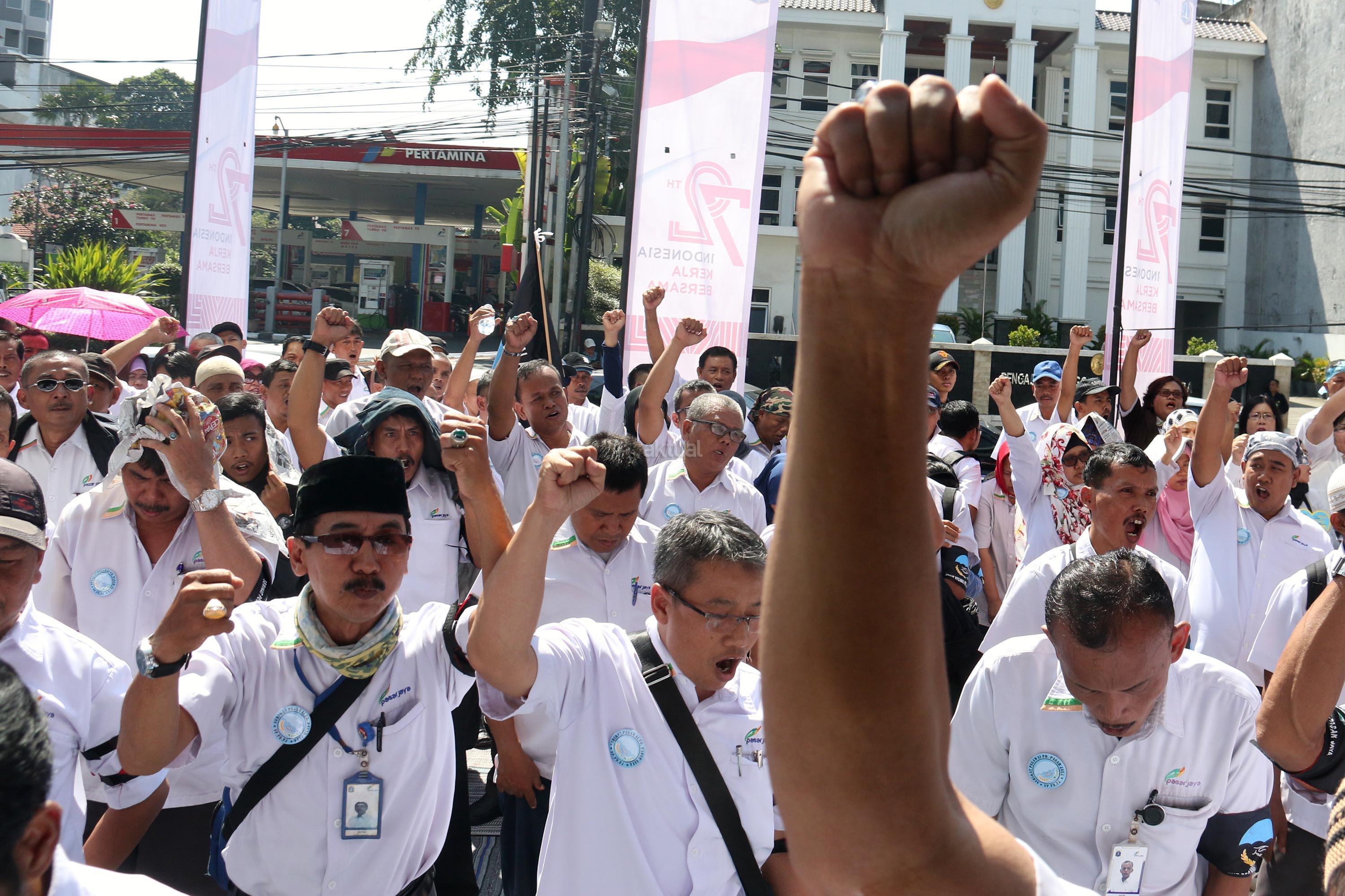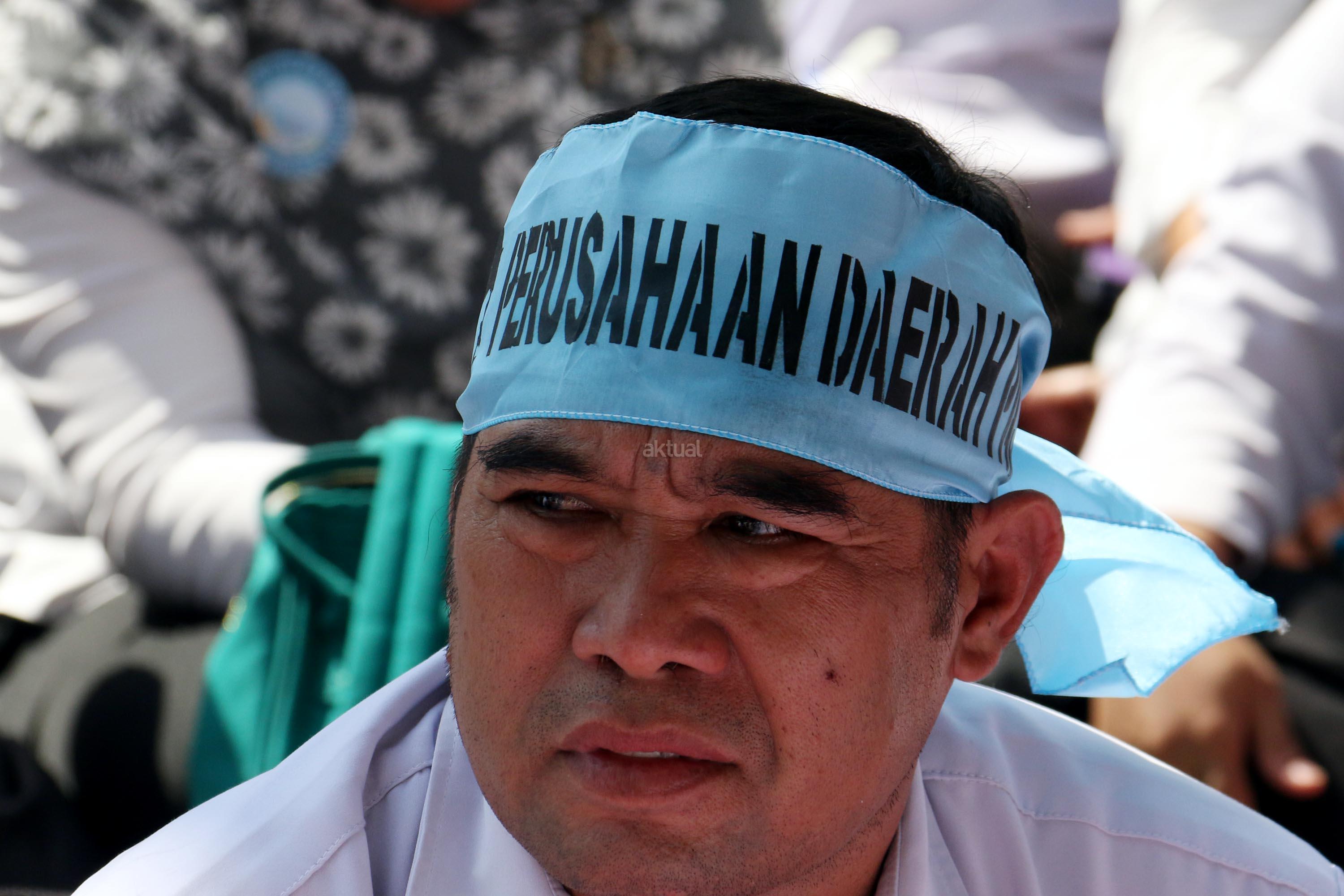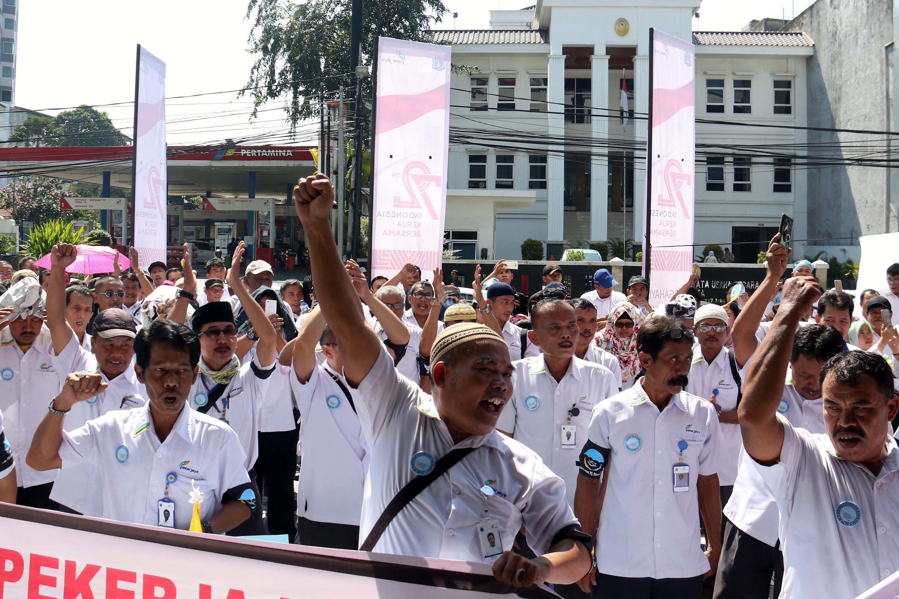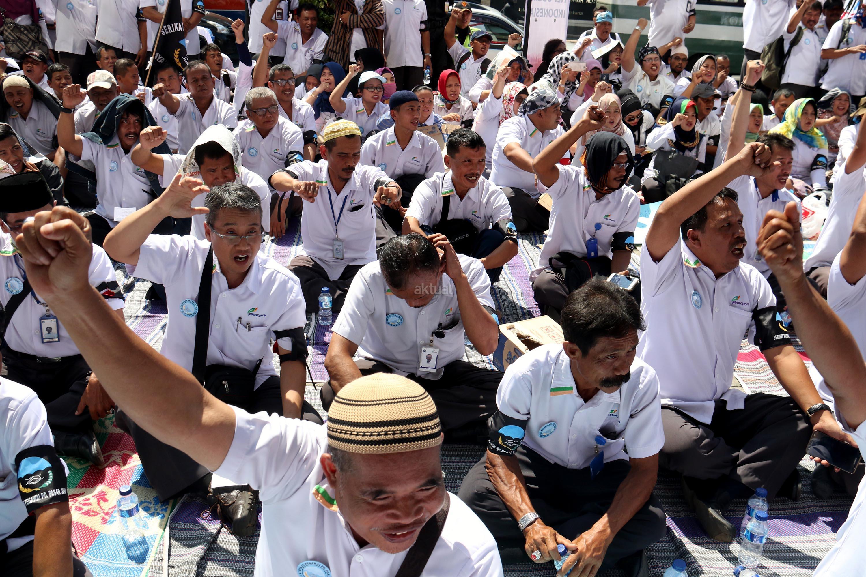 Ratusan karyawan PD Pasar Jaya yang tergabung dalam Serikat Pekerja (SP) Pasar Jaya melakukan aksi unjuk rasa di depan kantor PD Pasar Jaya, Jakarta,. Selasa (2/8/2017). Dalam aksinya para karyawan PD Pasar Jaya menolak tenaga profesional karena tidak sesuai dengan peraturan dan mendesak kepada Dirut PD Pasar Jaya agar mencabut dan batalkan SK Dirut atas pengakatan tenaga profesional menjadi pegawai tetap dan berhentikan 15 orang tenaga profesional yang sudah di angkat menjadi pegawai tetap karena melanggar aturan. AKTUAL/Munzir