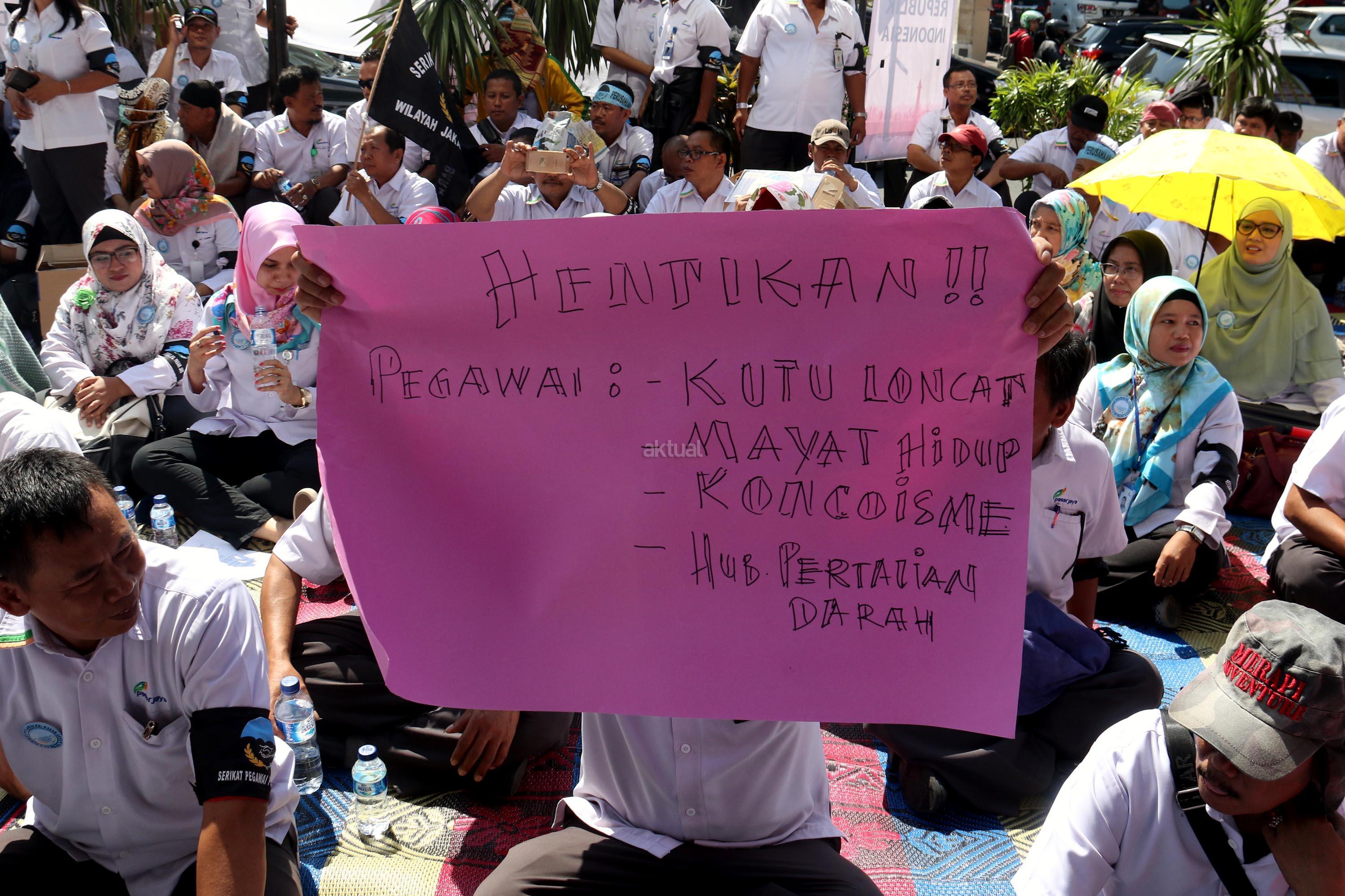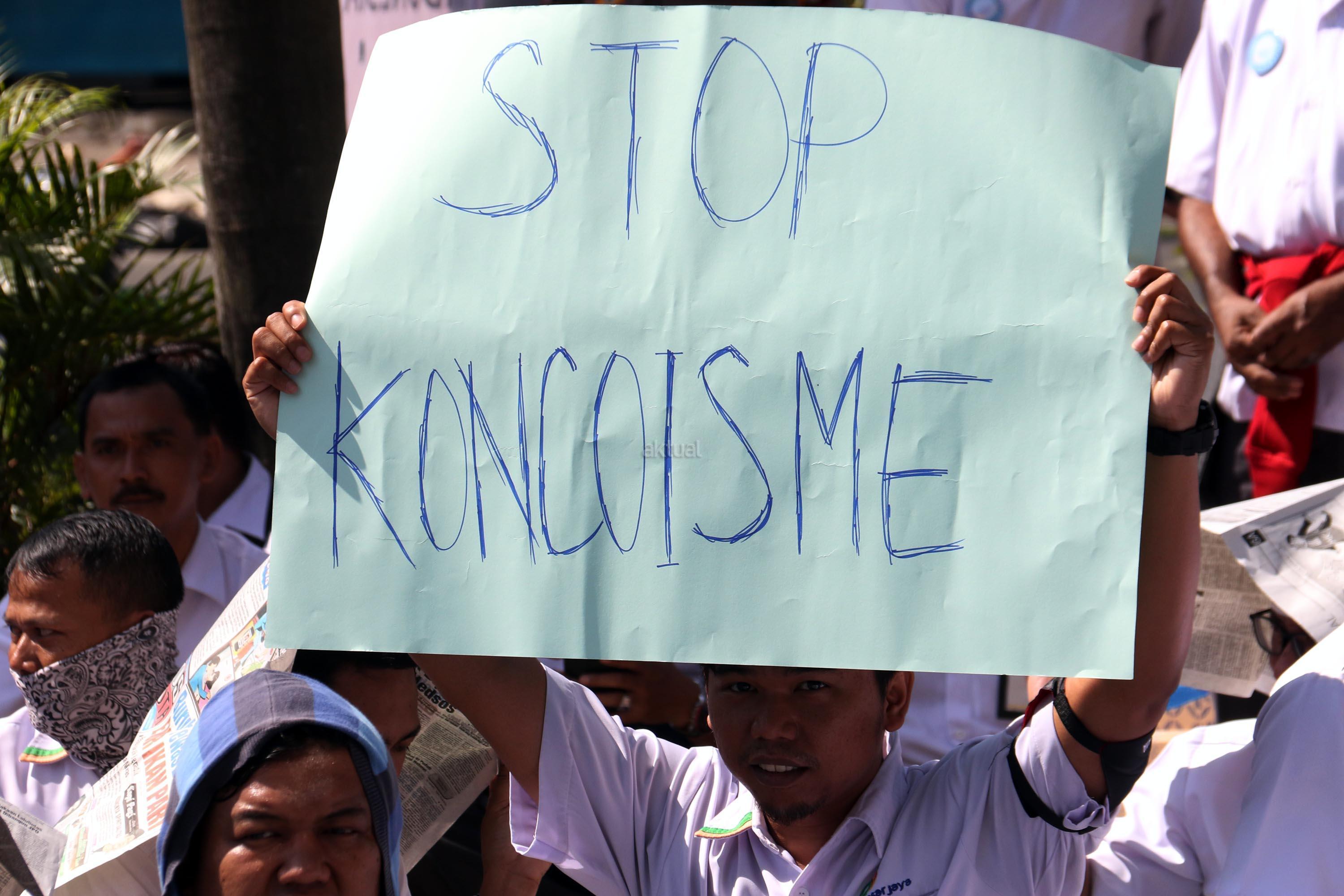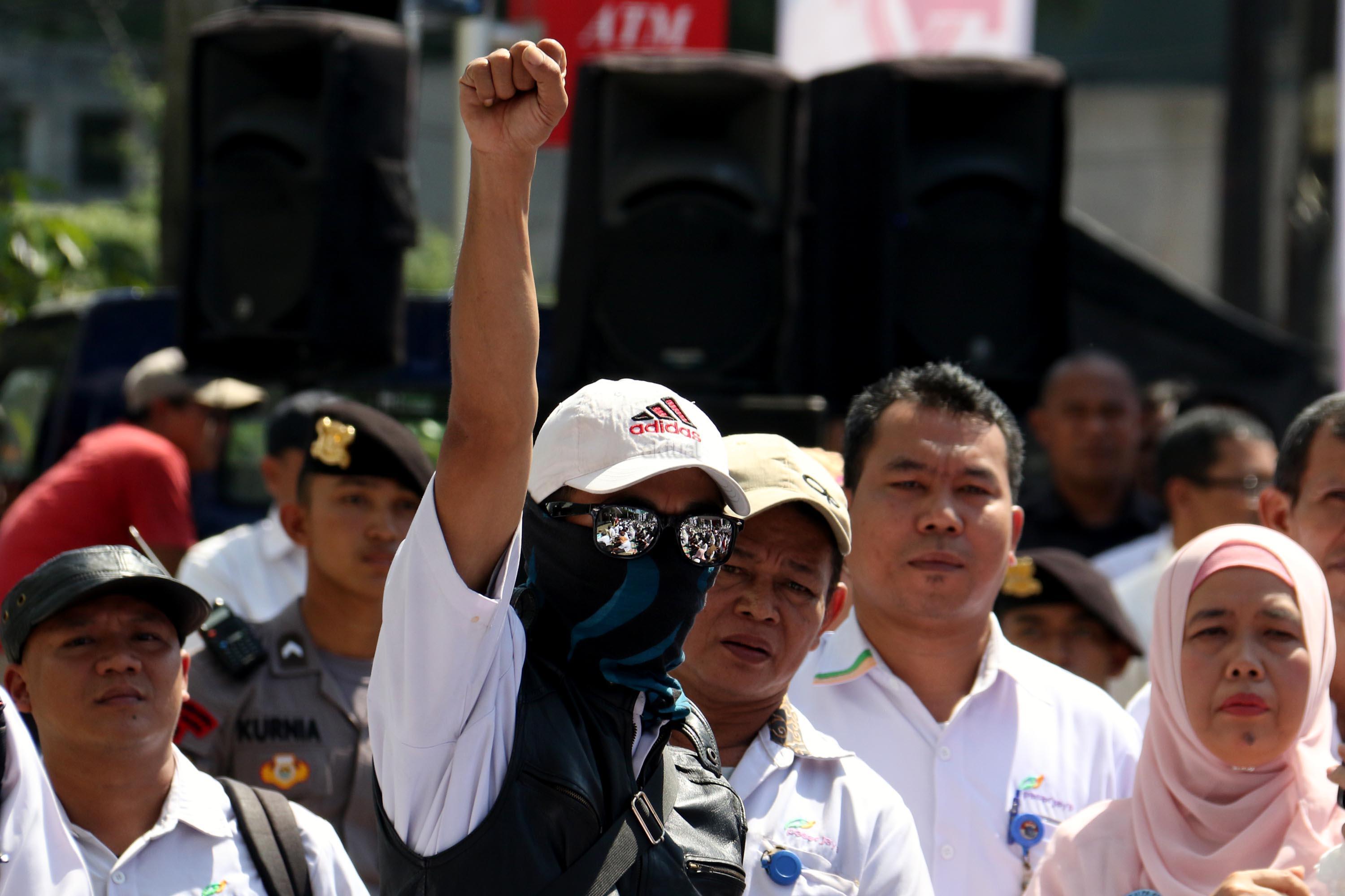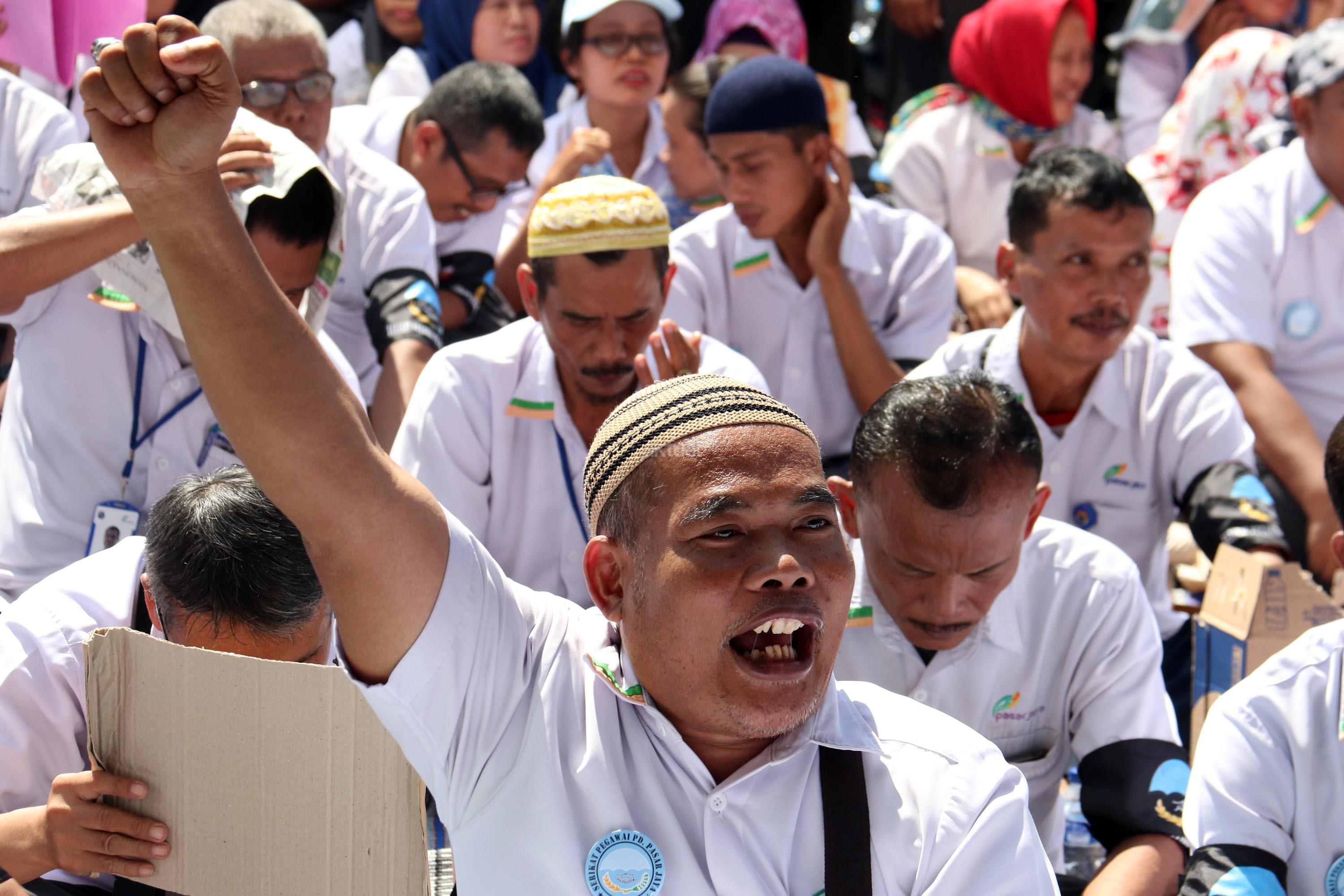 Ratusan karyawan PD Pasar Jaya yang tergabung dalam Serikat Pekerja (SP) Pasar Jaya melakukan aksi unjuk rasa di depan kantor PD Pasar Jaya, Jakarta,. Selasa (2/8/2017). Dalam aksinya para karyawan PD Pasar Jaya menolak tenaga profesional karena tidak sesuai dengan peraturan dan mendesak kepada Dirut PD Pasar Jaya agar mencabut dan batalkan SK Dirut atas pengakatan tenaga profesional menjadi pegawai tetap dan berhentikan 15 orang tenaga profesional yang sudah di angkat menjadi pegawai tetap karena melanggar aturan. AKTUAL/Munzir