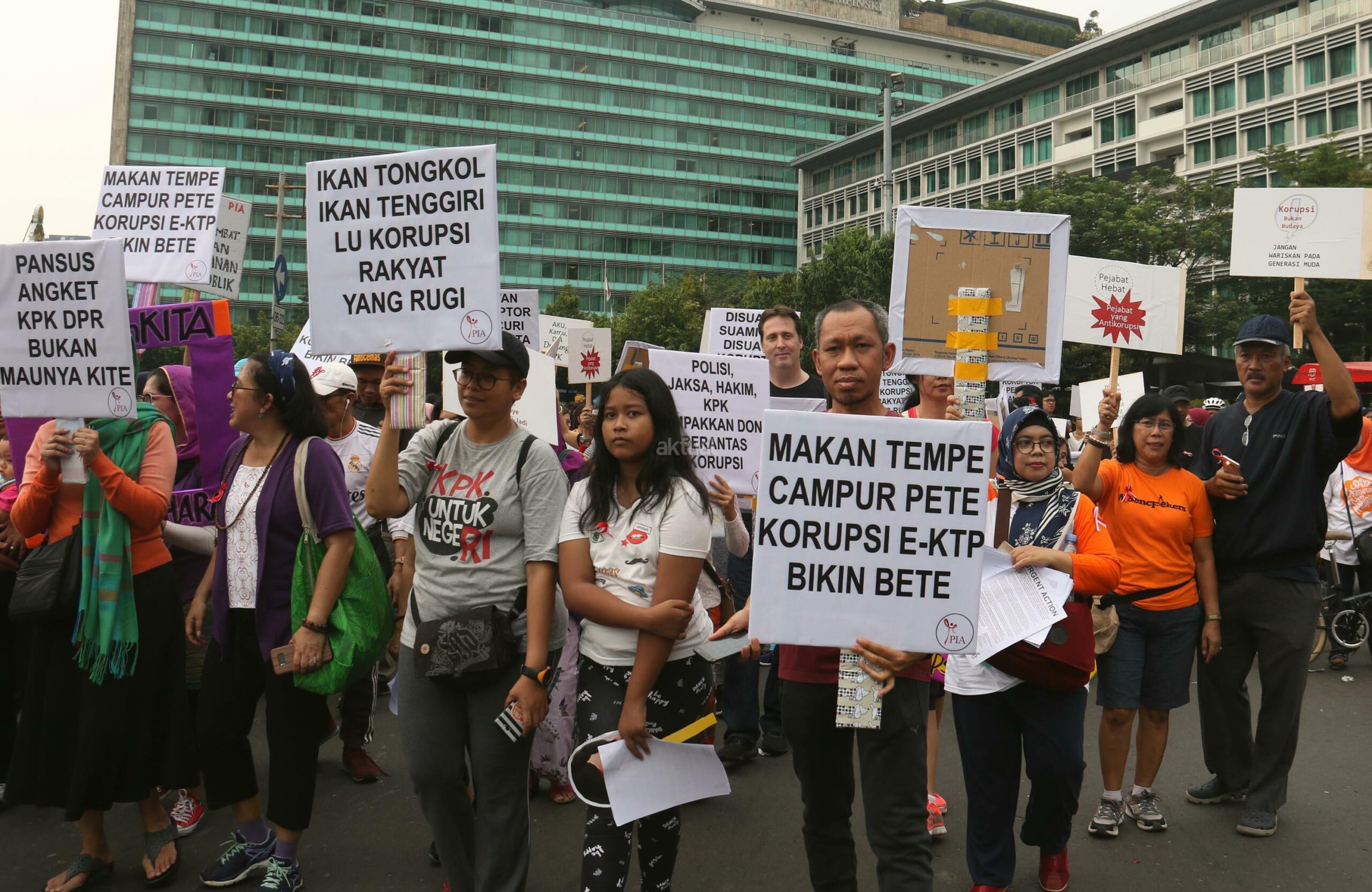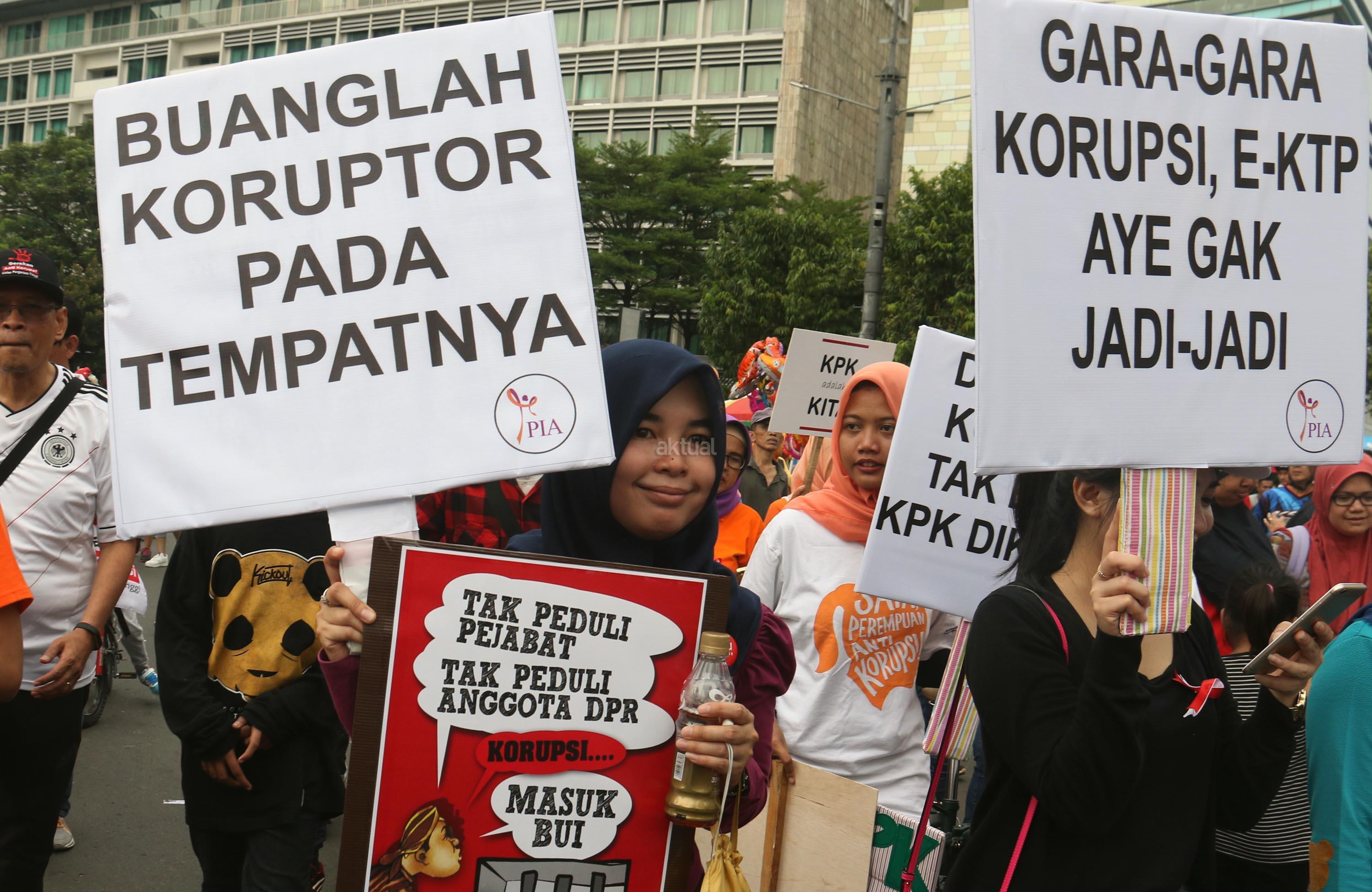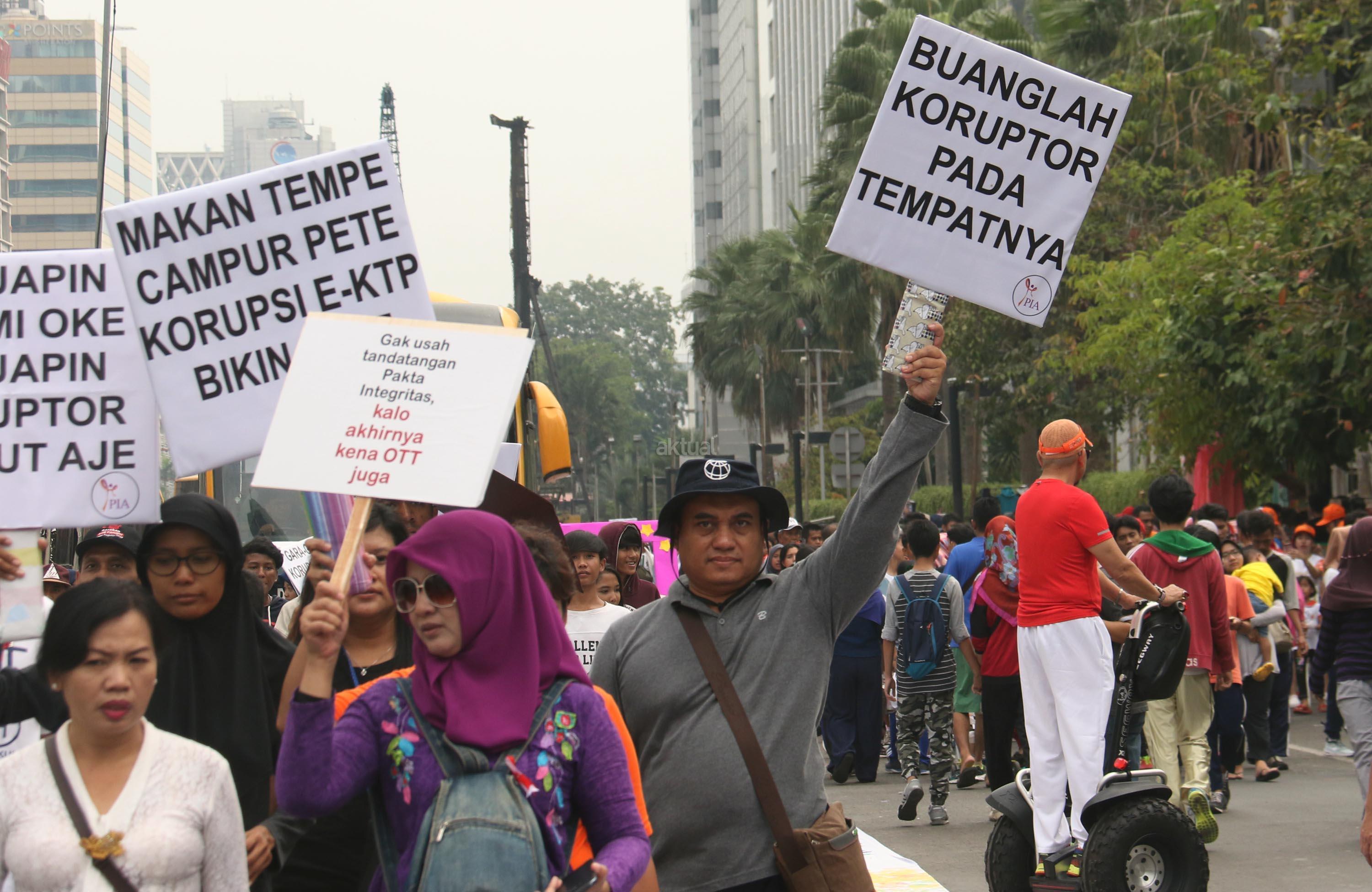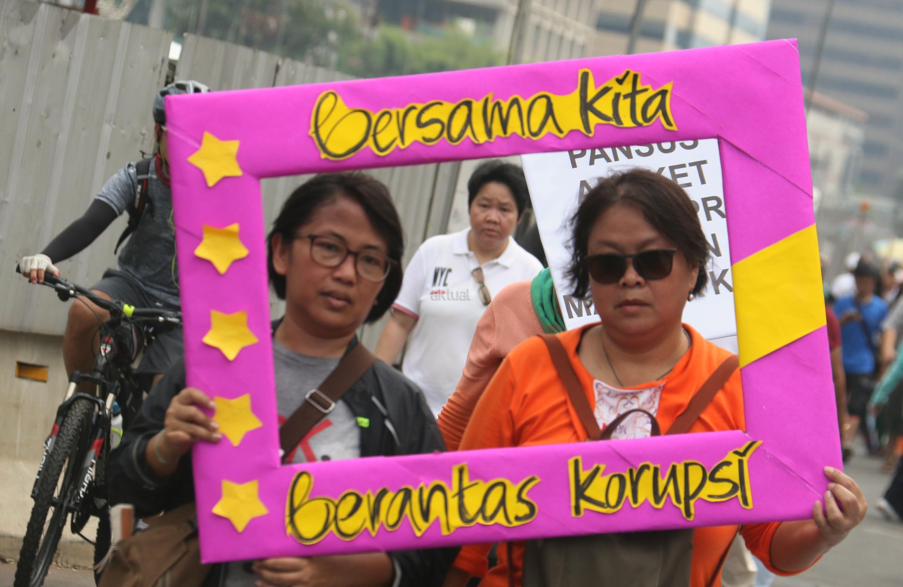 Massa yang tergabung dalam Perempuan Indonesia Anti Korupsi melakukan jalan santai sambil membentangkan spanduk dan poster berisikan antikorupsi saat hari bebas kendaraan bermotor di kawasan Bundaran HI, Jakarta, Minggu (24/9/2017). Kegiatan tersebut guna menggalang dukungan masyarakat terhadap KPK untuk menuntaskan kasus-kasus korupsi besar di Indonesia seperti kasus korupsi KTP Eleketronik (KTP-el). AKTUAL/Munzir