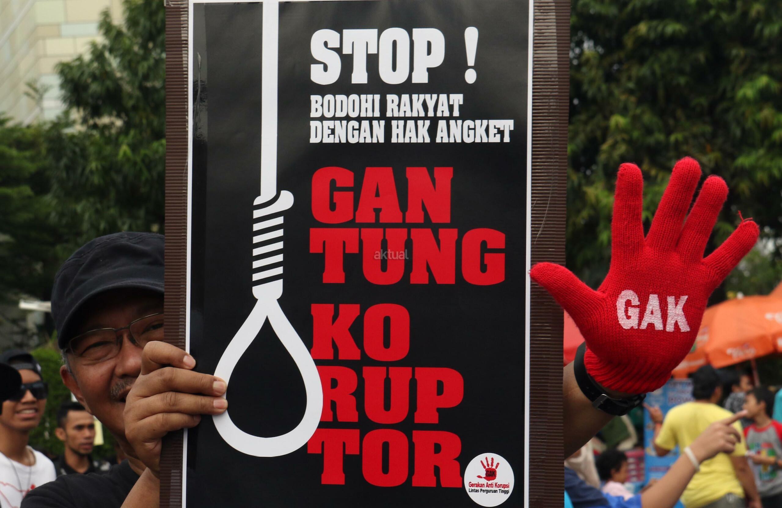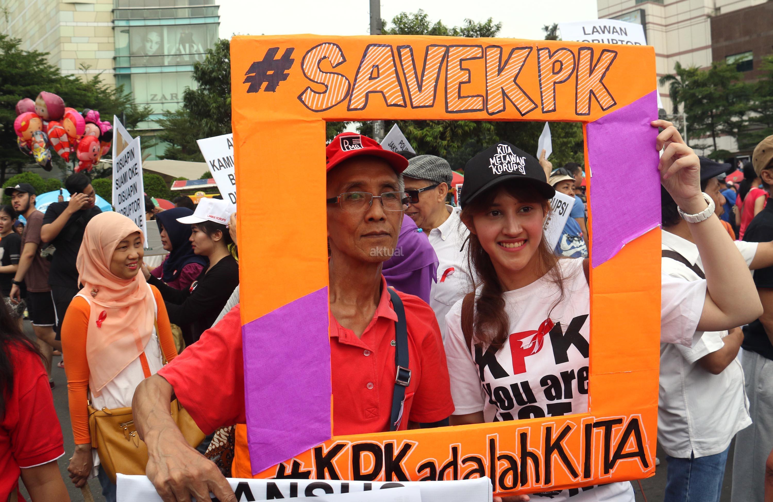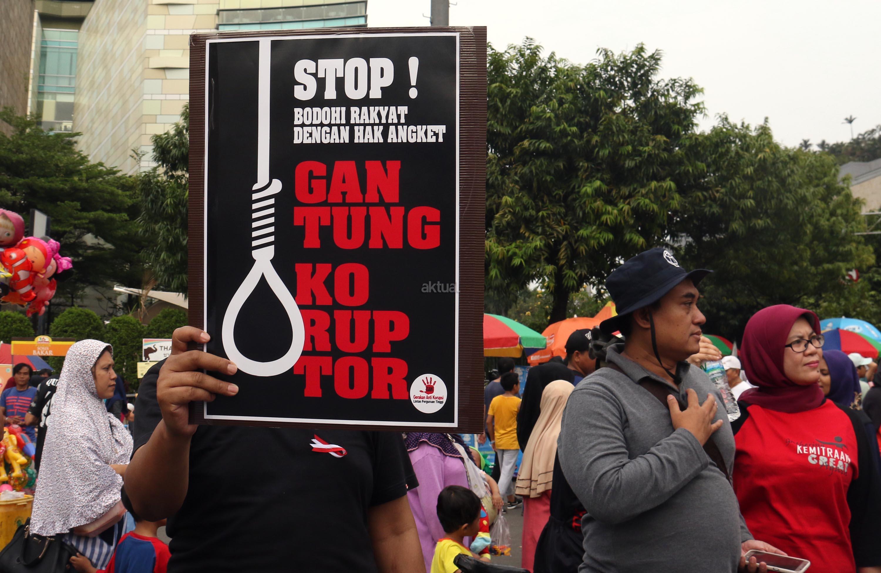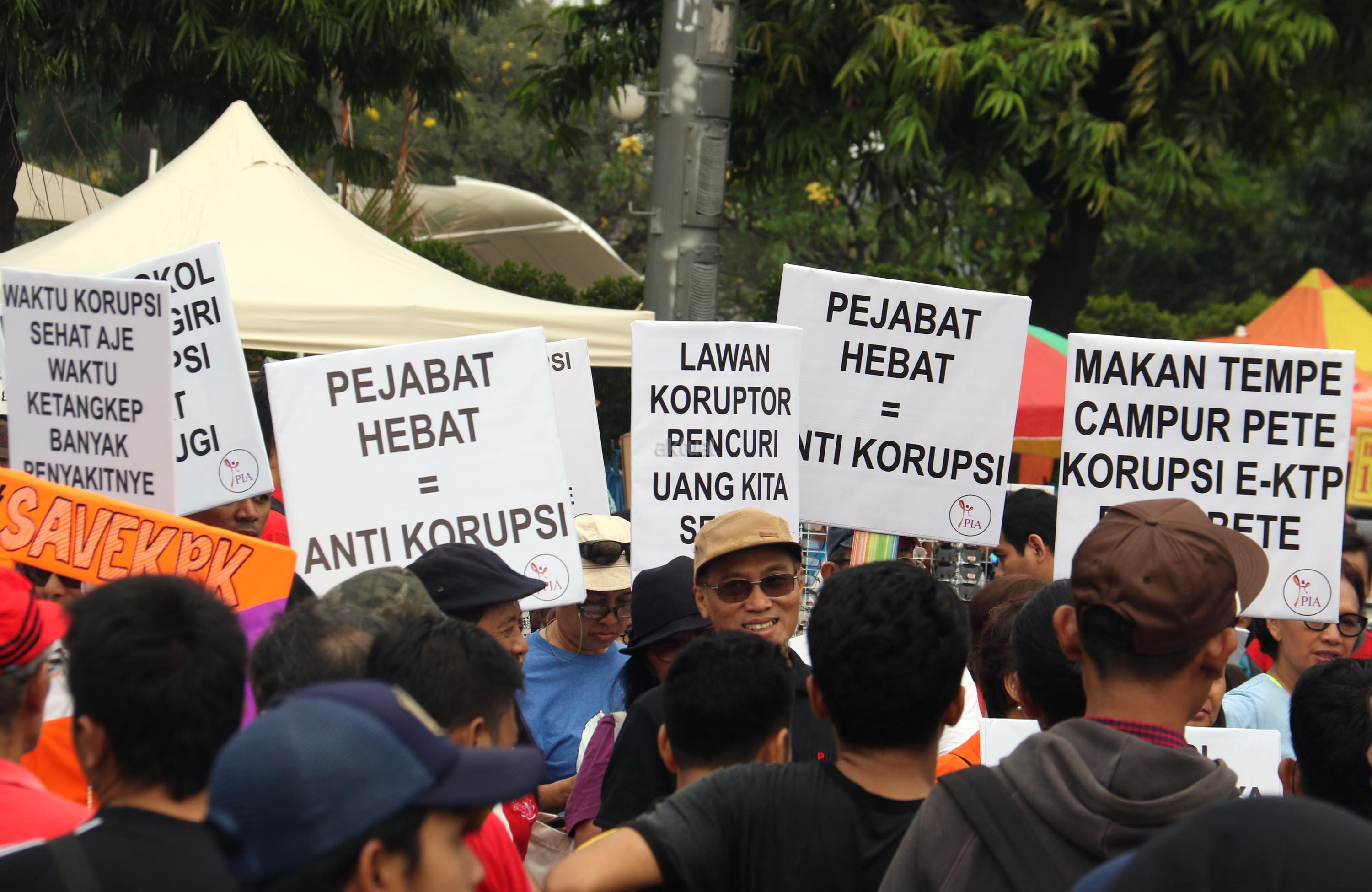 Massa yang tergabung dalam Perempuan Indonesia Anti Korupsi melakukan jalan santai sambil membentangkan spanduk dan poster berisikan antikorupsi saat hari bebas kendaraan bermotor di kawasan Bundaran HI, Jakarta, Minggu (24/9/2017). Kegiatan tersebut guna menggalang dukungan masyarakat terhadap KPK untuk menuntaskan kasus-kasus korupsi besar di Indonesia seperti kasus korupsi KTP Eleketronik (KTP-el). AKTUAL/Munzir