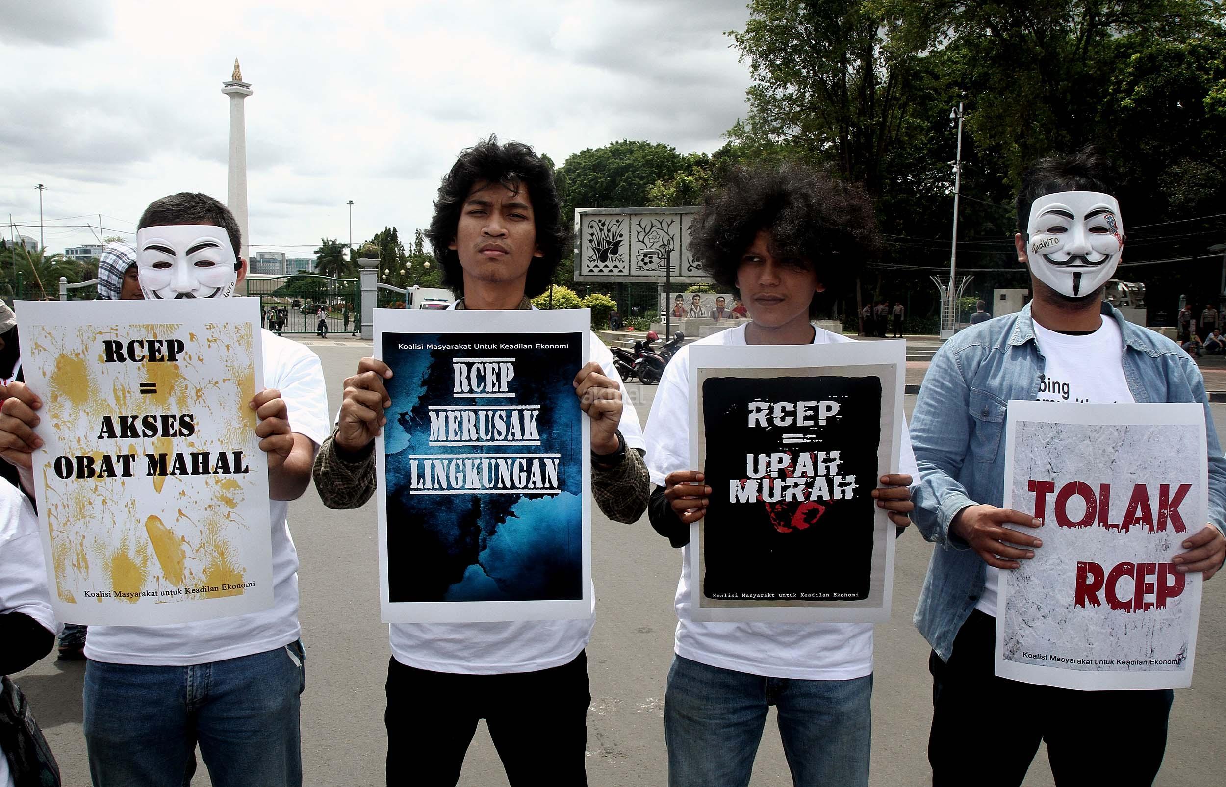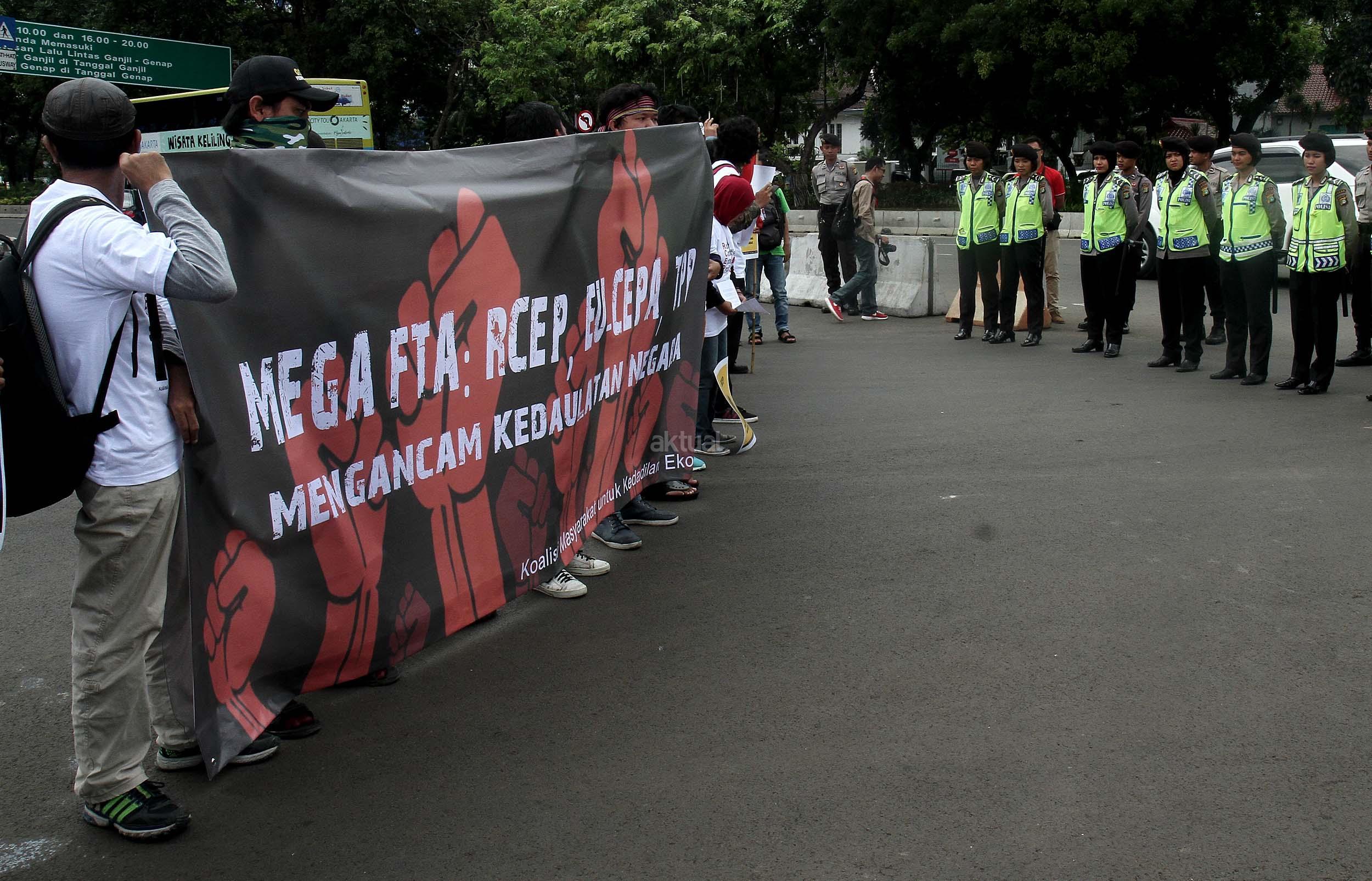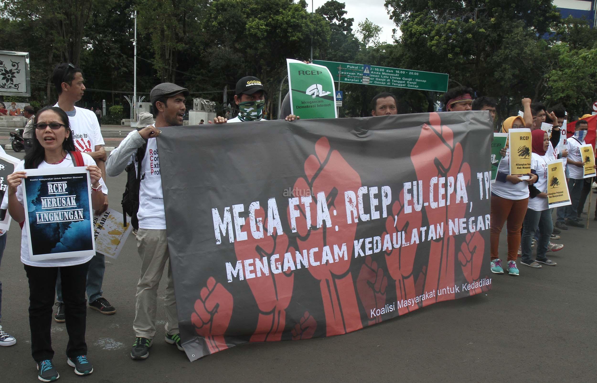 Puluhan aktivis yang tergabung dalam Koalisi Masyarakat Indonesia Untuk Keadilan melakukan aksi di depan Istana Merdeka, Jakarta, Selasa (6/12/2016). Dalam aksinya para aktivis Koalisi Masyarakat Indonesia untuk Keadilan mendesak kepada pemerintahan Jokowi-JK untuk menolak perundingan Regional Comprehensive Economic Patnership (RCEP) dan menolak Indonesia menjadi tuan rumah dalam perundingan ke -16 perjanjian RCEP.