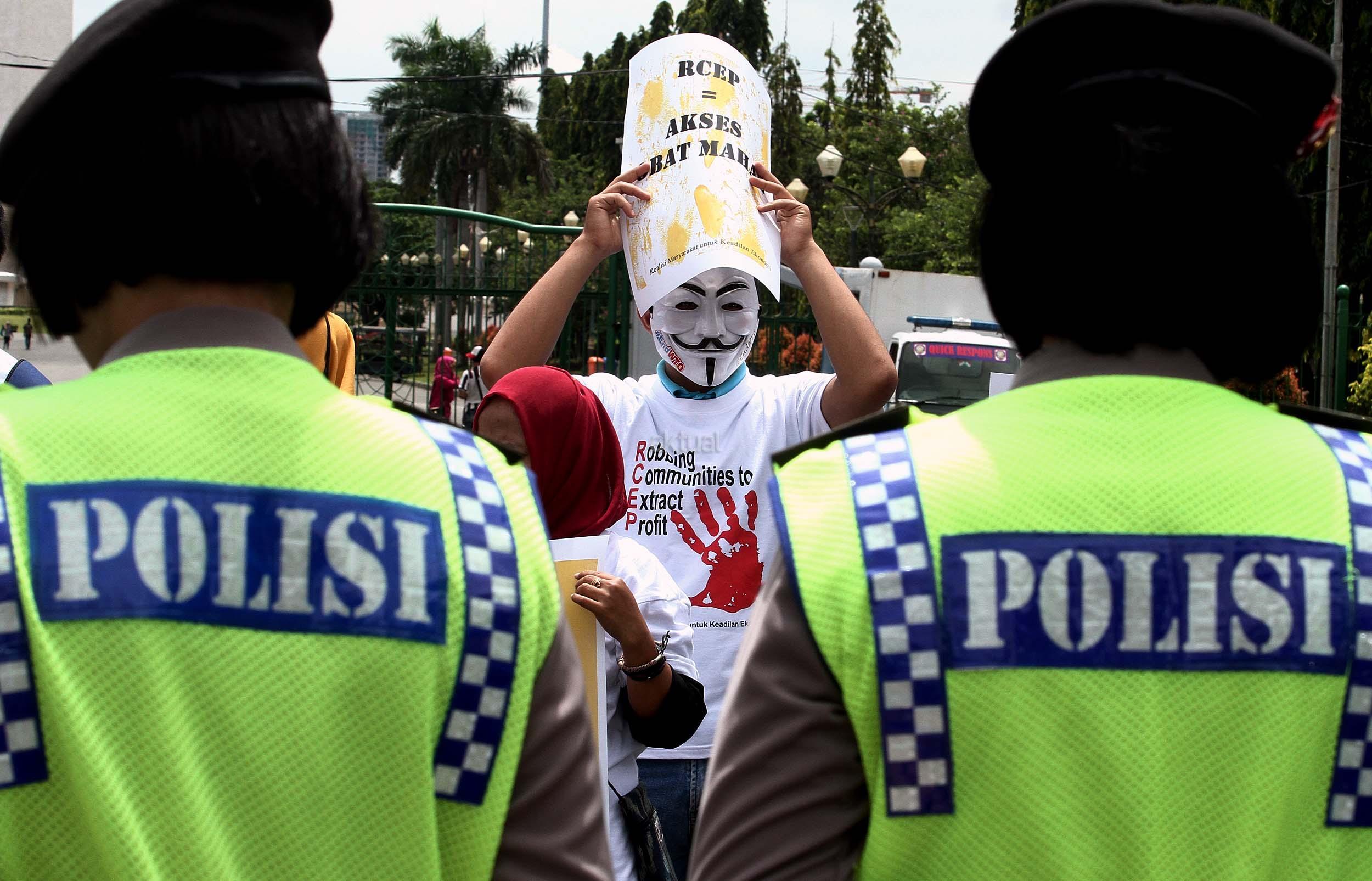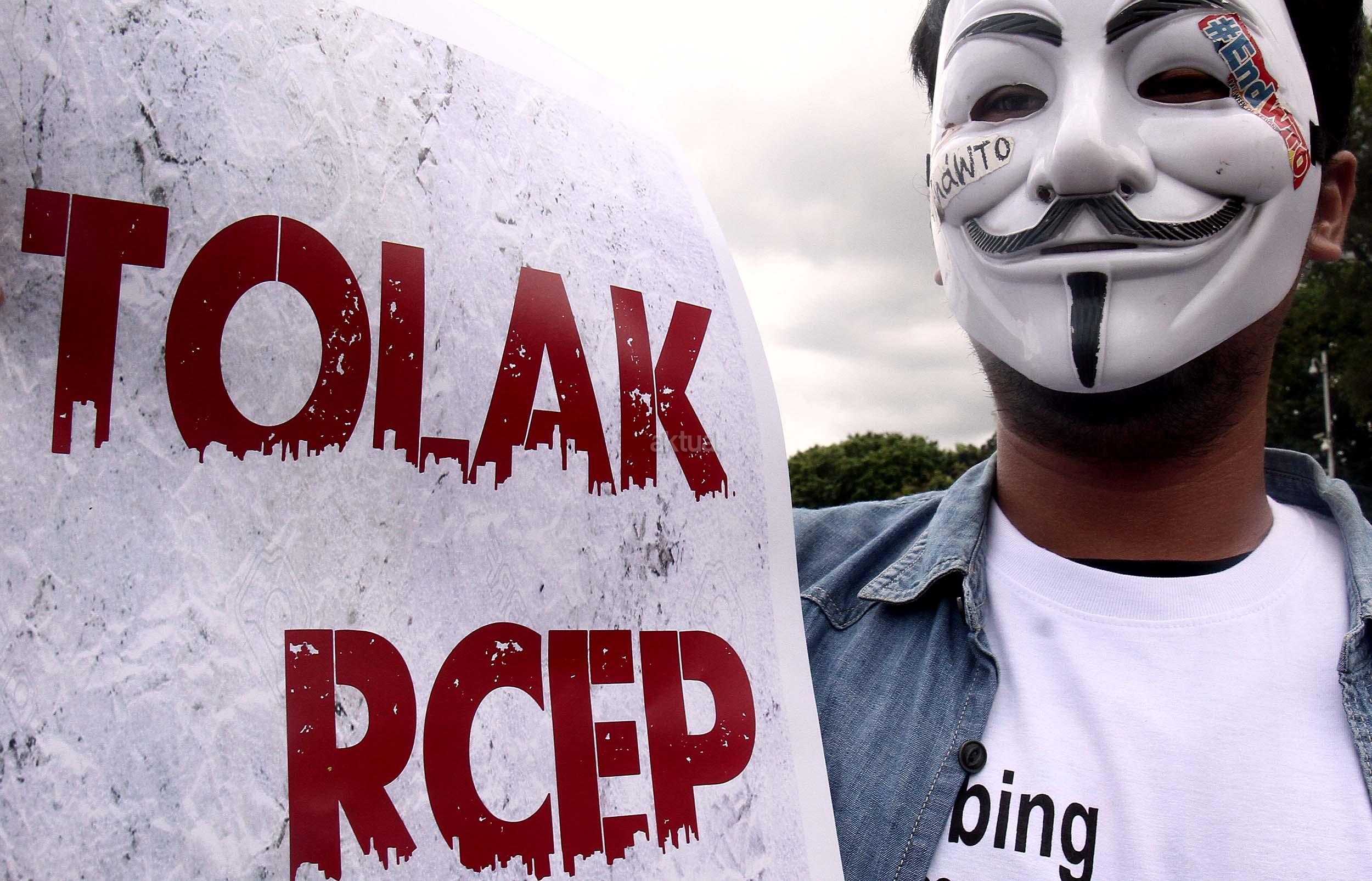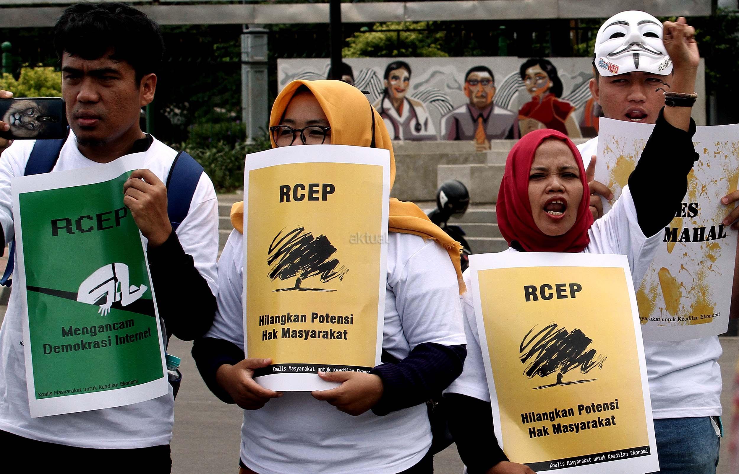 Puluhan aktivis yang tergabung dalam Koalisi Masyarakat Indonesia Untuk Keadilan melakukan aksi di depan Istana Merdeka, Jakarta, Selasa (6/12/2016). Dalam aksinya para aktivis Koalisi Masyarakat Indonesia untuk Keadilan mendesak kepada pemerintahan Jokowi-JK untuk menolak perundingan Regional Comprehensive Economic Patnership (RCEP) dan menolak Indonesia menjadi tuan rumah dalam perundingan ke -16 perjanjian RCEP.
