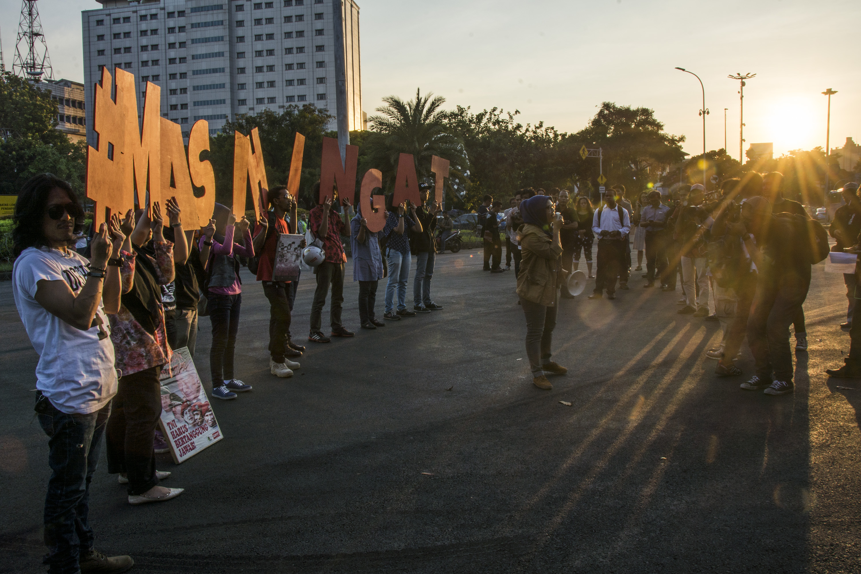 Aktivis Komisi untuk Orang Hilang dan Korban Tindak Kekerasan (KontraS) menggelar aksi unjuk rasa di depan Istana Merdeka, Jakarta, Rabu (27/7). Dalam aksinya mereka menolak terpilihnya Ketua Partai Hati Nurani Rakyat (HANURA) Wiranto sebagai Menteri Kordinator Politik, Hukum, dan Keamanan (Menkopolhukam) yang baru saja diumumkan oleh Presiden Joko Widodo pada hari ini, Rabu (27/7), KontraS menilai Wiranto harus bertanggung jawab terhadap beberapa pelanggaran hak asasi manusia (HAM), seperti penyerangan kantor DPP Partai Demokrasi Indonesia pada 27 Juli 1996, tragedi Trisakti dan Semanggi, serta penculikan dan penghilangan aktivis. ANTARA FOTO/Aprillio Akbar/pd/16.