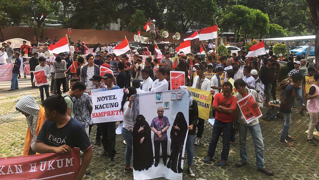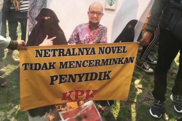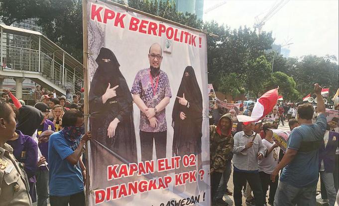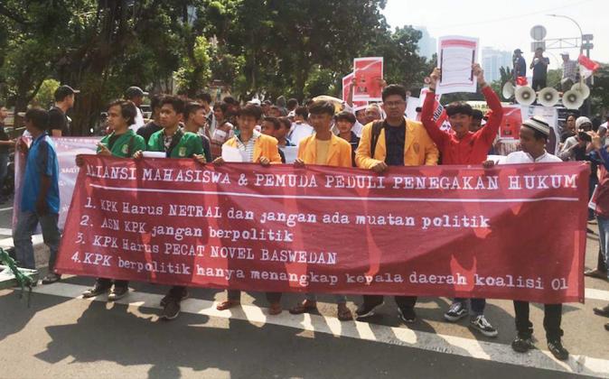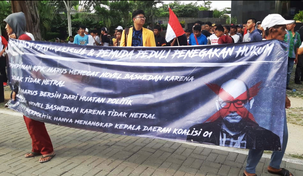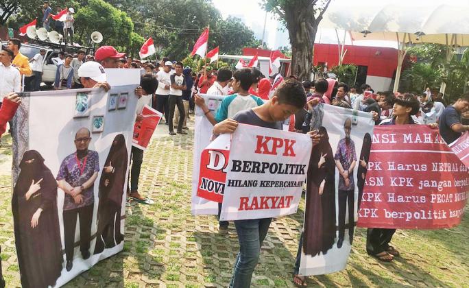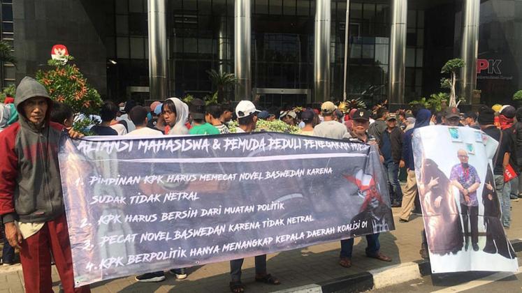 Sejumlah massa mengatasnamakan Aliansi Mahasiswa dan Pemuda Peduli Penegakan Hukum melakukan aksi unjuk rasa membawa poster dan spanduk di depan gedung KPK, Jakarta, Jumat (3/5). Mereka menuntut KPK bersih dari muatan politik karena diduga penyidik senior KPK Novel Baswedan ditunggani keberpihakan terhadap partai politik untuk kepentingan pilpres. AKTUAL/Tino Oktaviano