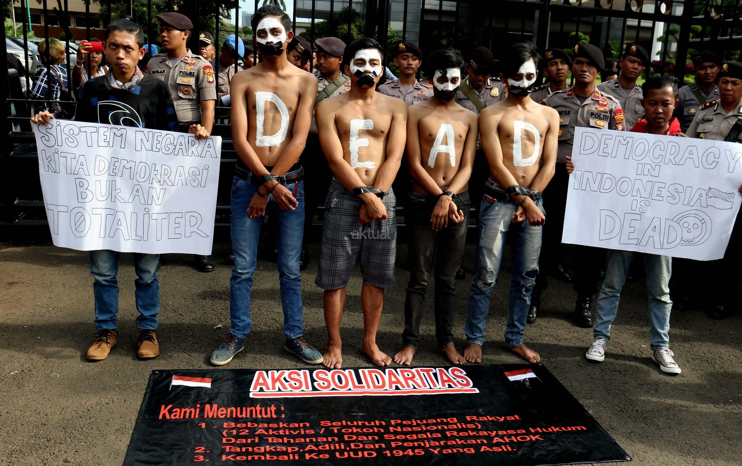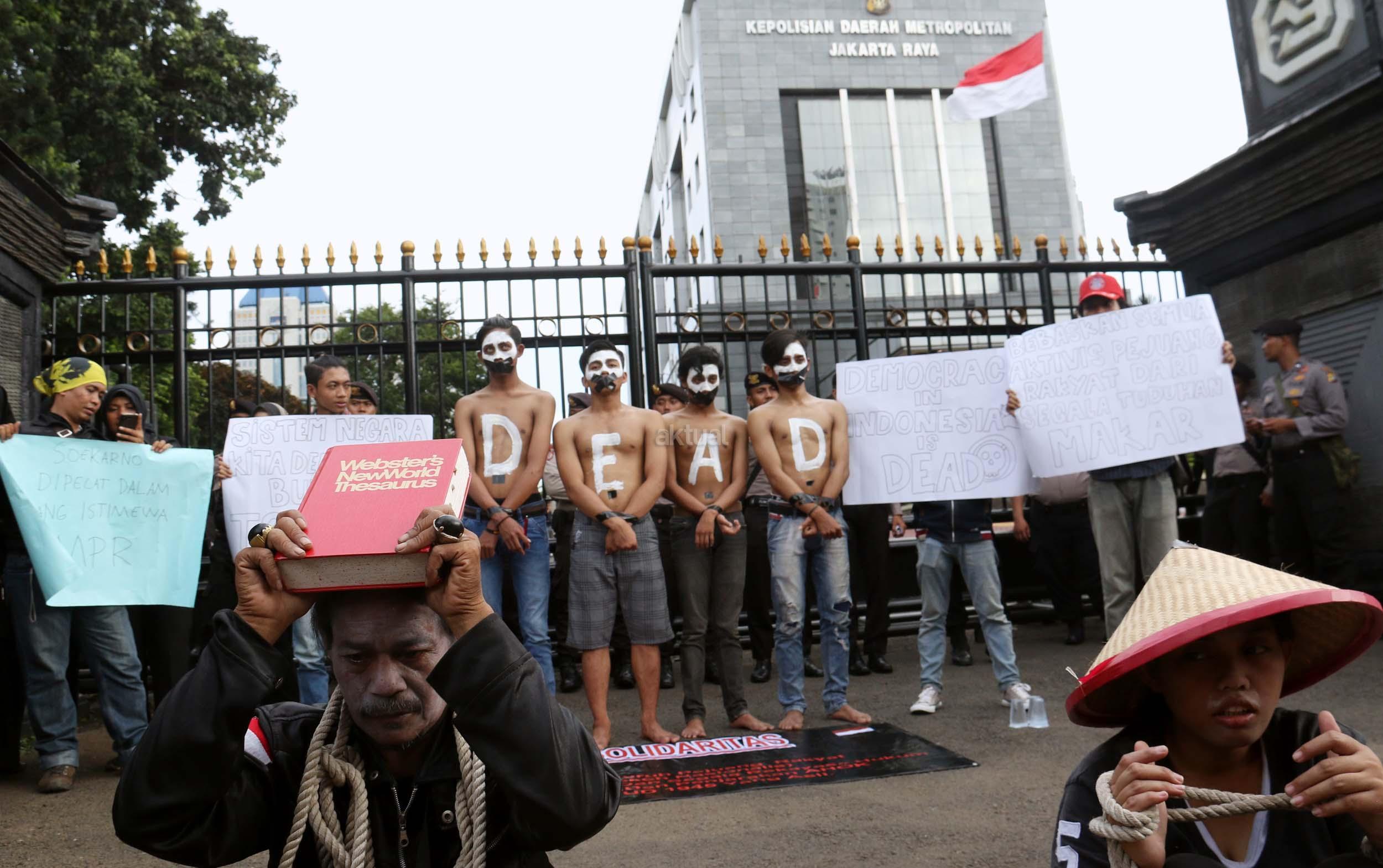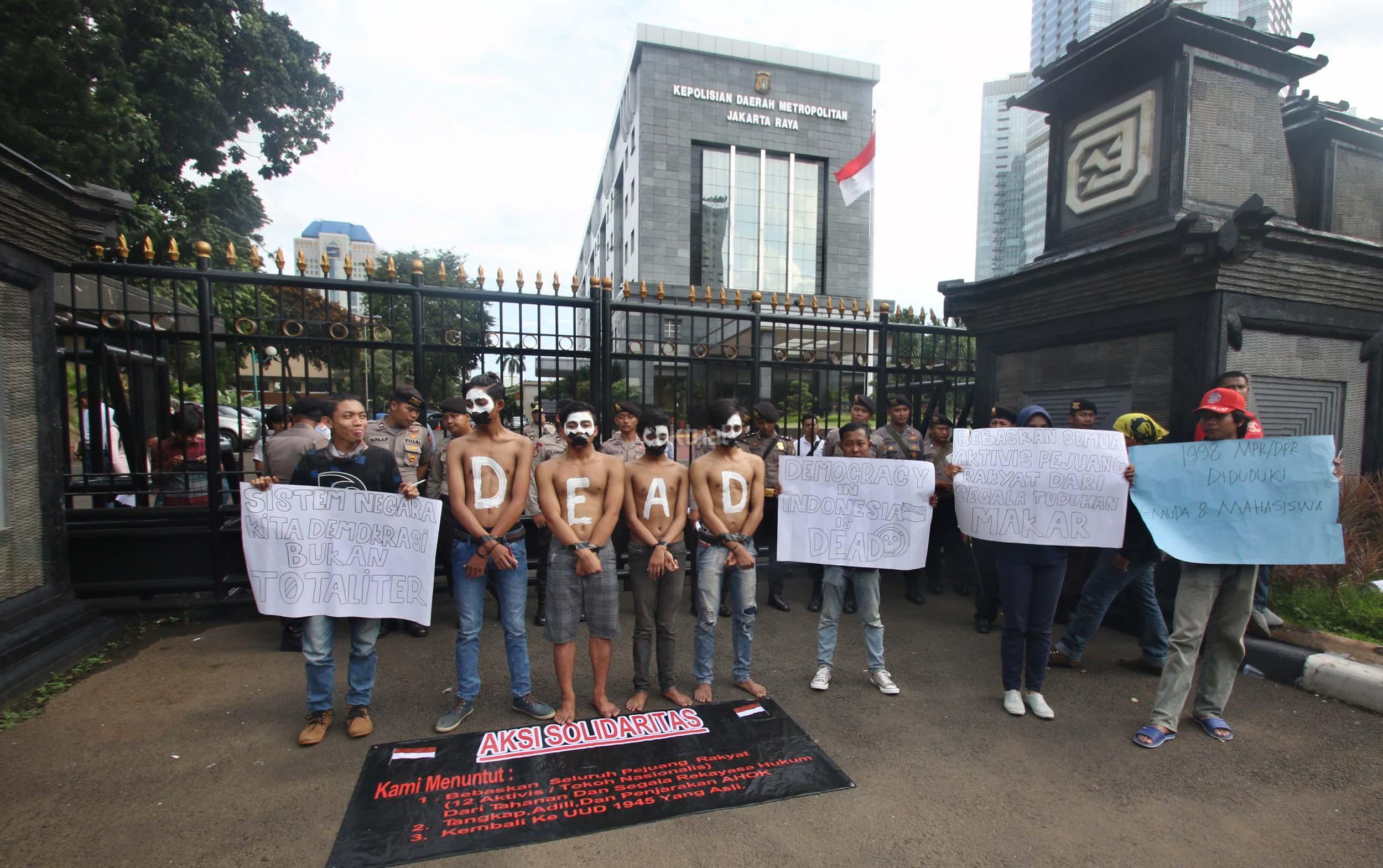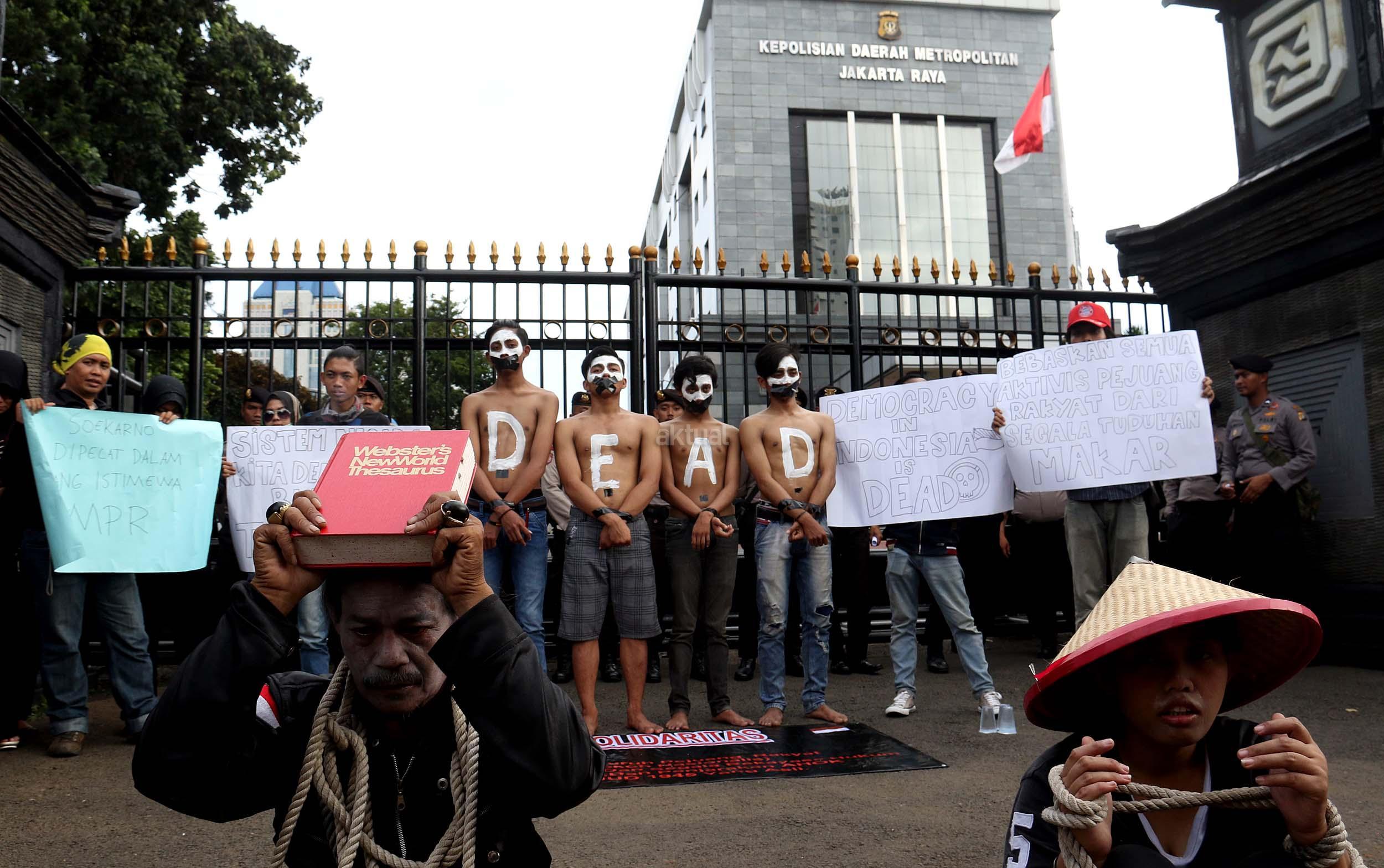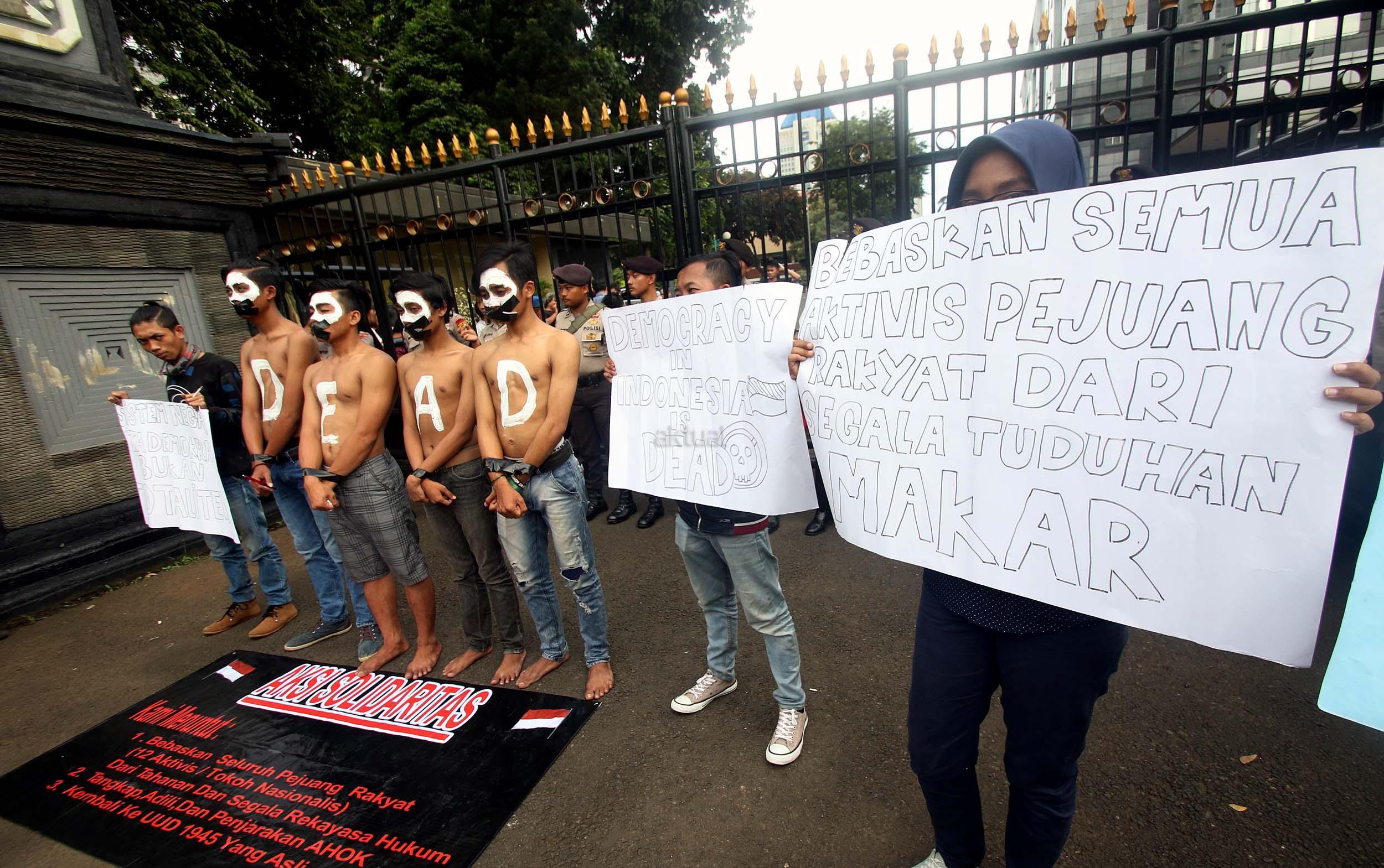Sejumlah aktivis yang tergabung dalam Aksi Solidaritas Penyelamat Demokrasi (ASPD) melakukan aksi teatrikal didepan gedung Polda Metro Jaya, Jakarta, Jumat (9/12/2016). Dalam aksinya mereka menuntut agar kepolisian membebaskan semua aktivis pejuang rakyat yang di penjara dari segela tuduhan serta menuntut untuk menangkap dan memenjarakan tersangka penista agama. AKTUAL/Munzir