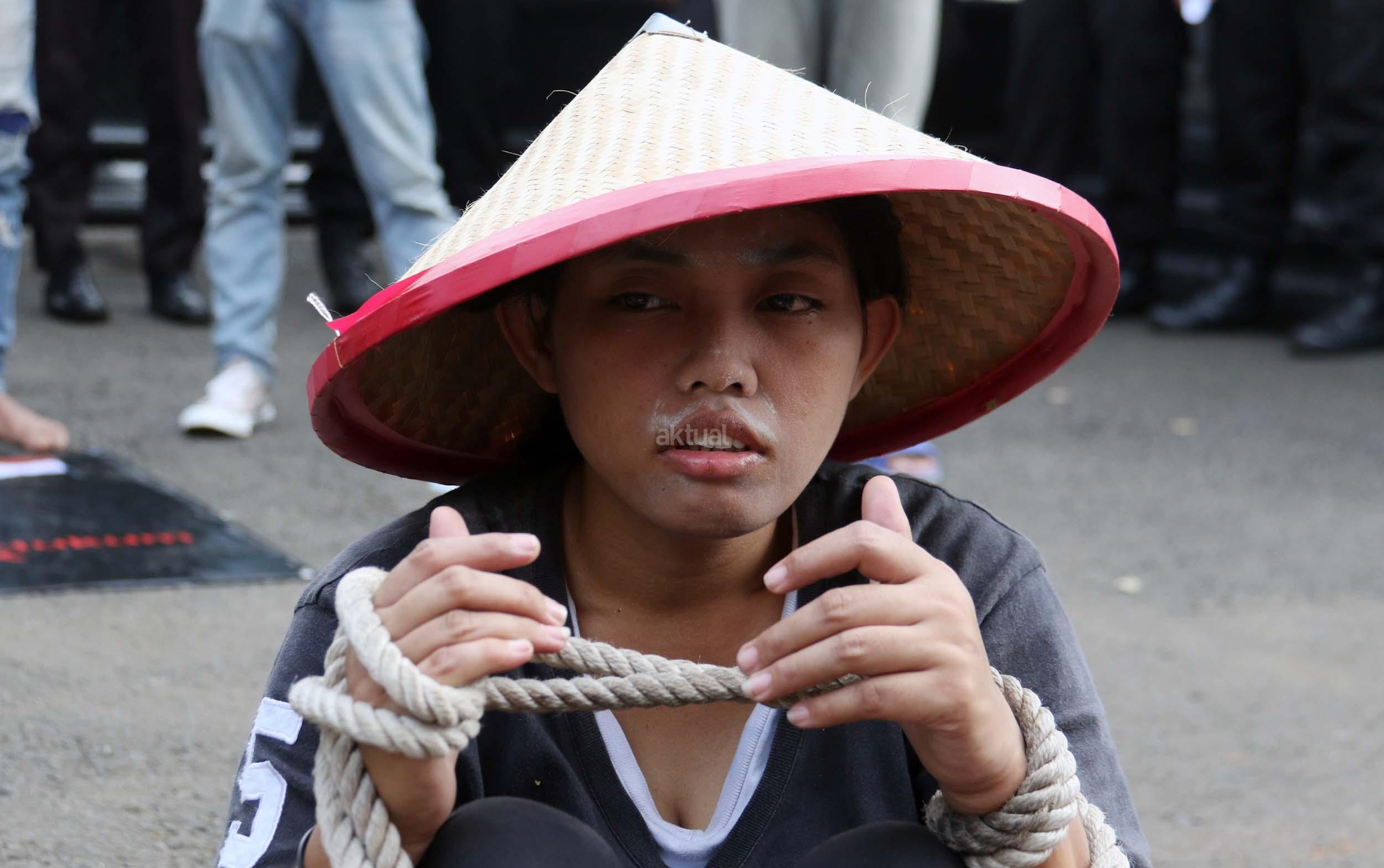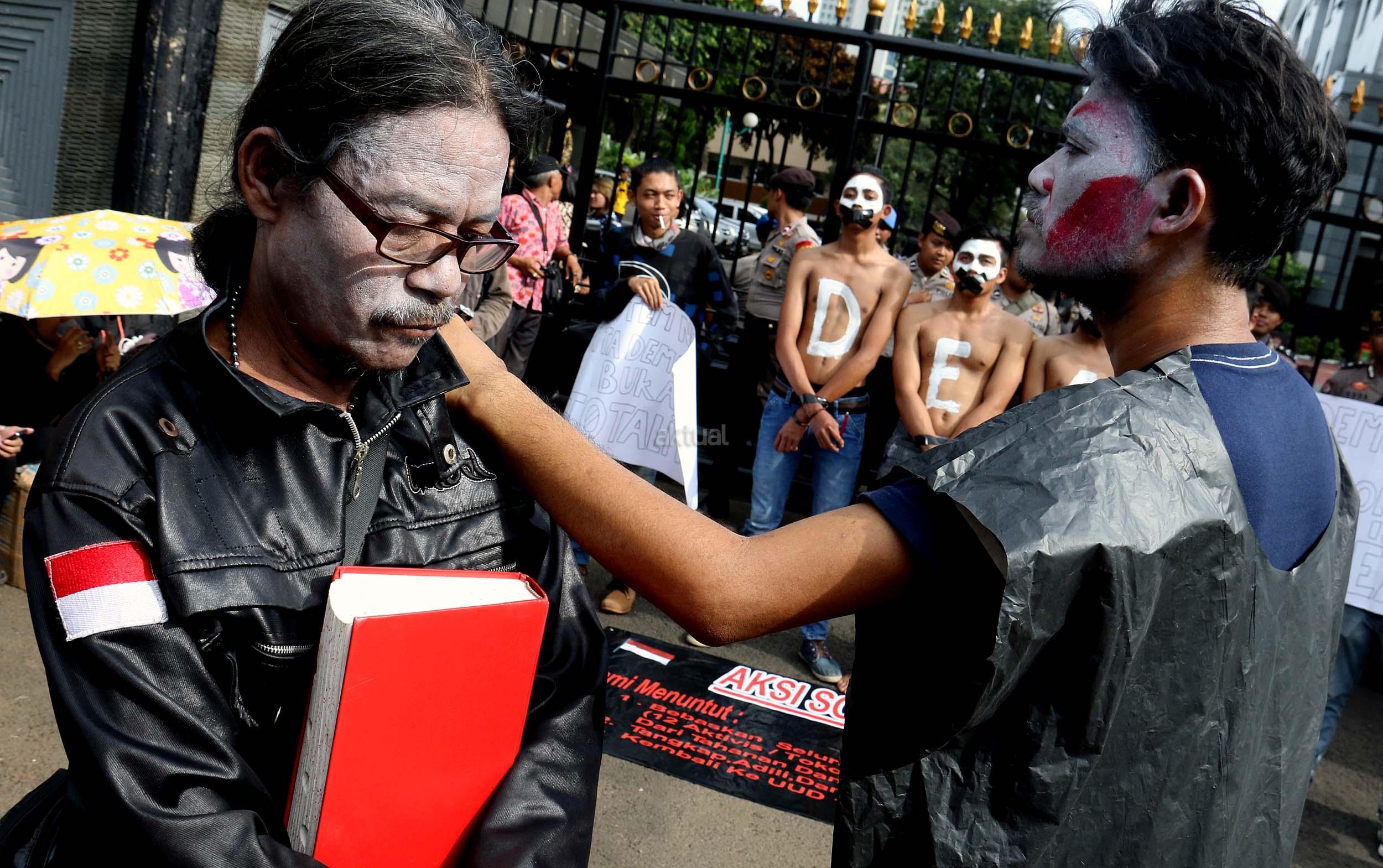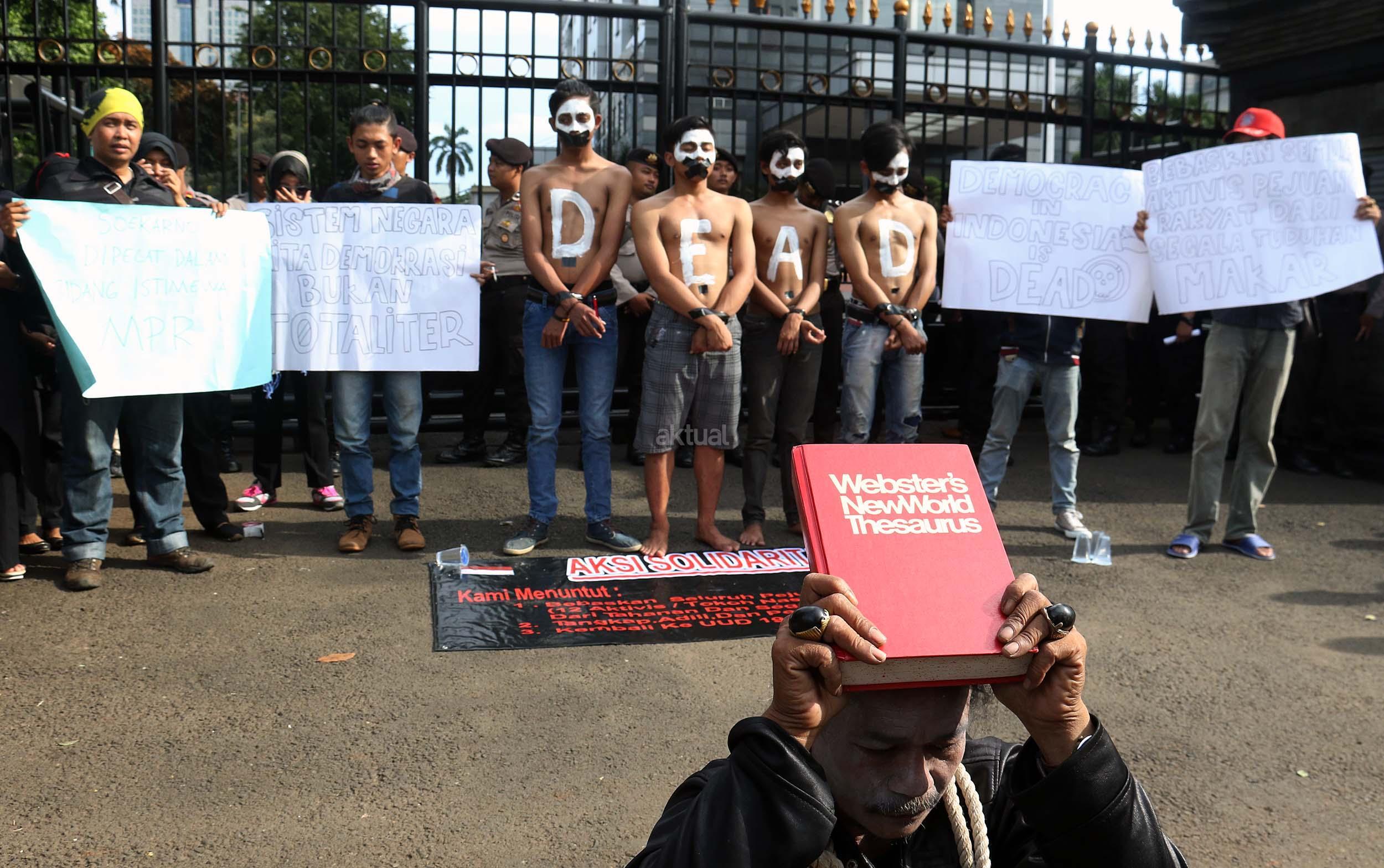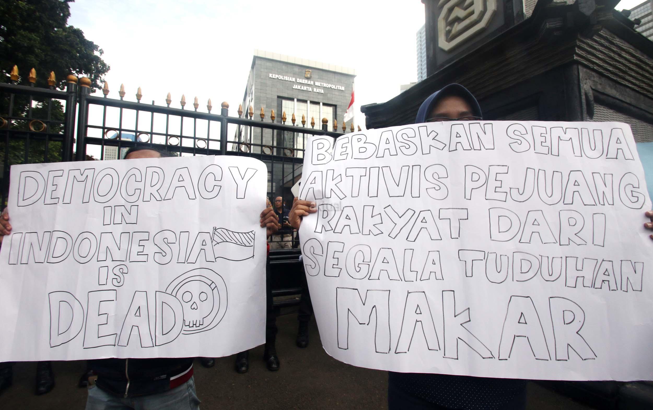 Sejumlah aktivis yang tergabung dalam Aksi Solidaritas Penyelamat Demokrasi (ASPD) melakukan aksi teatrikal didepan gedung Polda Metro Jaya, Jakarta, Jumat (9/12/2016). Dalam aksinya mereka menuntut agar kepolisian membebaskan semua aktivis pejuang rakyat yang di penjara dari segela tuduhan serta menuntut untuk menangkap dan memenjarakan tersangka penista agama. AKTUAL/Munzir