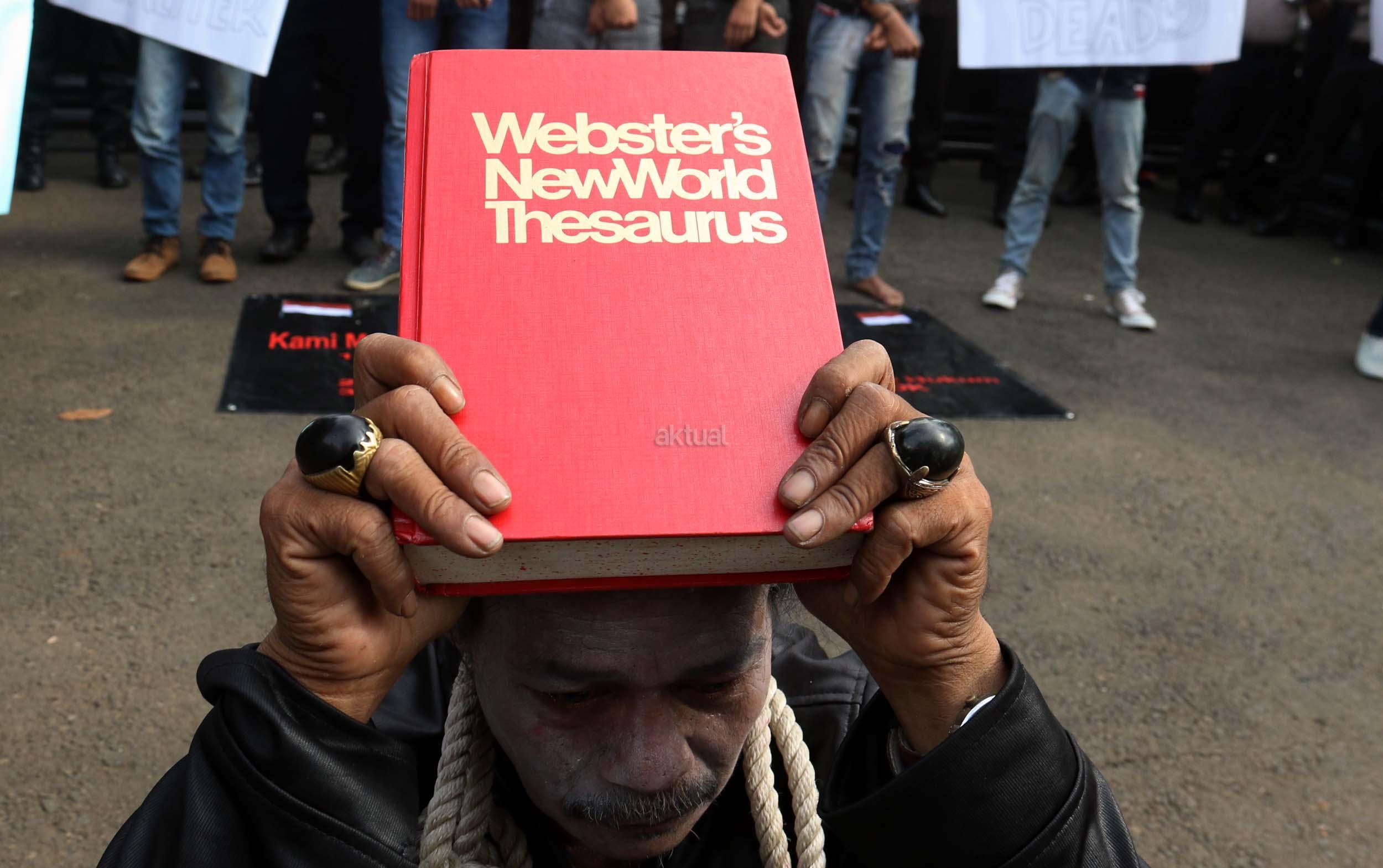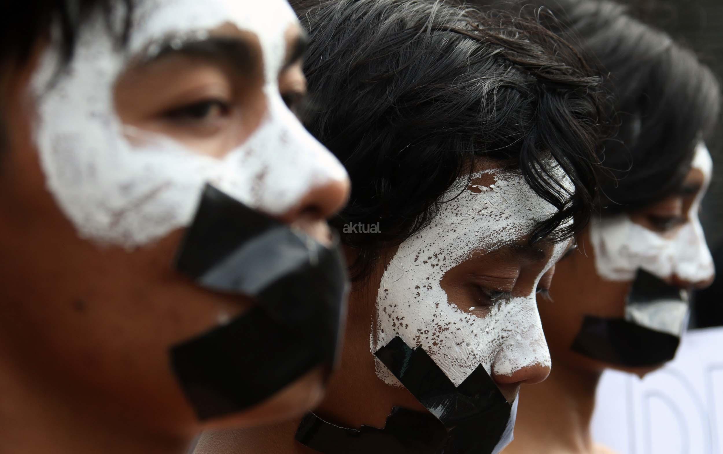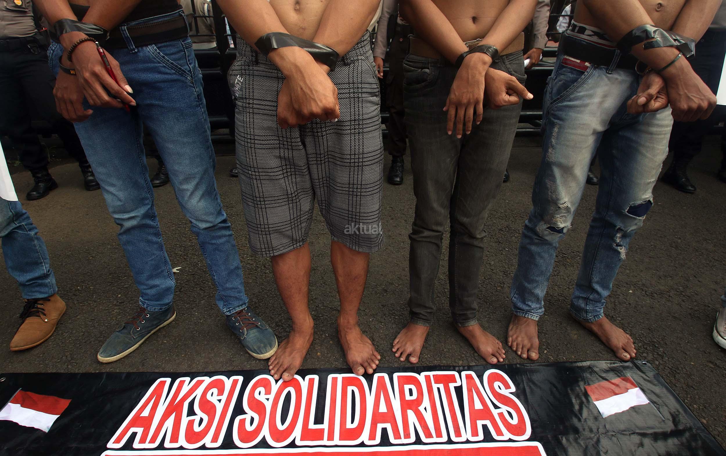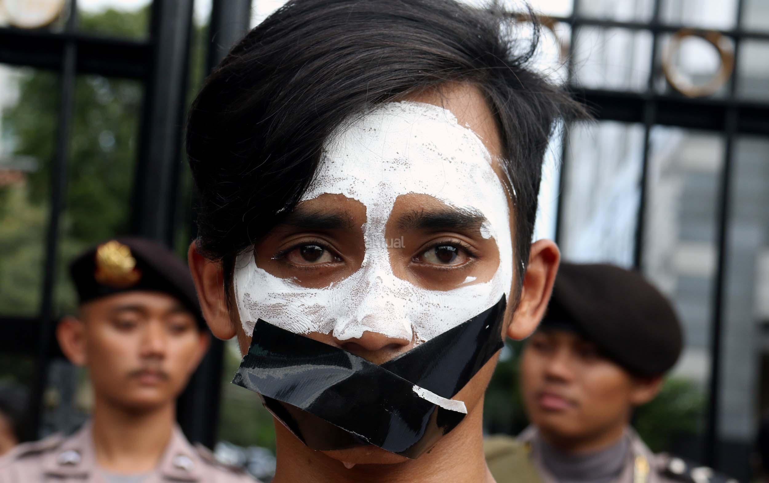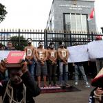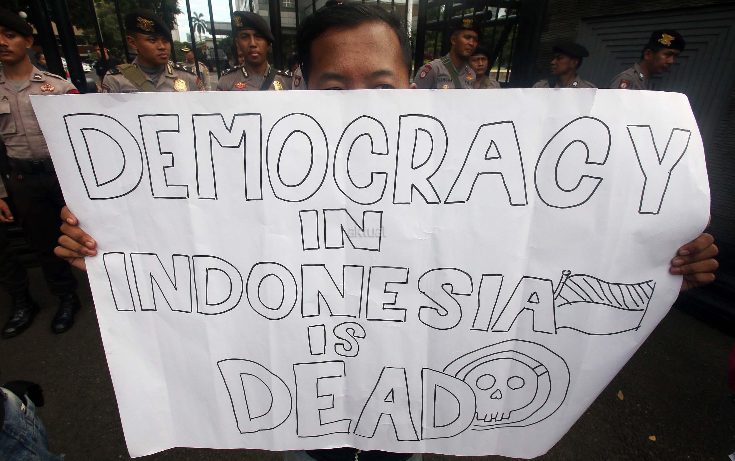 Sejumlah aktivis yang tergabung dalam Aksi Solidaritas Penyelamat Demokrasi (ASPD) melakukan aksi teatrikal didepan gedung Polda Metro Jaya, Jakarta, Jumat (9/12/2016). Dalam aksinya mereka menuntut agar kepolisian membebaskan semua aktivis pejuang rakyat yang di penjara dari segela tuduhan serta menuntut untuk menangkap dan memenjarakan tersangka penista agama. AKTUAL/Munzir