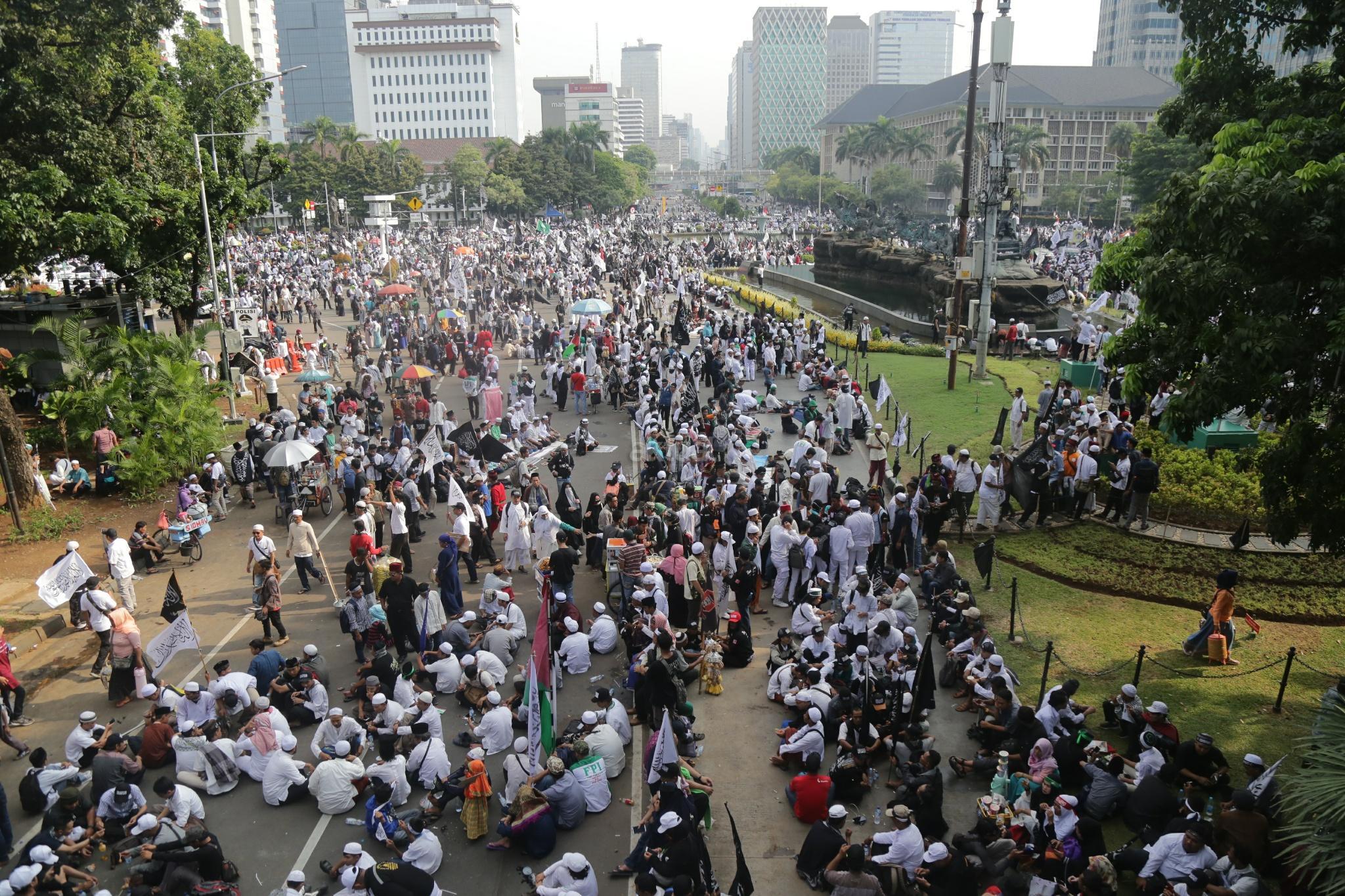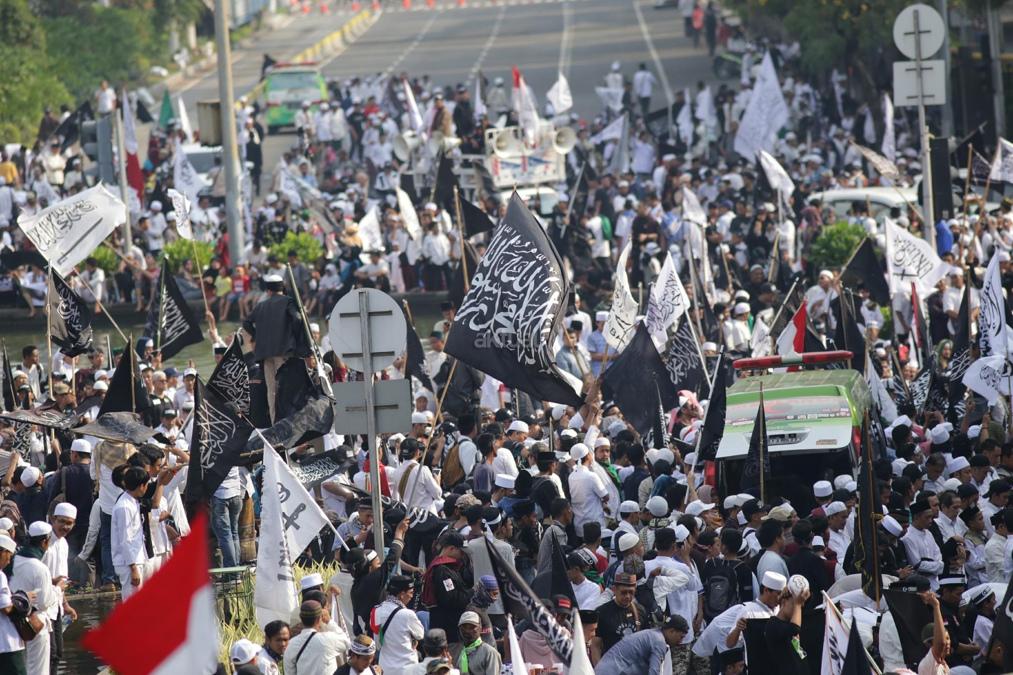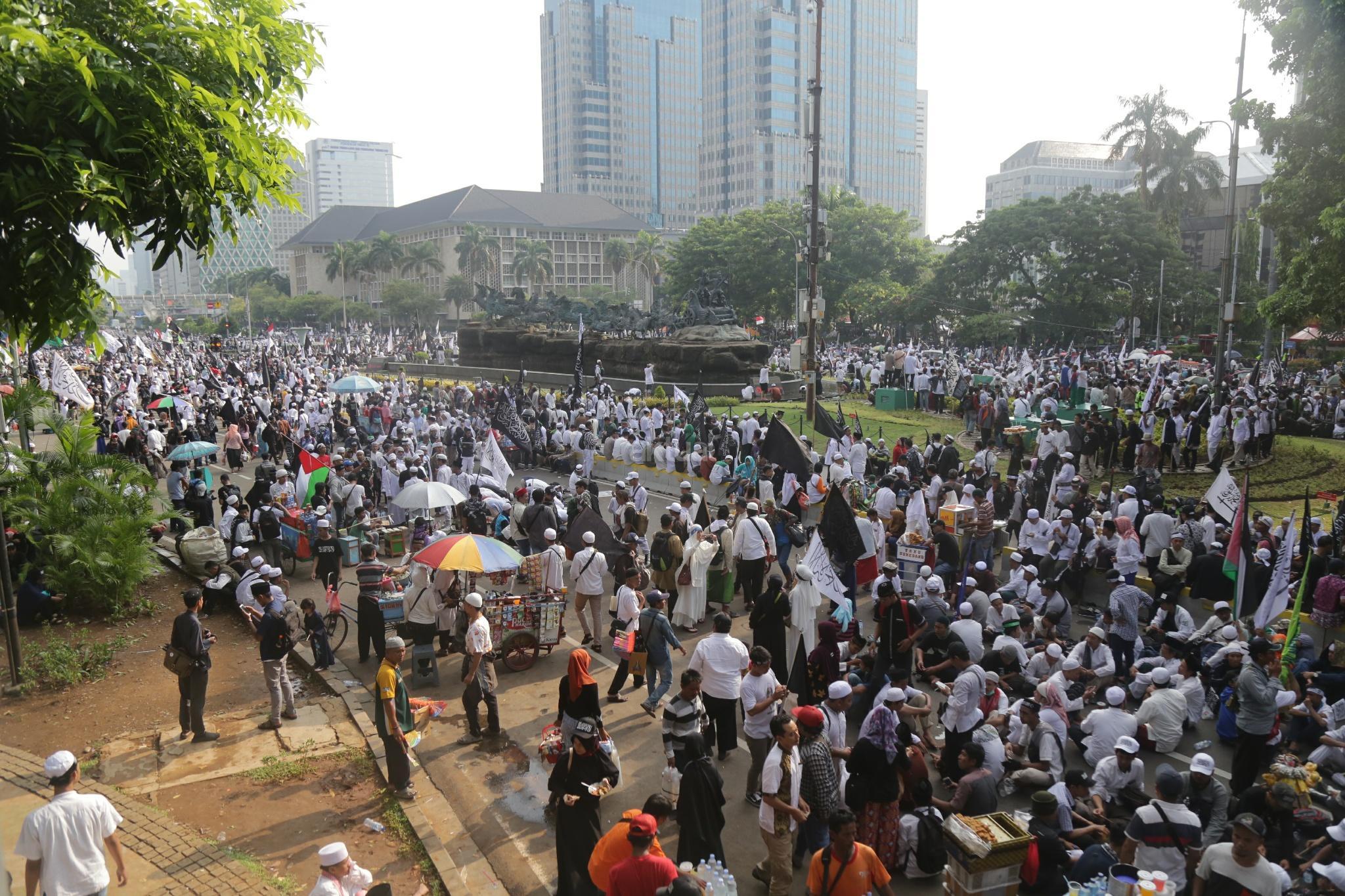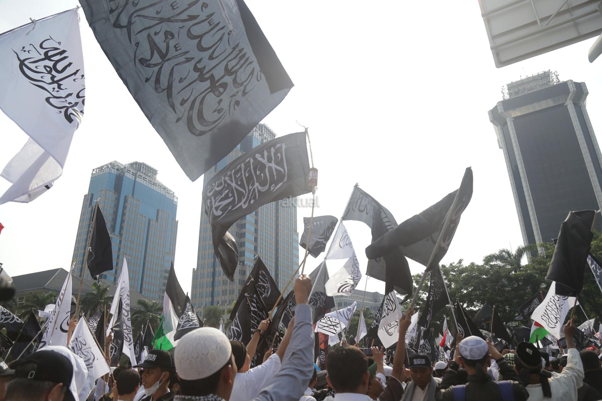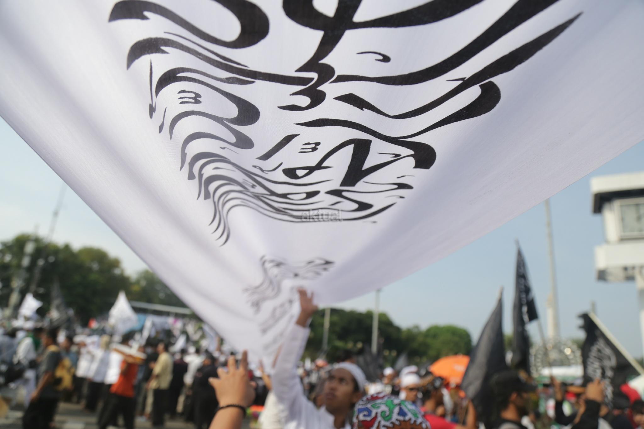 Massa Aksi Bela Tauhid atau Aksi 211 saat melakukan unjuk rasa menuntut pemerintah meminta mengakui bendera hitam yang dibakar di Garut, Jawa Barat beberapa waktu lalu merupakan bendera tauhid di kawasan Patung kuda, Jalan MH Thamrin, Jakarta, Jumat (2/11/2018). Berbagai atribut bertuliskan kalimat tauhid dibawa. Massa mengibarkan bendera-bendera yang dibawa. Aksi Bela Tauhid digelar terkait eristiwa pembakaran bendera bertuliskan kalimat tauhid yang dinyatakan Polri sebagai bendera Hizbut Tahrir Indonesia (HTI). AKTUAL/Tino Oktaviano