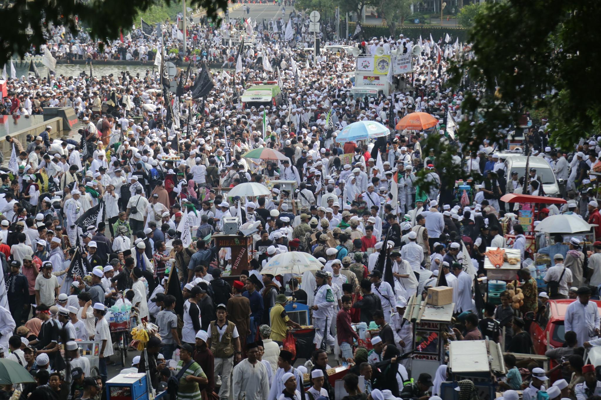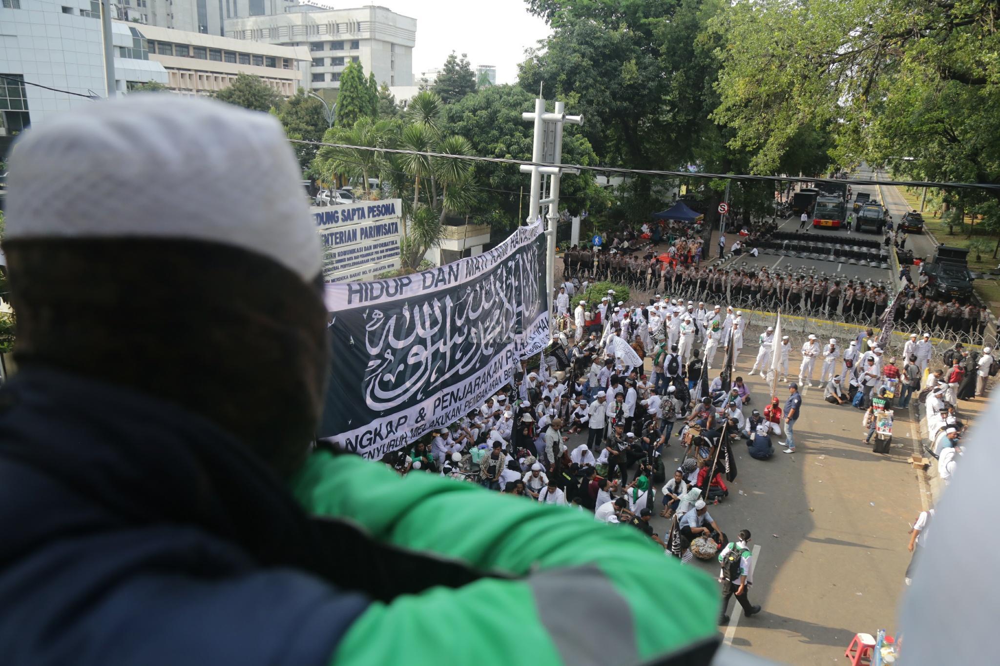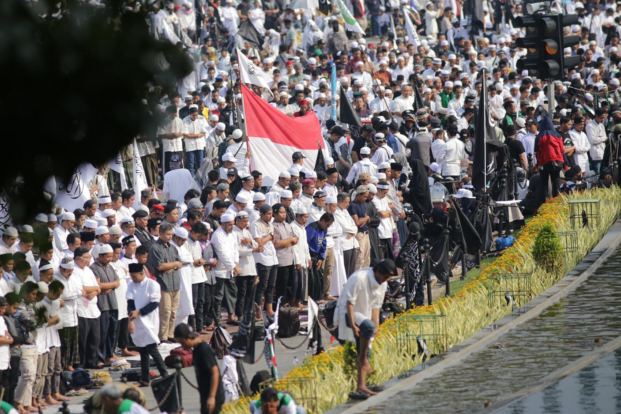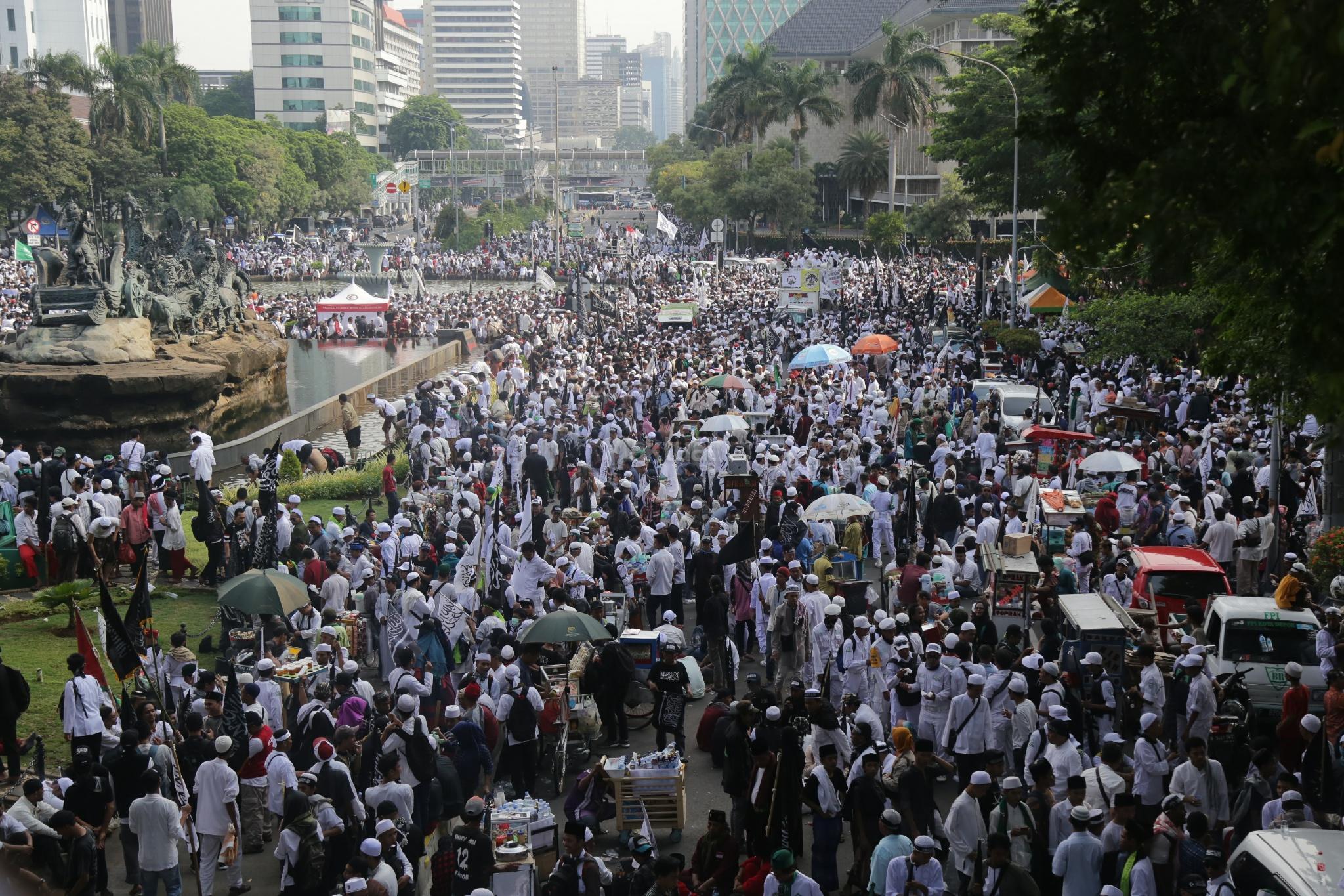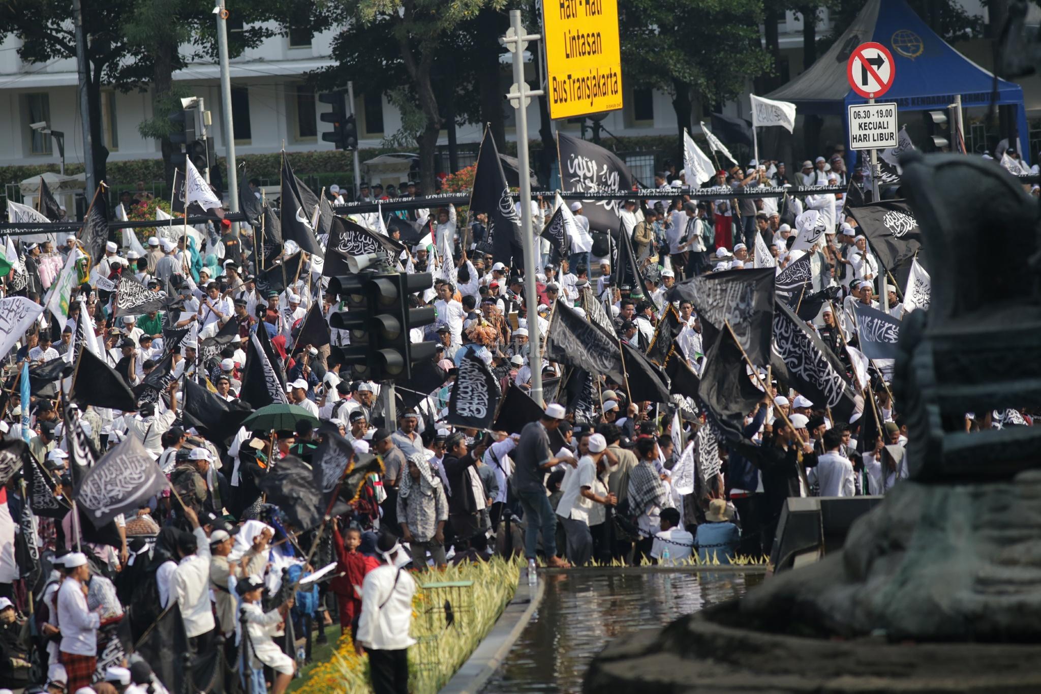 Massa Aksi Bela Tauhid atau Aksi 211 saat melakukan unjuk rasa menuntut pemerintah meminta mengakui bendera hitam yang dibakar di Garut, Jawa Barat beberapa waktu lalu merupakan bendera tauhid di kawasan Patung kuda, Jalan MH Thamrin, Jakarta, Jumat (2/11/2018). Berbagai atribut bertuliskan kalimat tauhid dibawa. Massa mengibarkan bendera-bendera yang dibawa. Aksi Bela Tauhid digelar terkait eristiwa pembakaran bendera bertuliskan kalimat tauhid yang dinyatakan Polri sebagai bendera Hizbut Tahrir Indonesia (HTI). AKTUAL/Tino Oktaviano