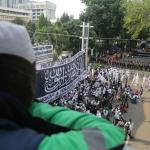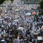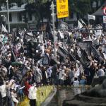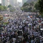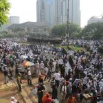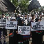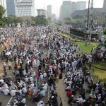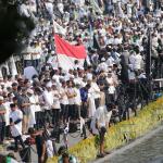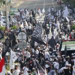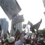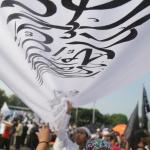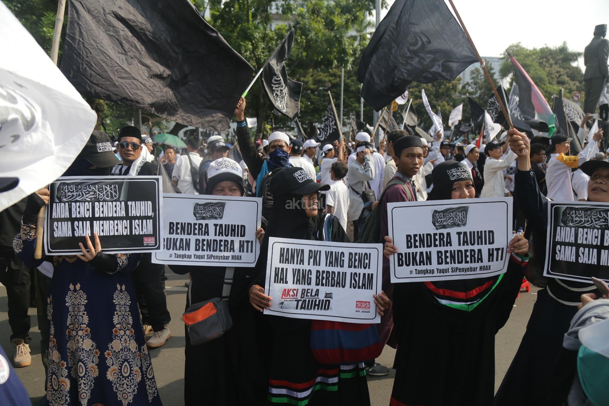 Massa Aksi Bela Tauhid atau Aksi 211 saat melakukan unjuk rasa menuntut pemerintah meminta mengakui bendera hitam yang dibakar di Garut, Jawa Barat beberapa waktu lalu merupakan bendera tauhid di kawasan Patung kuda, Jalan MH Thamrin, Jakarta, Jumat (2/11/2018). Berbagai atribut bertuliskan kalimat tauhid dibawa. Massa mengibarkan bendera-bendera yang dibawa. Aksi Bela Tauhid digelar terkait eristiwa pembakaran bendera bertuliskan kalimat tauhid yang dinyatakan Polri sebagai bendera Hizbut Tahrir Indonesia (HTI). AKTUAL/Tino Oktaviano