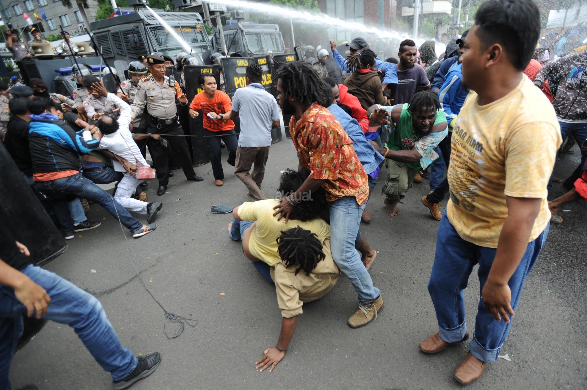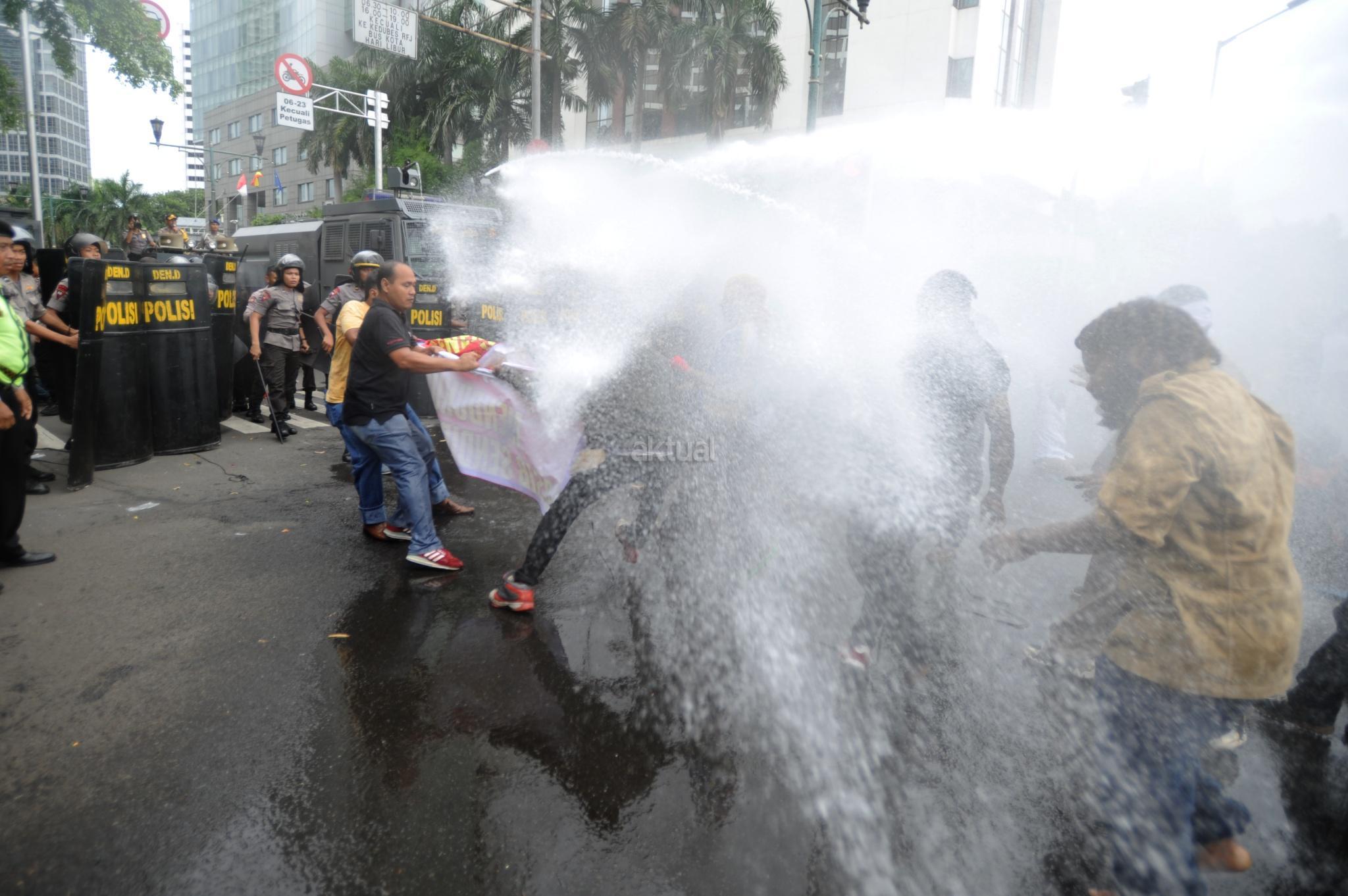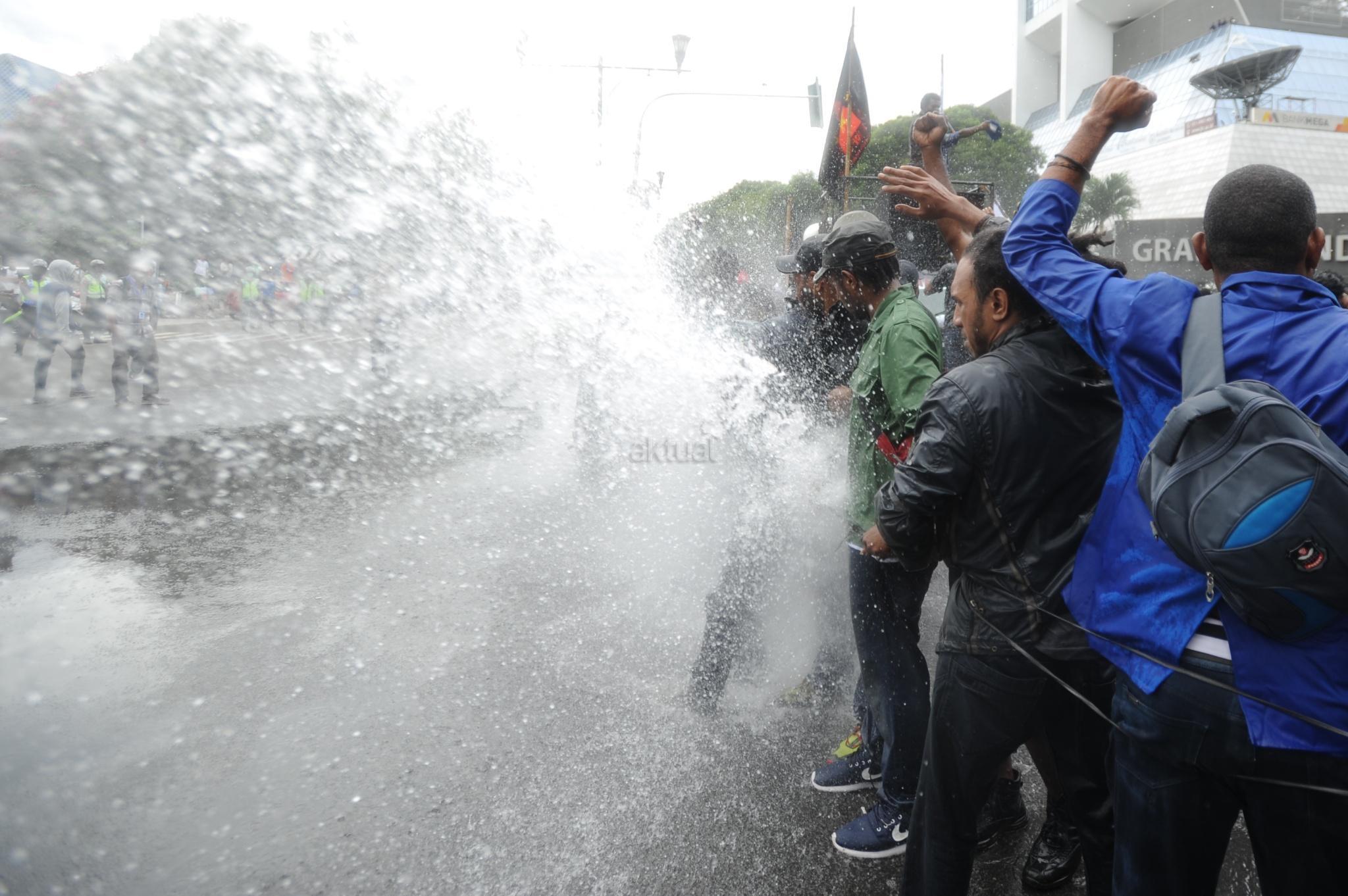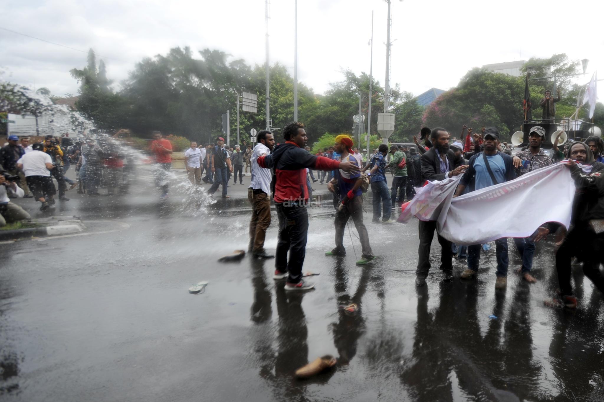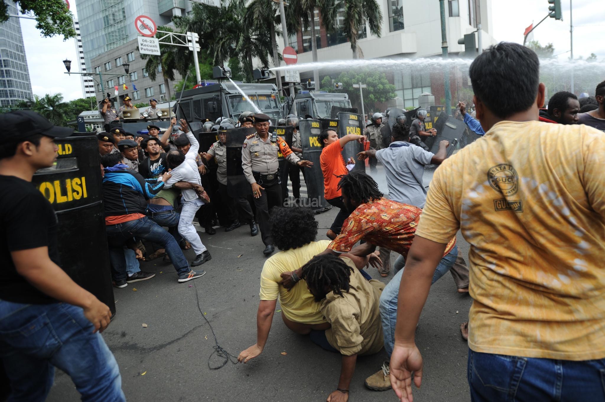Aksi Front Rakyat Indonesia (FRI) untuk Papua Barat ricuh saat polisi menghadang dengan water canon di perempatan Jalan Imam Bonjol, Jakarta Pusat, Kamis (1/12/2016). Aksi demonstrasi ini menuntut referendum bagi Papua pada 1 Desember 2016. Unjuk rasa yang akan diadakan di Bundaran Hotel Indonesia ini dihadang polisi saat akan memasuki kawasan Bundaran HI. AKTUAL/Tino Oktaviano