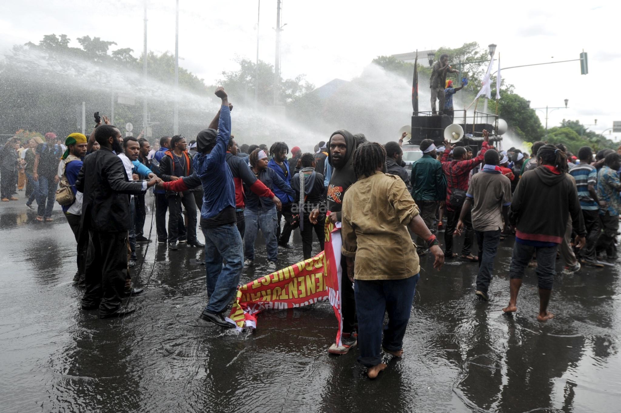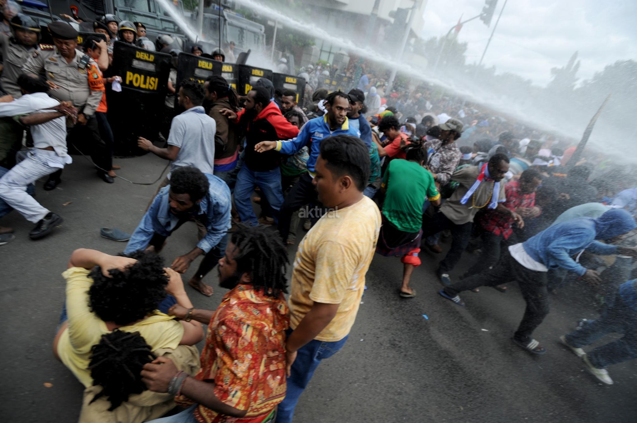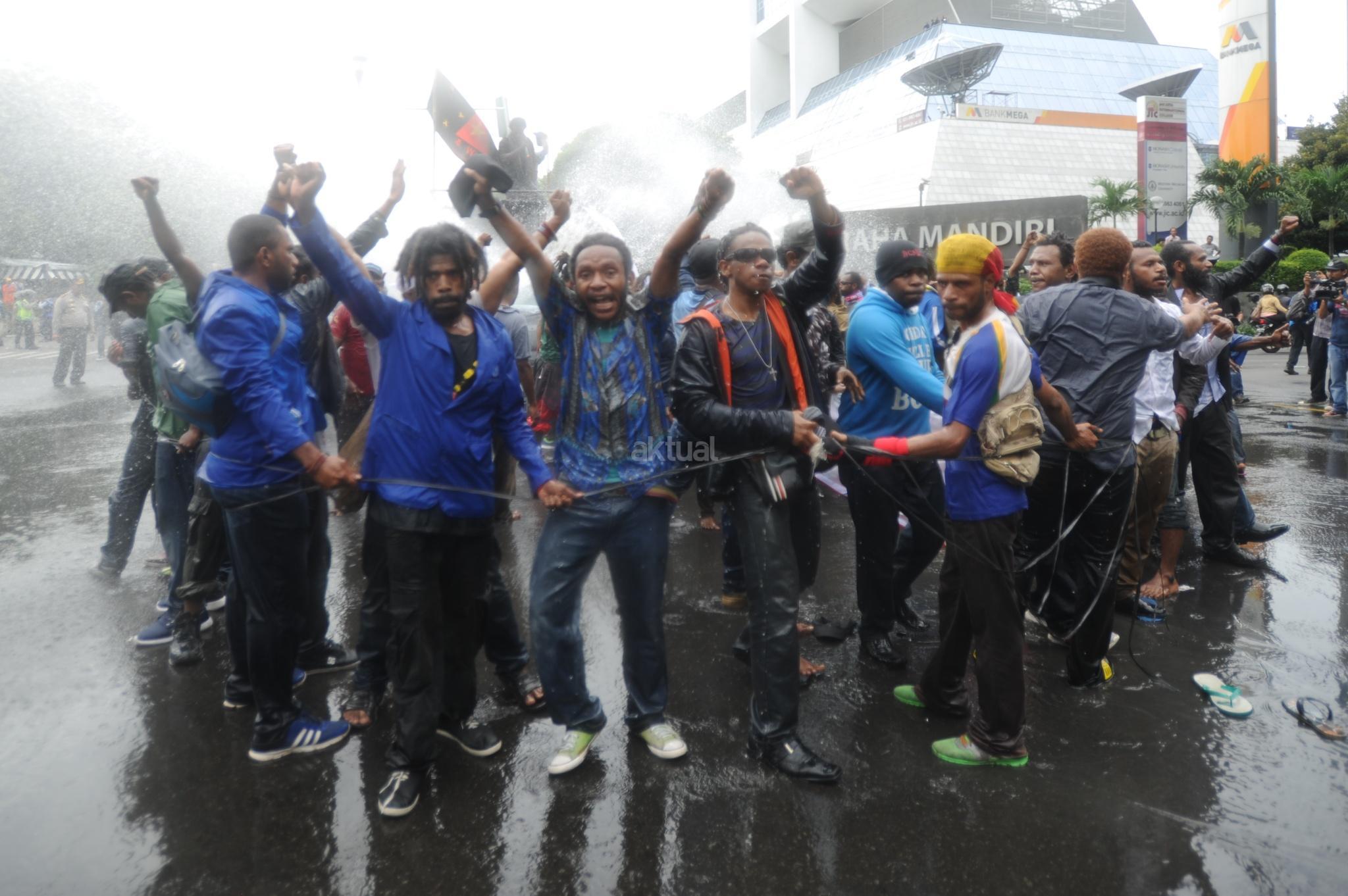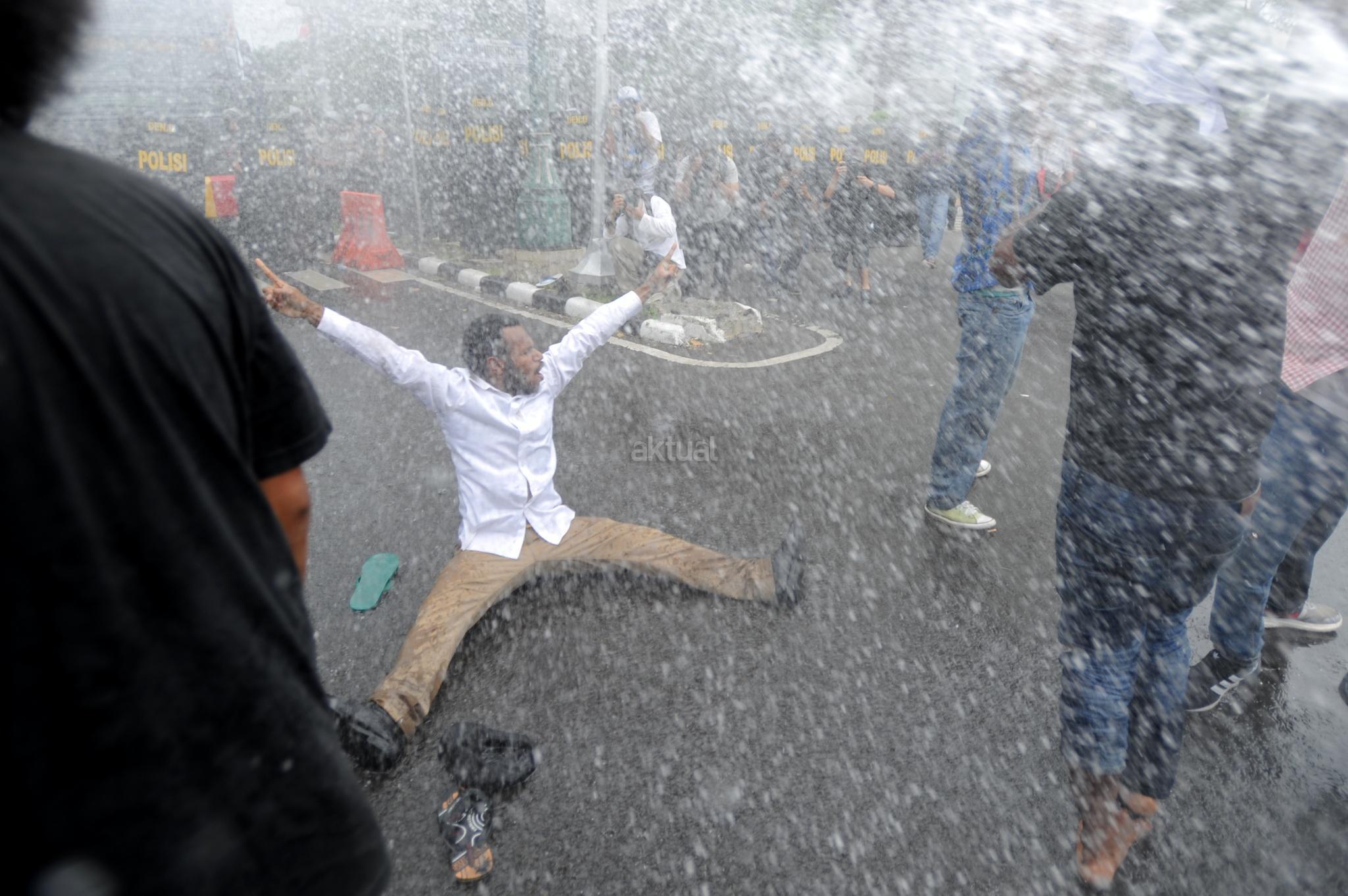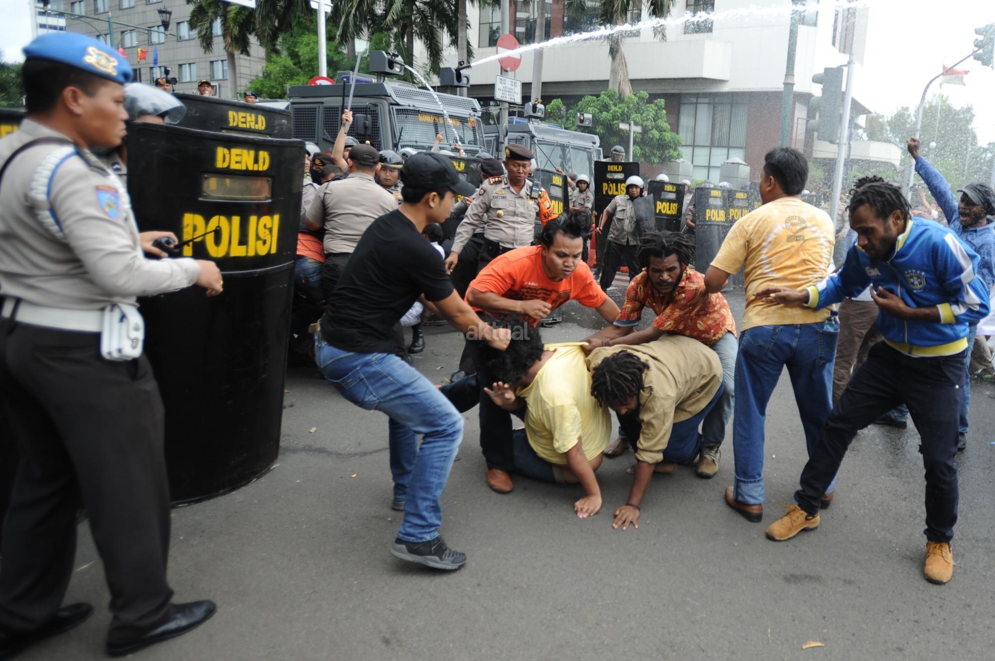 Aksi Front Rakyat Indonesia (FRI) untuk Papua Barat ricuh saat polisi menghadang dengan water canon di perempatan Jalan Imam Bonjol, Jakarta Pusat, Kamis (1/12/2016). Aksi demonstrasi ini menuntut referendum bagi Papua pada 1 Desember 2016. Unjuk rasa yang akan diadakan di Bundaran Hotel Indonesia ini dihadang polisi saat akan memasuki kawasan Bundaran HI. AKTUAL/Tino Oktaviano