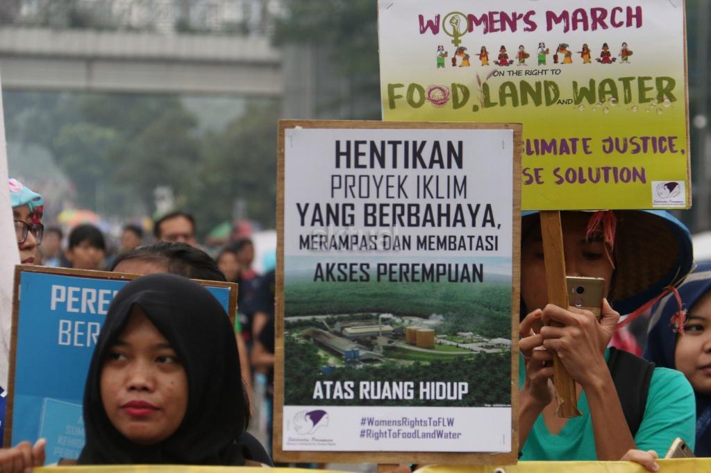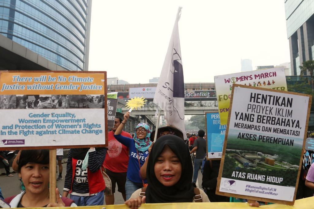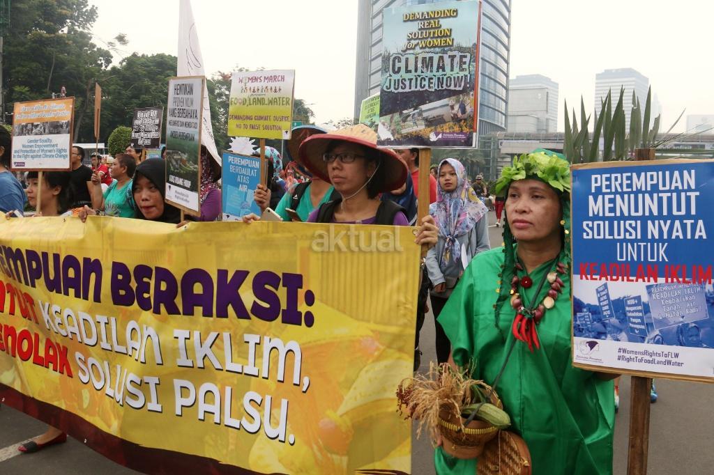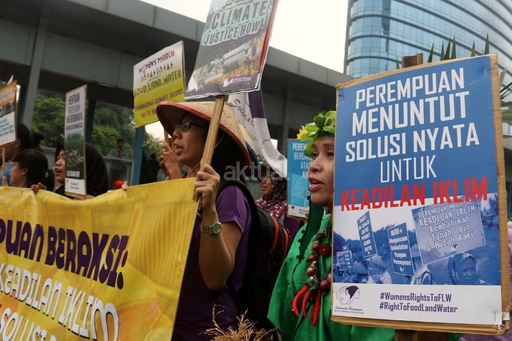 Para akitivis perempuan mengecam para perusahaan-perusahaan yang merusak bumi namun tanggung jawab dari ulah mereka dibebankan ke masyarakat kecil. AKTUAL/Munzir