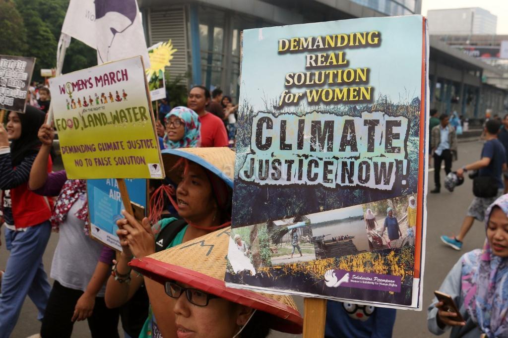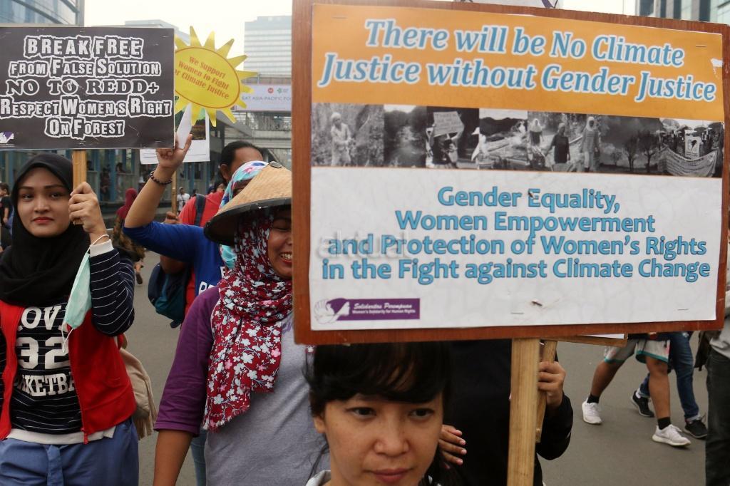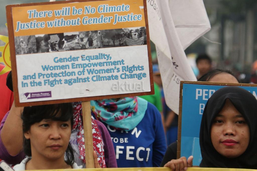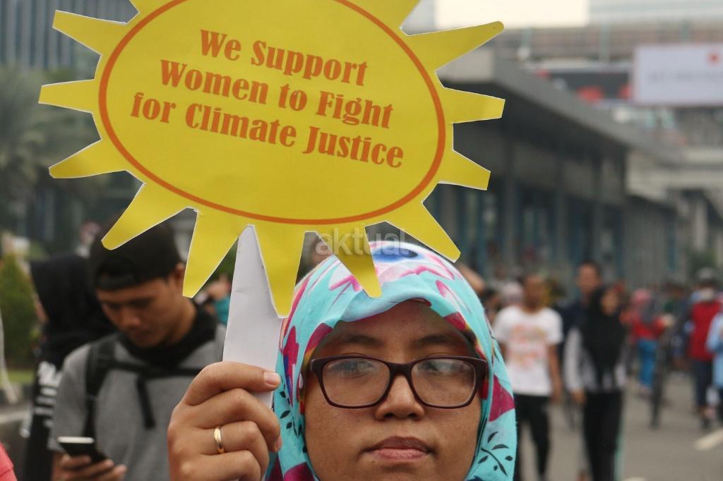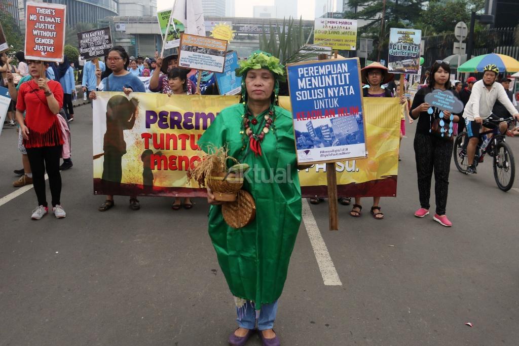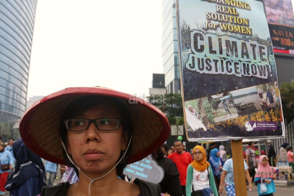 Aksi aktivis perempuan menuntut keadilan iklim. Mereka mengecam para perusahaan-perusahaan yang merusak bumi namun tanggung jawab dari ulah mereka dibebankan ke masyarakat kecil. AKTUAL/Munzir