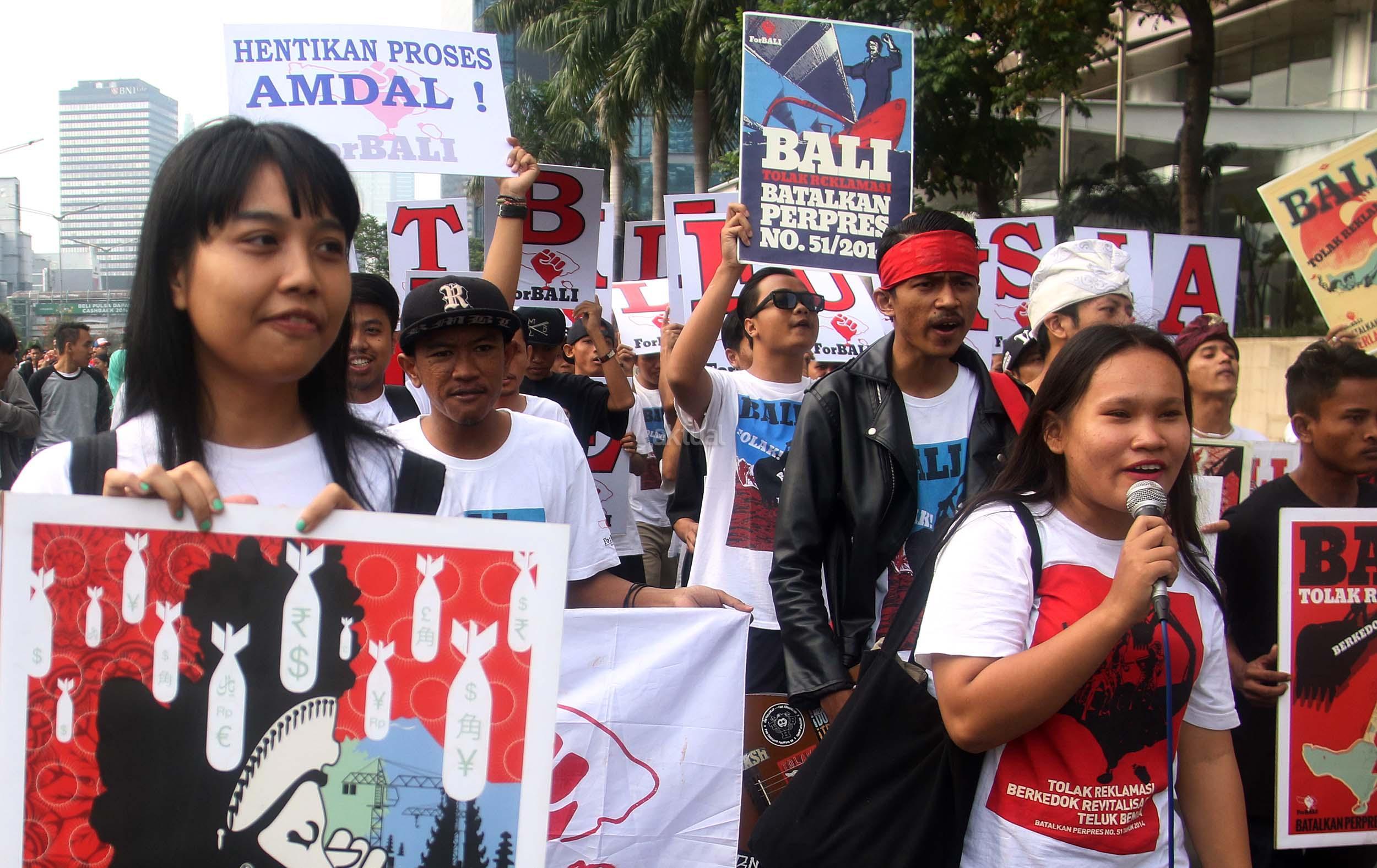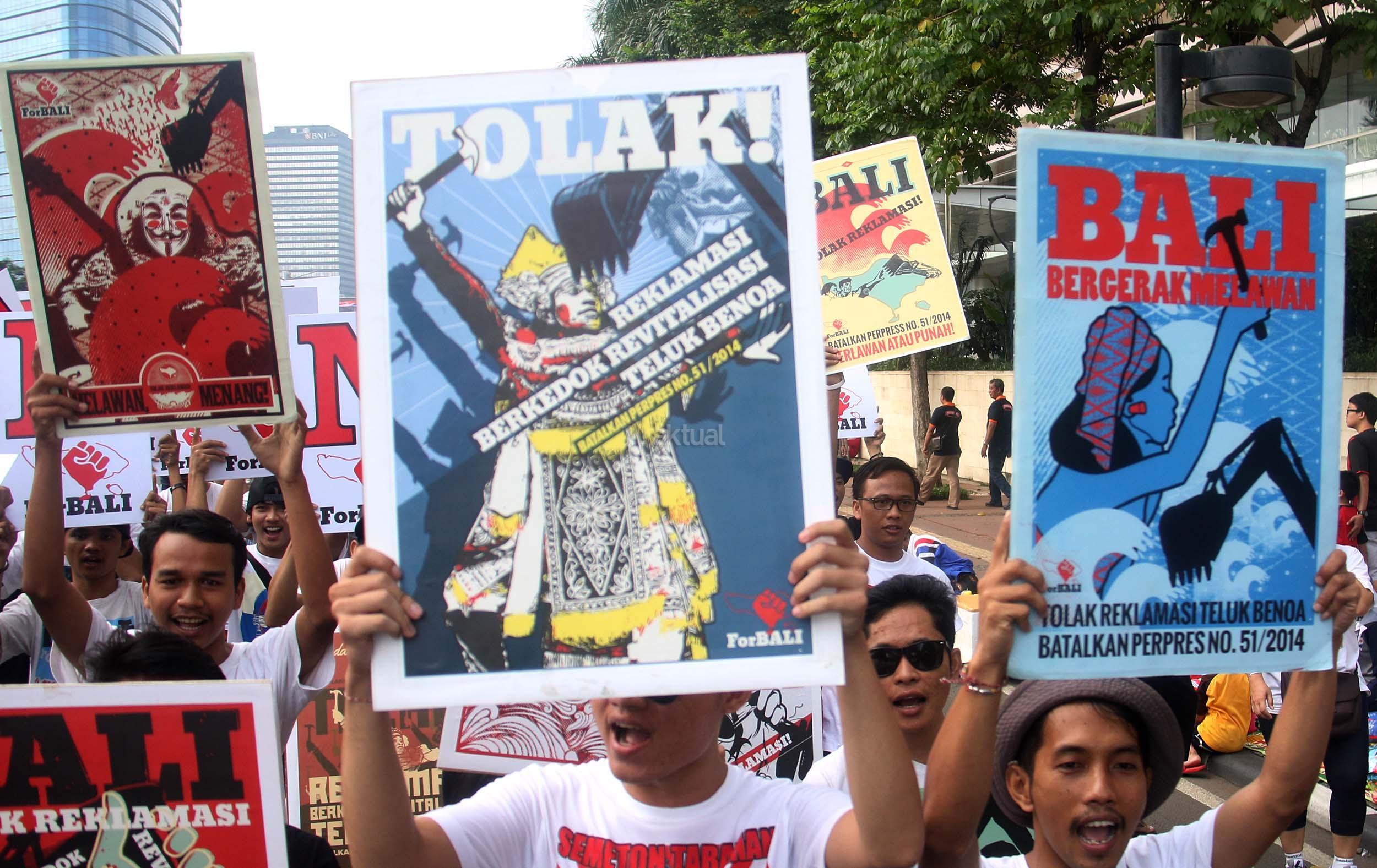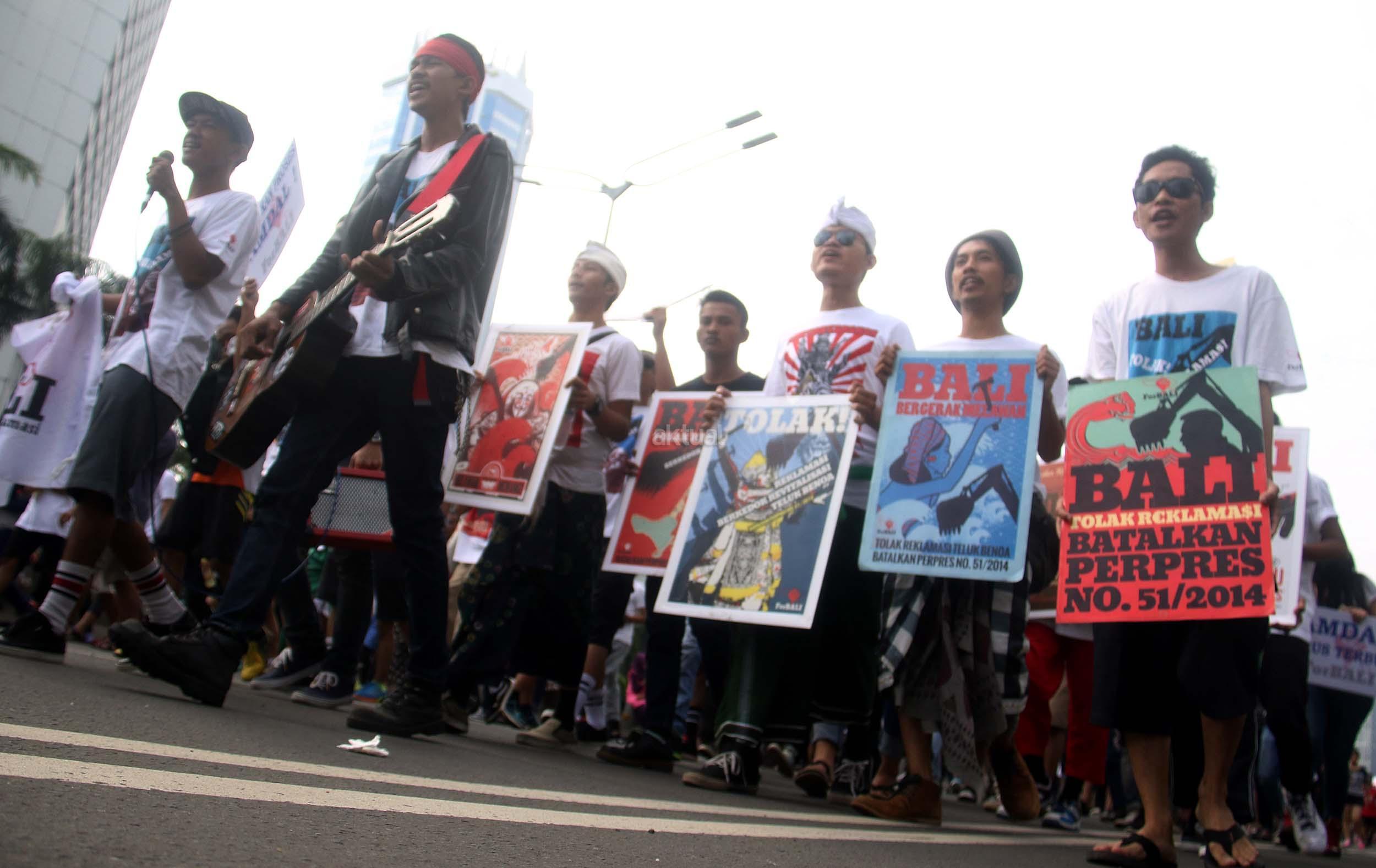 Puluhan aktivis yang tergabung dalam For Bali kembali melakukan aski Tolak Reklamasi Teluk Benoa di Car Free Day, Jakarta, Minggu (25/9/2016). Dalam aksinya aktivis For Bali untuk memperingati 110 tahun Puputan Badung, Pasubayan Desa Adat/Pakraman Bali Tolak Reklamasi dengan pelaksana mandat teknis dari ForBALI menyelenggarakan Kirab Bendera Merah Putih.