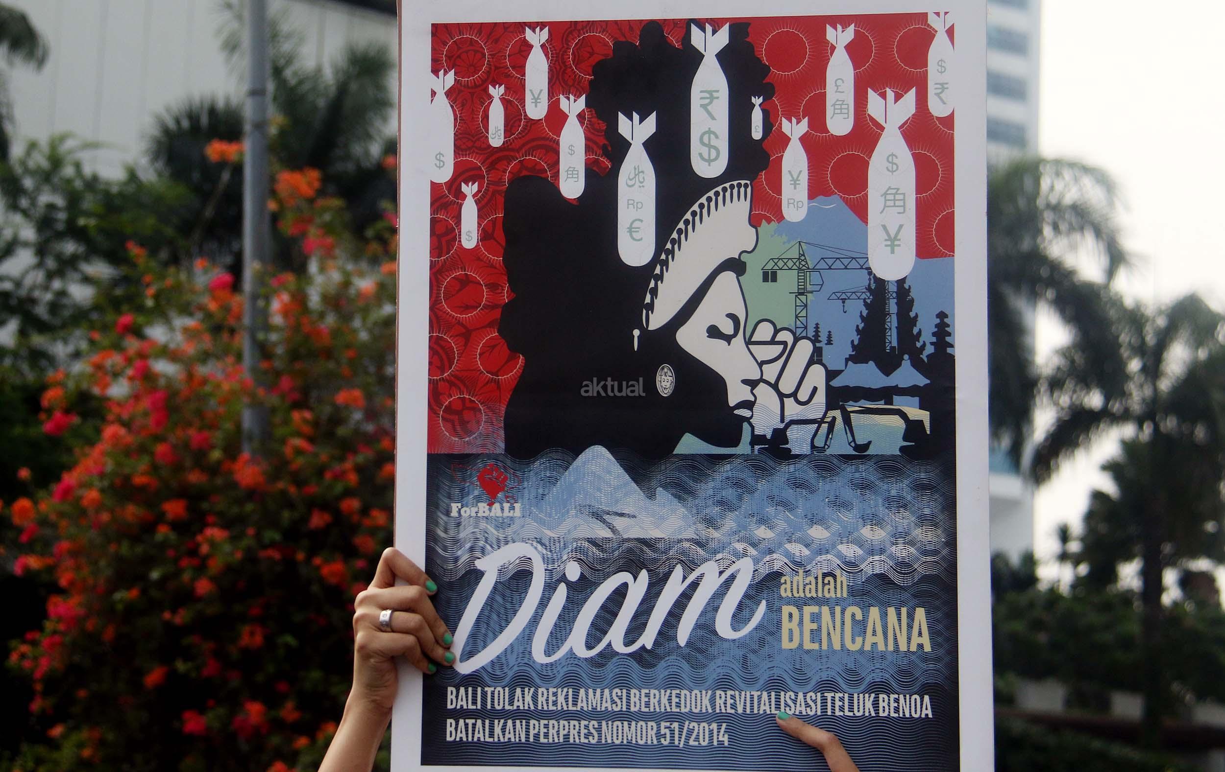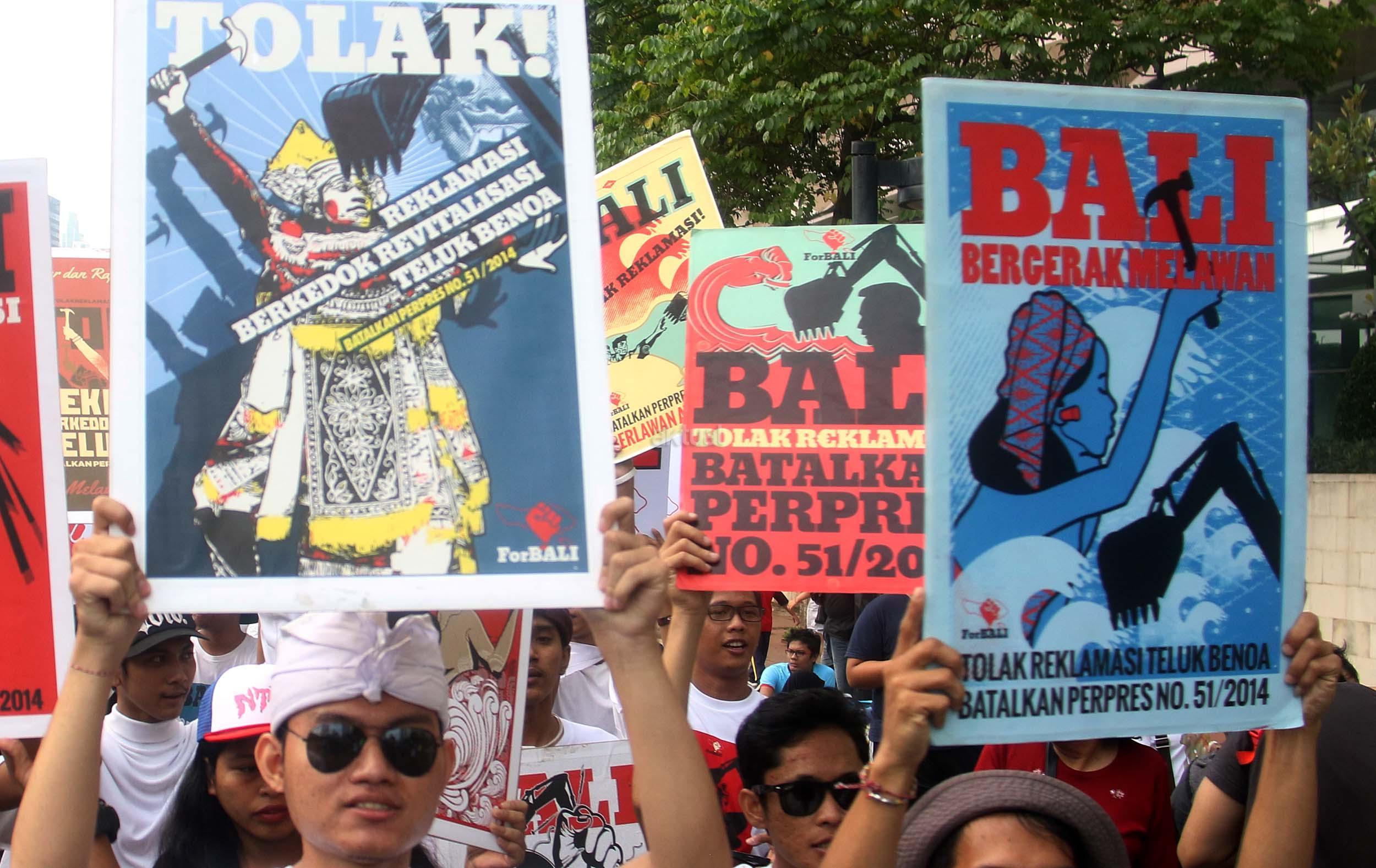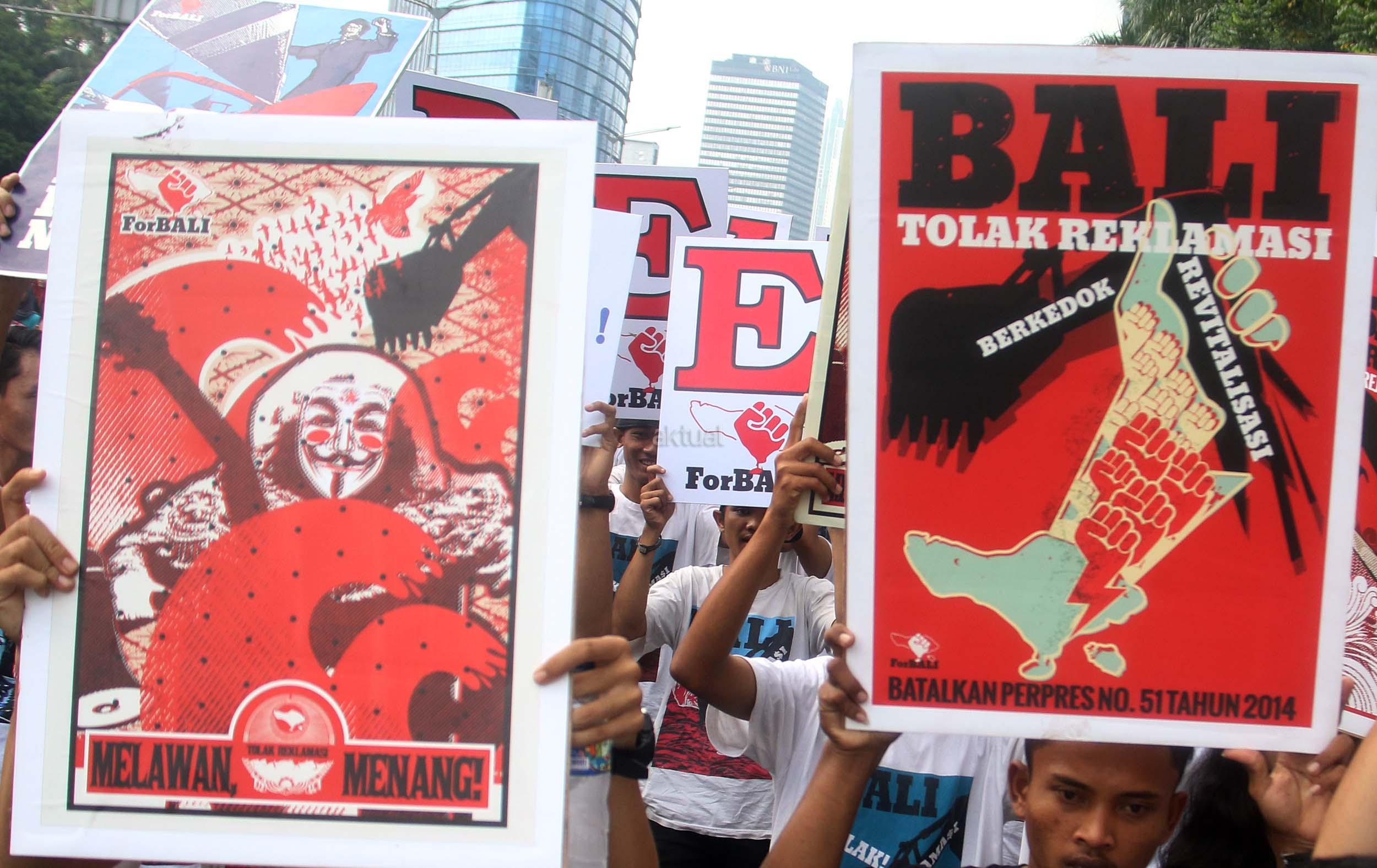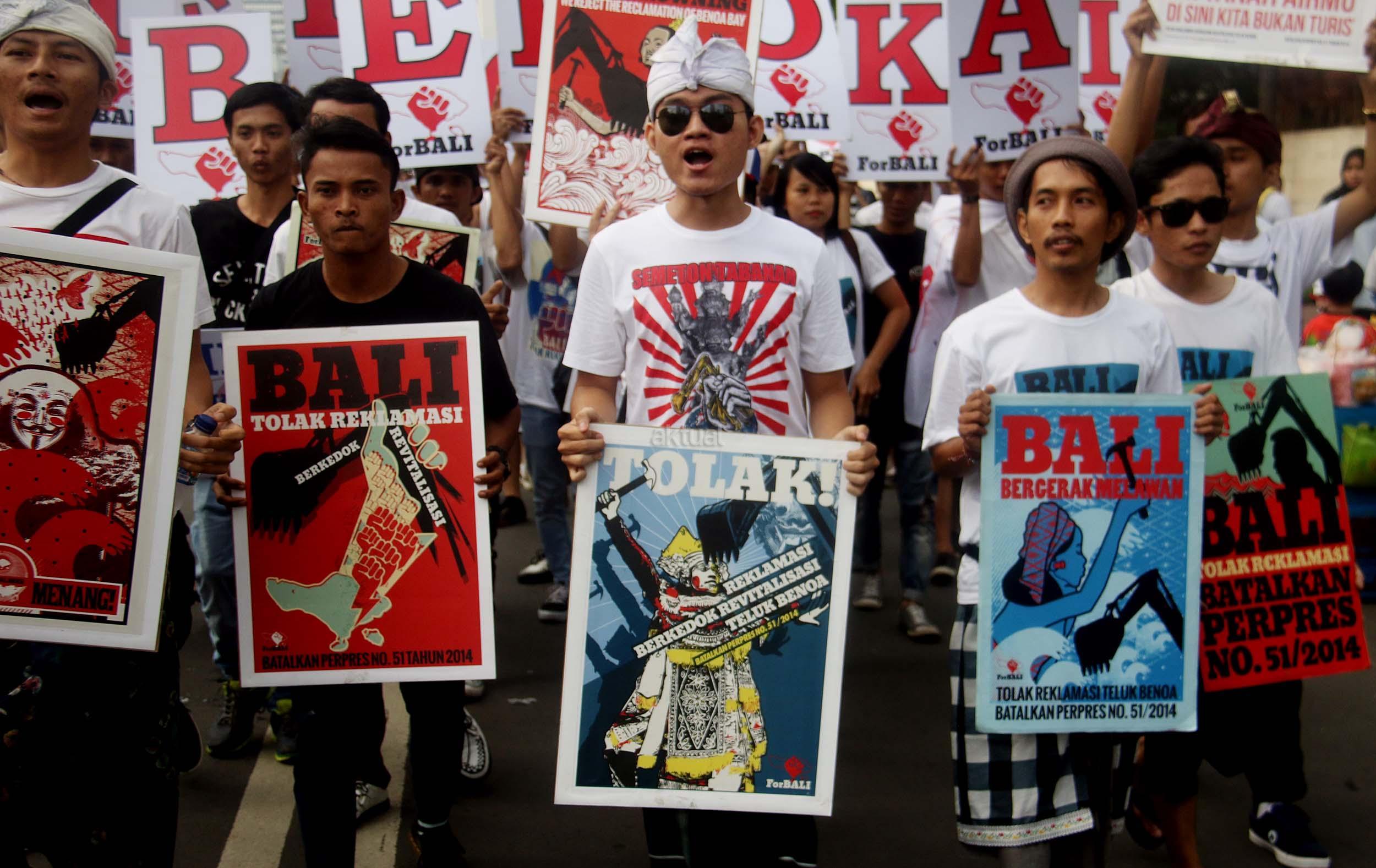 Puluhan aktivis yang tergabung dalam For Bali kembali melakukan aski Tolak Reklamasi Teluk Benoa di Car Free Day, Jakarta, Minggu (25/9/2016). Dalam aksinya aktivis For Bali untuk memperingati 110 tahun Puputan Badung, Pasubayan Desa Adat/Pakraman Bali Tolak Reklamasi dengan pelaksana mandat teknis dari ForBALI menyelenggarakan Kirab Bendera Merah Putih.