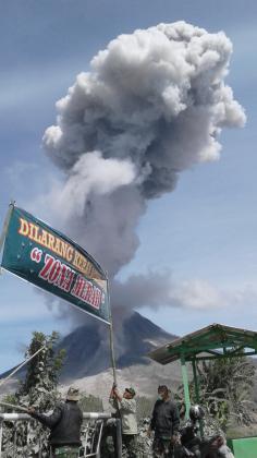 Prajurit TNI memasang tanda zona merah di Desa Kuta Tonggal, dengan latar belakang Gunung Sinabung menyemburkan material vulkanik ketika erupsi, di Karo, Sumatera Utara, Rabu (25/5). Aktivitas Gunung Sinabung yang berstatus Awas (Level) IV semakin meningkat, ditandai dengan erupsi dan luncuran awan panas yang terjadi menyebabkan sejumlah desa tertutup debu vulkanik. ANTARA FOTO/Maz Yons/im/foc/16.