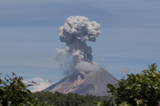 Gunung Sinabung menyemburkan material vulkanik ketika erupsi, di Karo, Sumatera Utara, Rabu (25/5). Aktivitas Gunung Sinabung yang berstatus Awas (Level) IV semakin meningkat, ditandai dengan erupsi dan luncuran awan panas yang terjadi menyebabkan sejumlah desa tertutup debu vulkanik. ANTARA FOTO/Endro Lewa/im/foc/16.