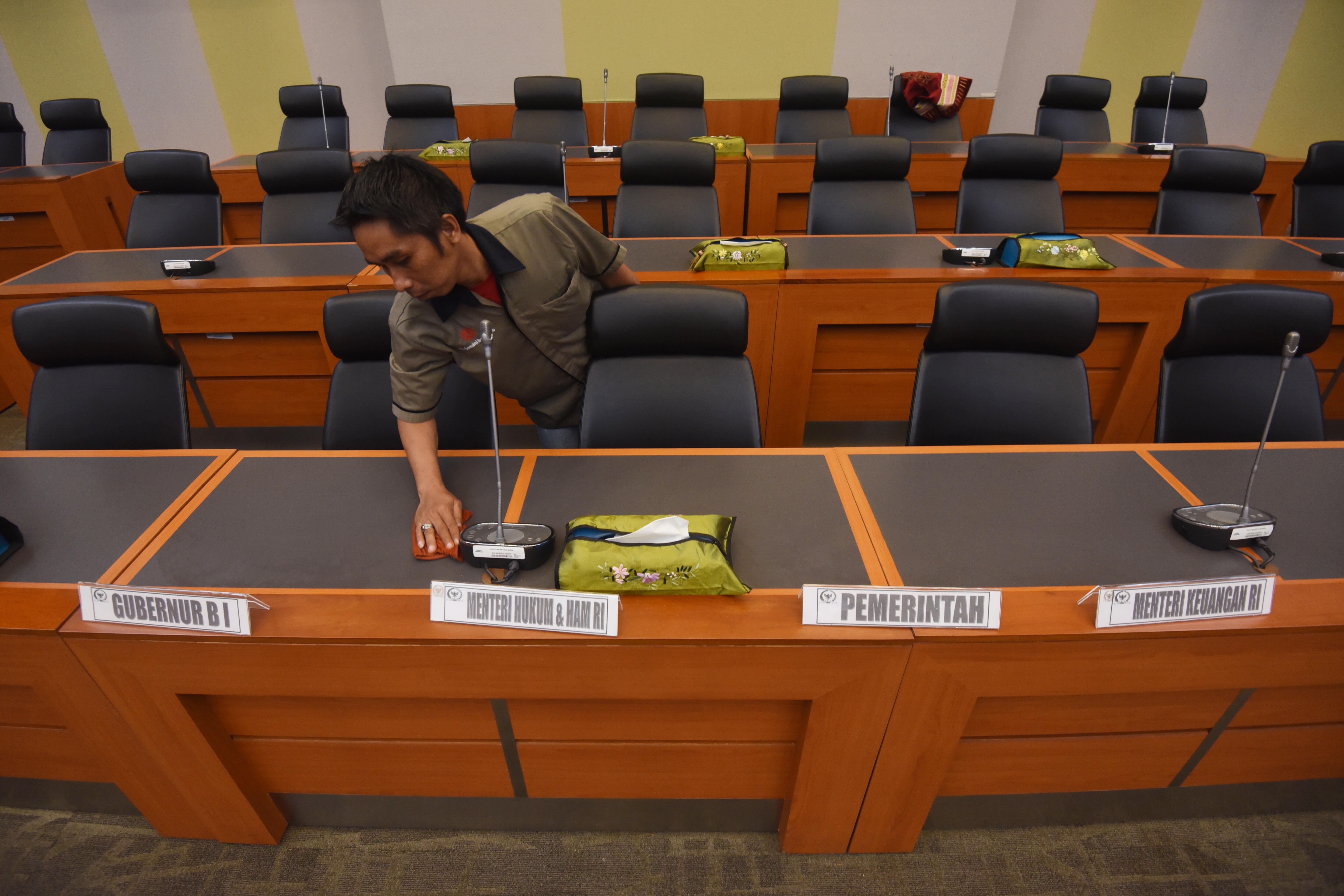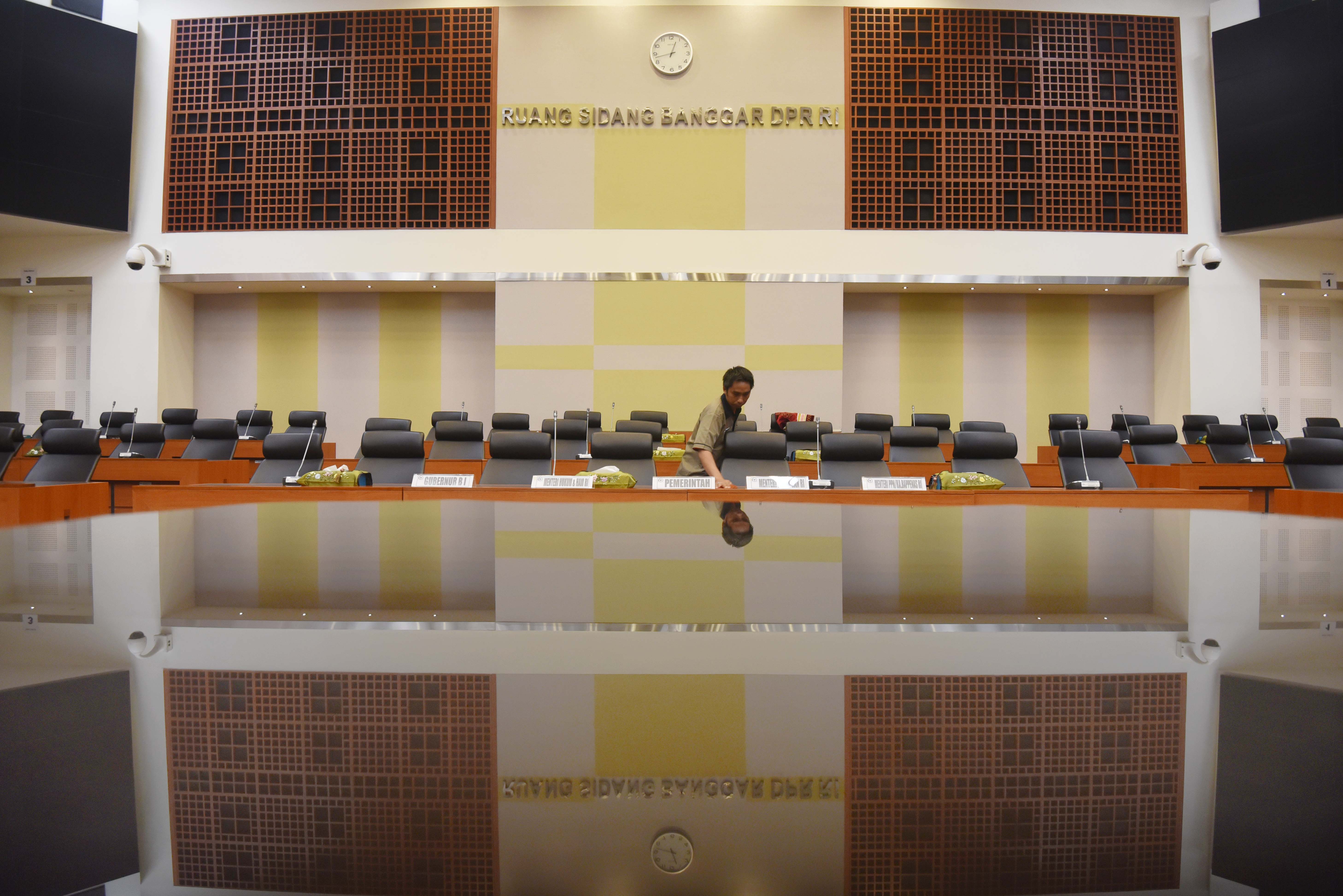 Petugas membersihkan ruang rapat Badan Anggaran DPR di Kompleks Parlemen Senayan, Jakarta, Senin (11/7). Pada hari pertama masuk kerja setelah libur Idulfitri aktivitas parlemen masih sepi. ANTARA FOTO/Akbar Nugroho Gumay/Spt/16