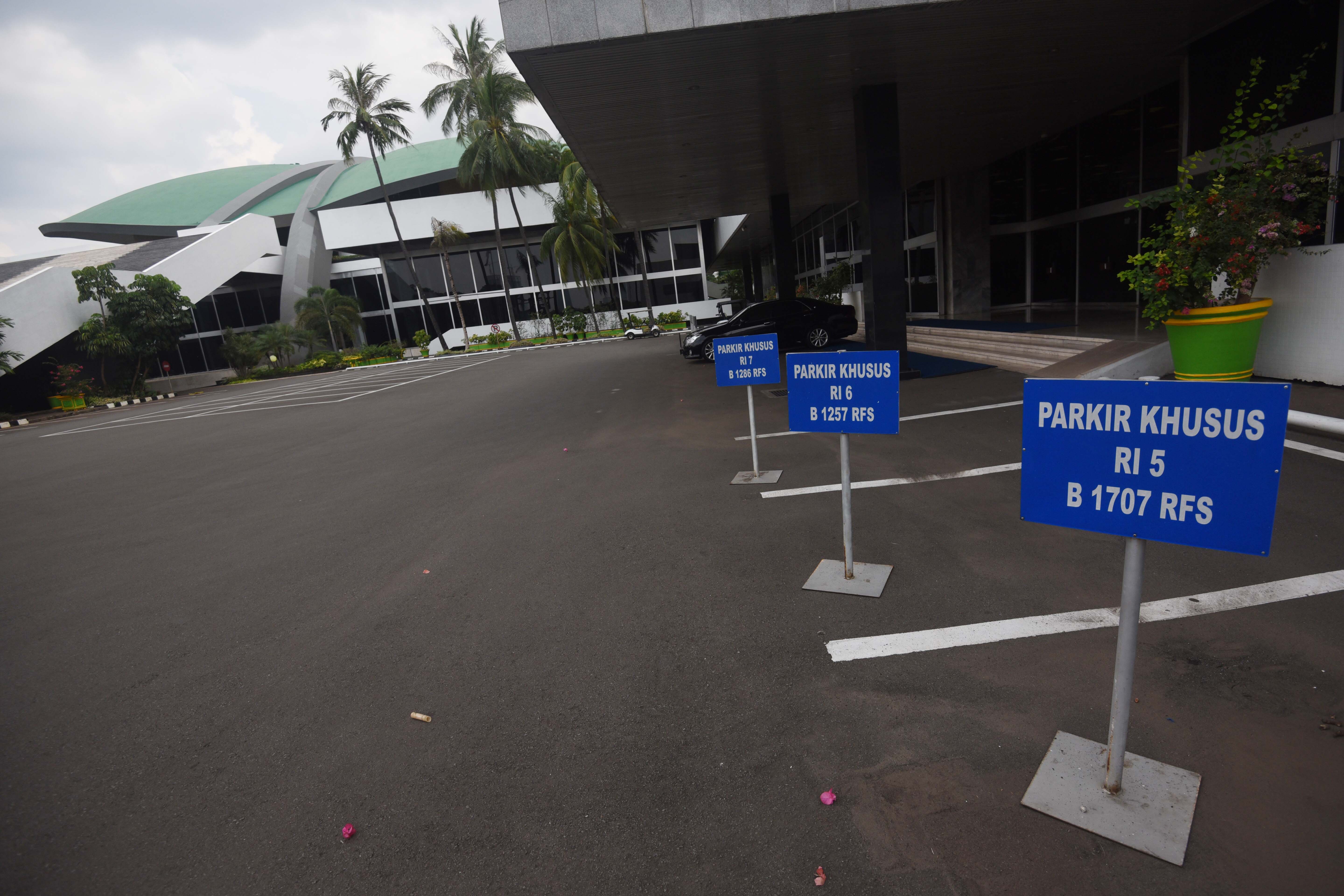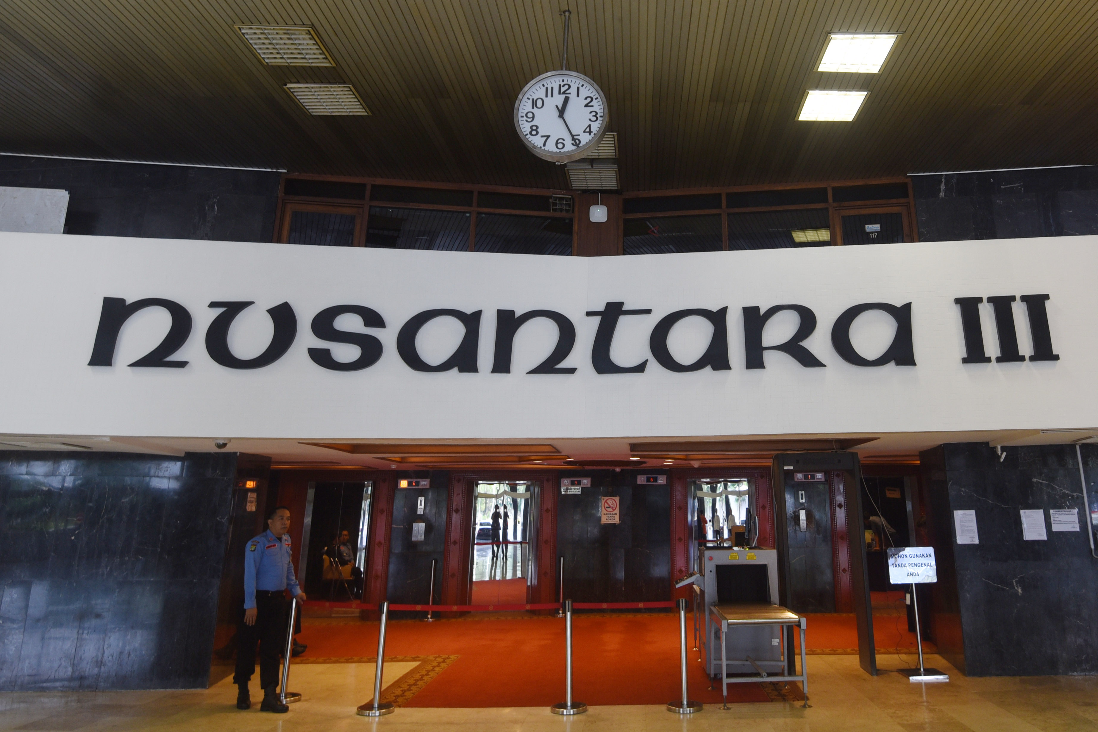 Petugas keamanan berjaga di depan Gedung Nusantara III, Kompleks Parlemen Senayan, Jakarta, Senin (11/7). Pada hari pertama masuk kerja setelah libur Idulfitri aktivitas parlemen masih sepi. ANTARA FOTO/Akbar Nugroho Gumay/Spt/16
