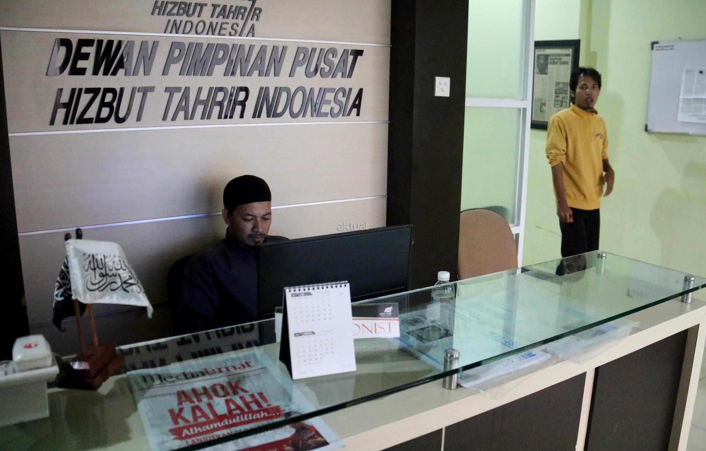 Pengurus beraktivitas di kantor DPP Hizbut Tahrir Indonesia (HTI) usai pengumuman Pemerintah Cabut Badan Hukum Ormas Hizbut Tahrir Indonesia ( HTI ) Jakarta, Rabu (19/7/2017). Sebelumnya Kementerian Hukum dan HAM (Kemenkum HAM) mengumumkan pencabutan status badan hukum ormas Hizbut Tahrir Indonesia (HTI) dan aktivitas di kantor HTI masih berjalan normal. AKTUAL/Munzir