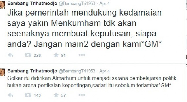 Jakarta, Aktual.co — Akun twitter @BambangTri1953 yang mengatasnamakan putra ketiga mantan presiden Soeharto, Bambang Trihatmodjo, mengomentari kisruh yang terjadi di internal Partai Golkar.