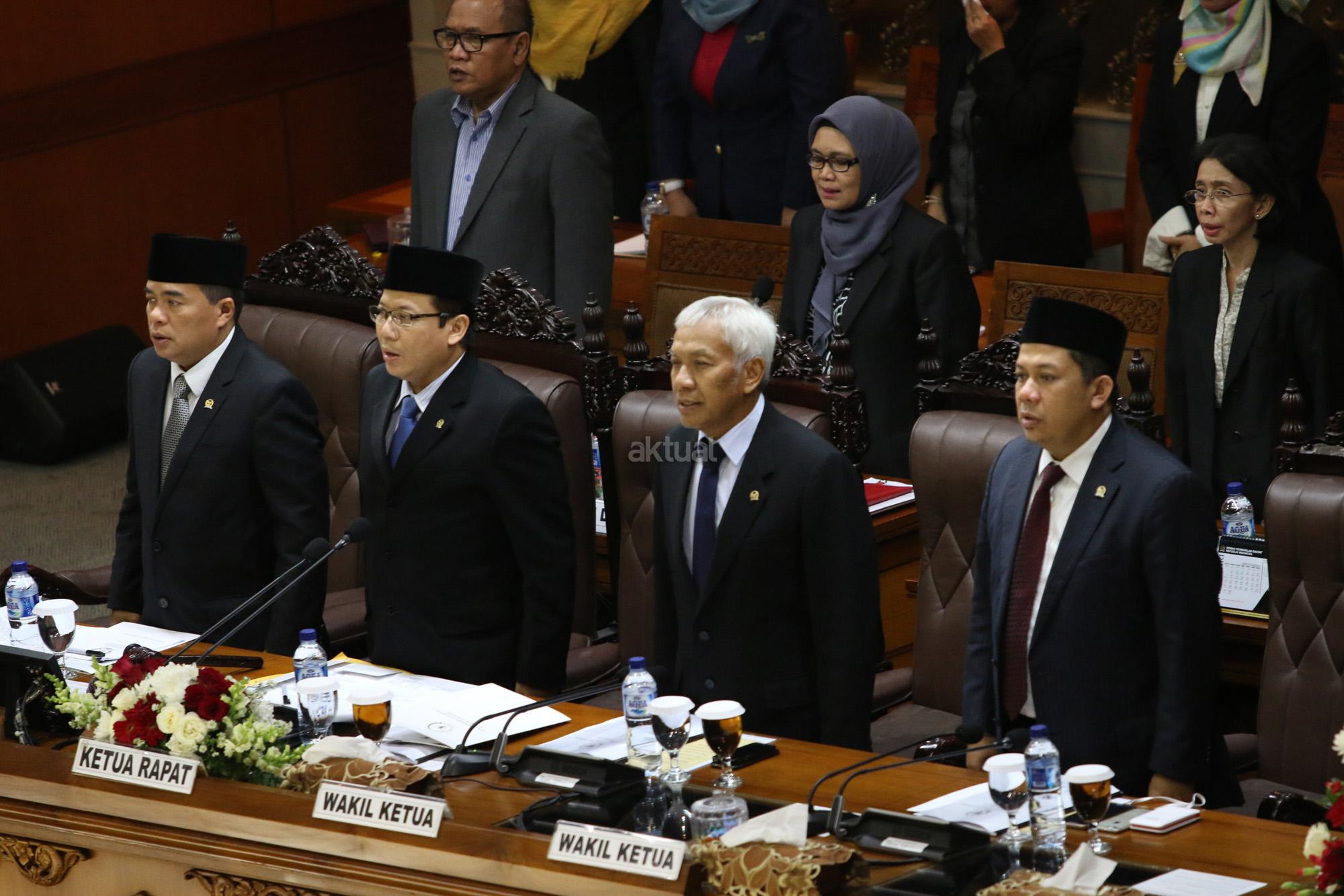 Ketua DPR Ade Komaruddin didampingi Wakil Ketua DPR Taufik Kurniawan, Agus Hermanto dan Fachry Hamzah menyanyikan lagu kebangsaan Indonesia Raya sebelum memimpin sidang penutupan Paripurna ke-22 masa sidang III Tahun 2015-2016 di Komplek Parlemen Senayan, Jakarta, Kamis (17/3). Penutupan Masa Persidangan III Tahun Sidang 2015-2016. Didahului dengan Pelantikan Anggota Pengganti Antar Waktu DPR RI Alfia Reziani menggantikan Politikus PDI Perjuangan Puan Maharani yang saat ini menjabat sebagai Menko Pembangunan Manusia dan Kebudayaan. FOTO: AKTUAL/JUNAIDI MAHBUB