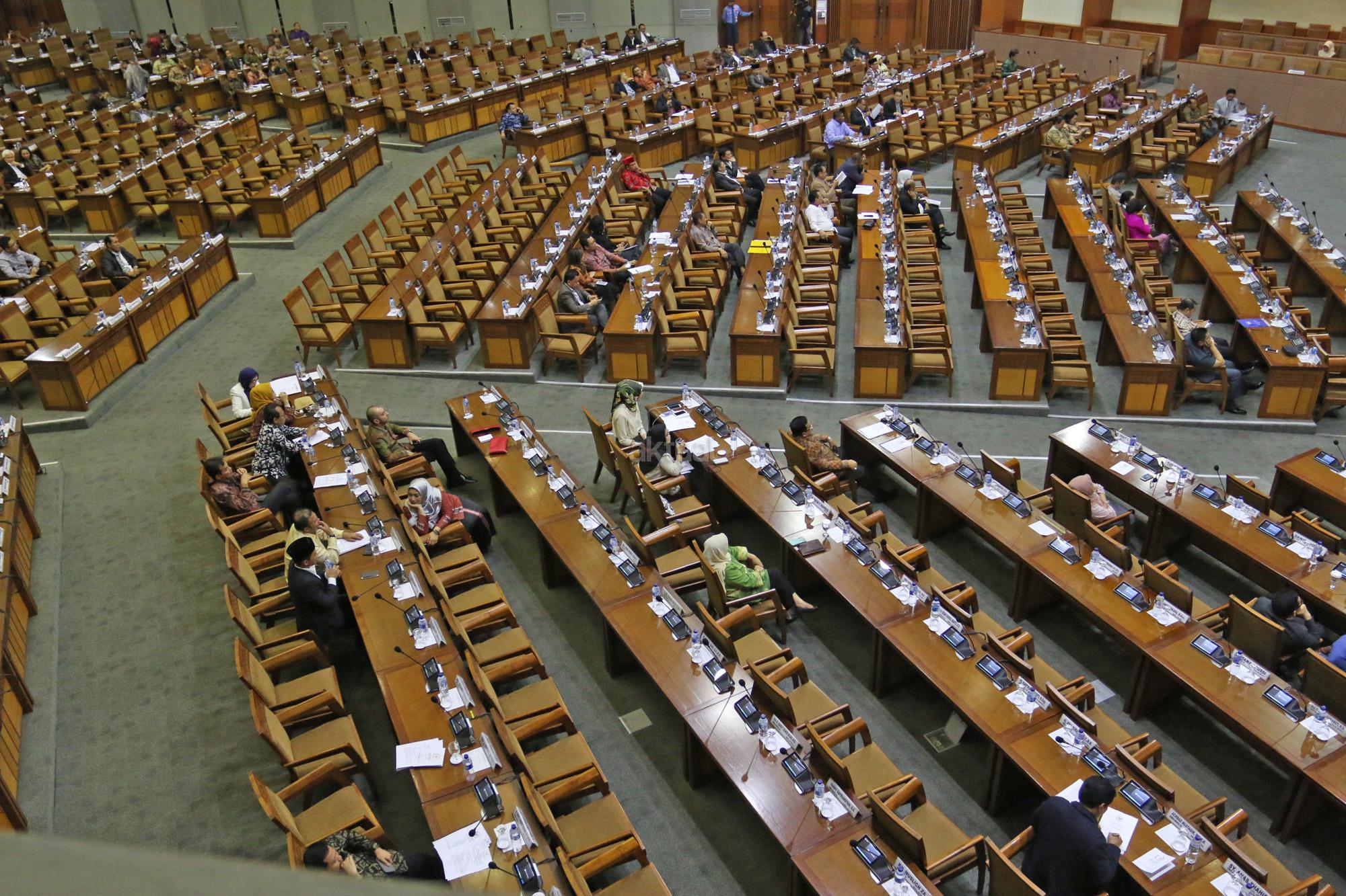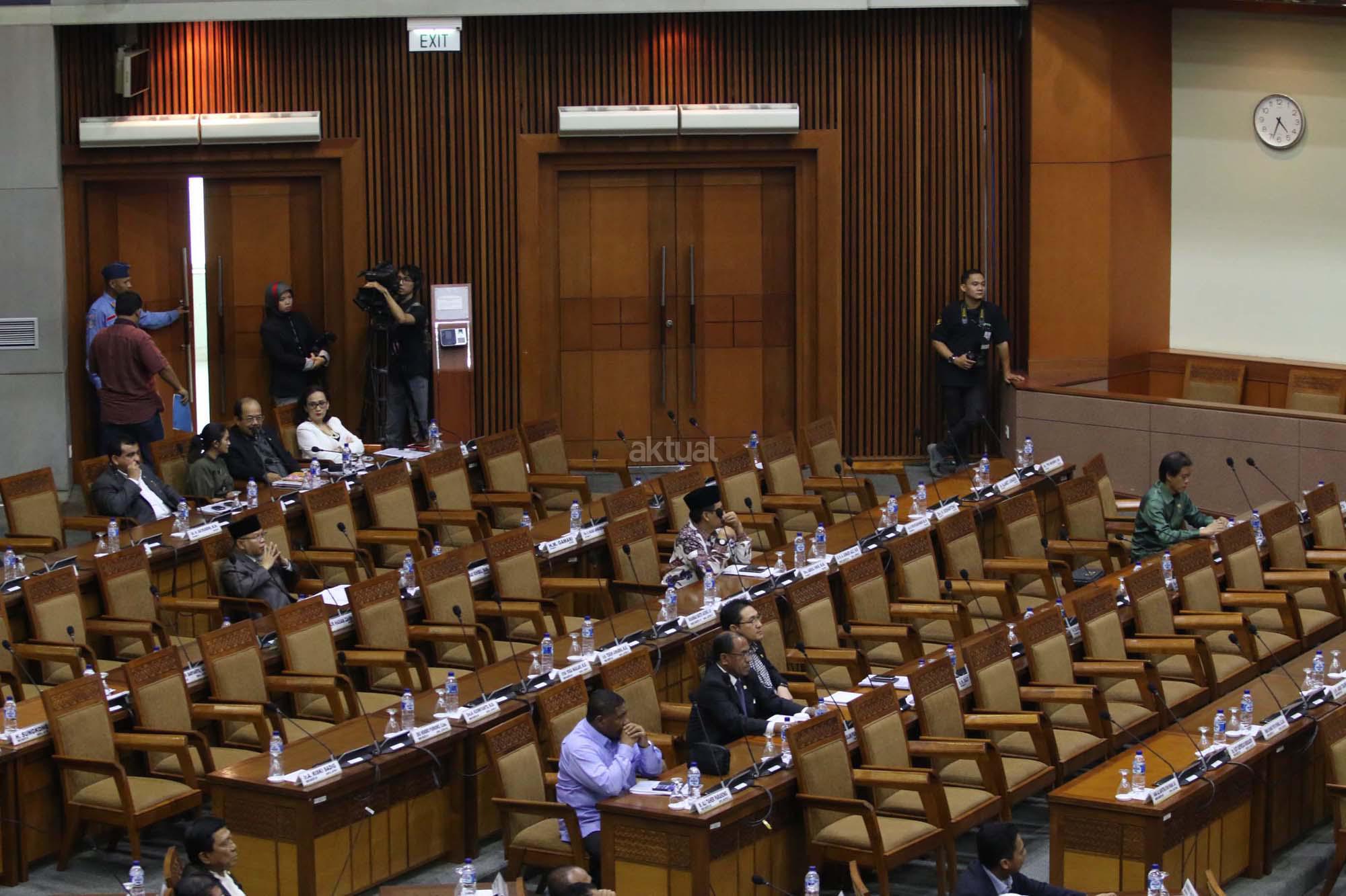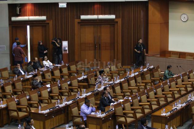 Deretan kuris kosong terlihat pada penutupan sidang Paripurna ke-22 masa sidang III Tahun 2015-2016 di Komplek Parlemen Senayan, Jakarta, Kamis (17/3). Penutupan Masa Persidangan III Tahun Sidang 2015-2016. Didahului dengan Pelantikan Anggota Pengganti Antar Waktu DPR RI Alfia Reziani menggantikan Politikus PDI Perjuangan Puan Maharani yang saat ini menjabat sebagai Menko Pembangunan Manusia dan Kebudayaan. FOTO: AKTUAL/JUNAIDI MAHBUB