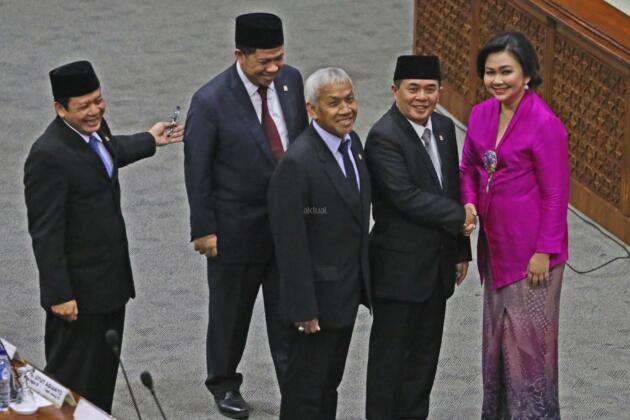 Ketua DPR Ade Komaruddin didampingi Wakil Ketua DPR Agus Hermanto, Fachry Hamzah dan Taufik Kurniawan memberikan ucapan selamat kepada Anggota PAW Alfia Reziani pada penutupan sidang Paripurna ke-22 masa sidang III Tahun 2015-2016 di Komplek Parlemen Senayan, Jakarta, Kamis (17/3). Penutupan Masa Persidangan III Tahun Sidang 2015-2016. Didahului dengan Pelantikan Anggota Pengganti Antar Waktu DPR RI Alfia Reziani menggantikan Politikus PDI Perjuangan Puan Maharani yang saat ini menjabat sebagai Menko Pembangunan Manusia dan Kebudayaan. FOTO: AKTUAL/JUNAIDI MAHBUB